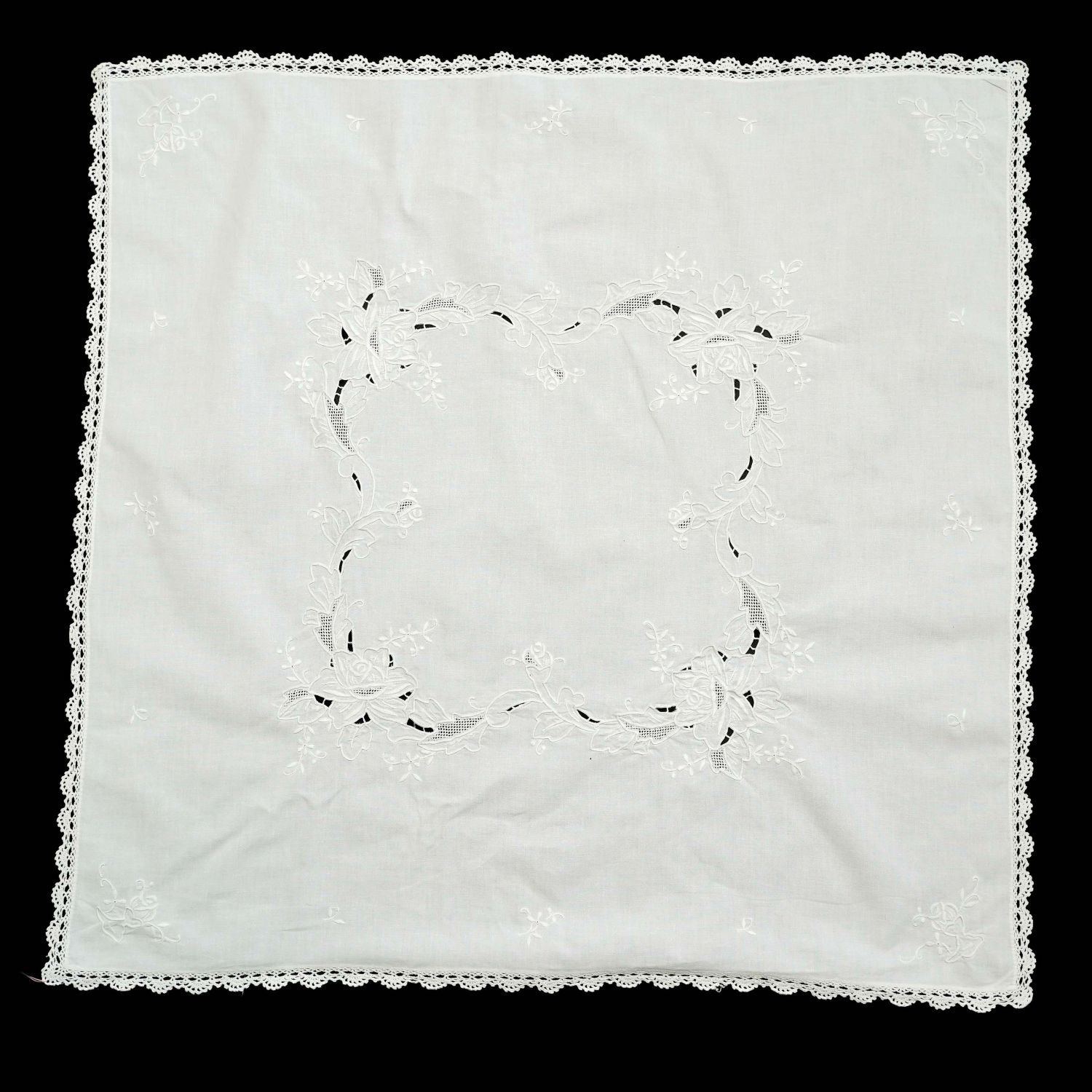 PŁÓTNO HAFT W RÓŻE AŻURKI I KORONKA SZYDEŁKOWA ŚLICZNY OBRUS 80 X 80 CM