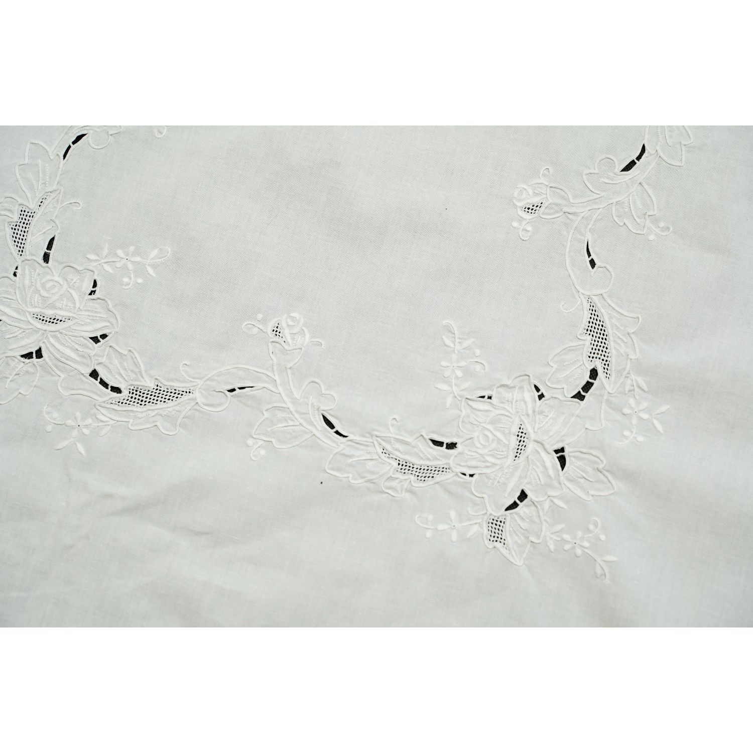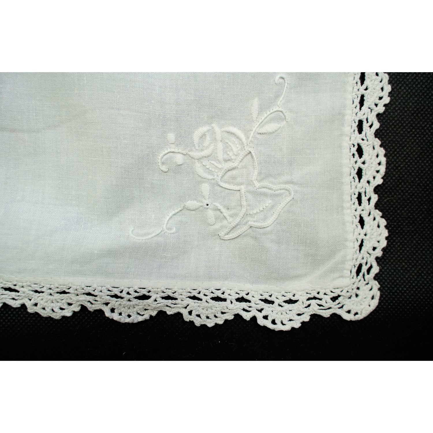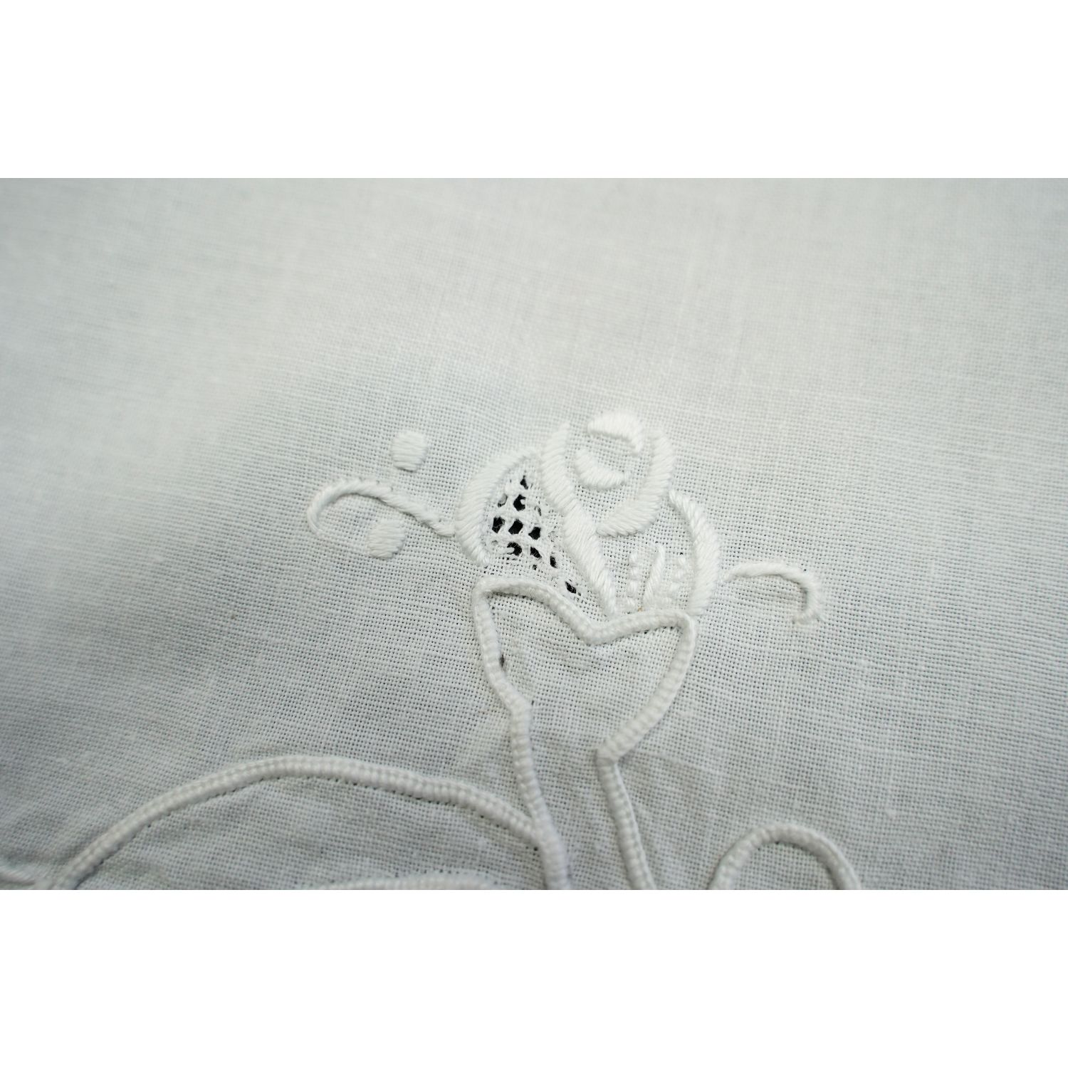 Wykonany z białej tkaniny płóciennej. Na tkaninie hafty w róże z ażurowymi elementami. Dookoła krawędzi szydełkowa koronka