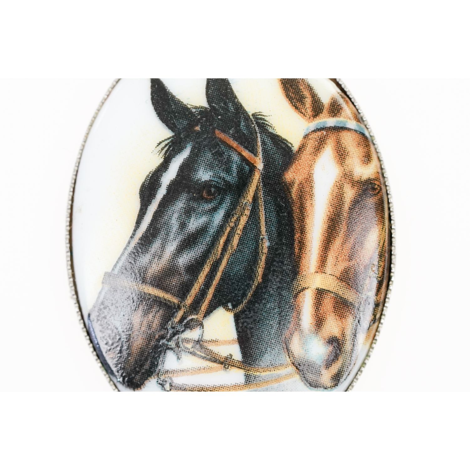 Porcelana biała o owalnym kształcie. Od frontu dekoracją przedstawiającą dwa koniki.