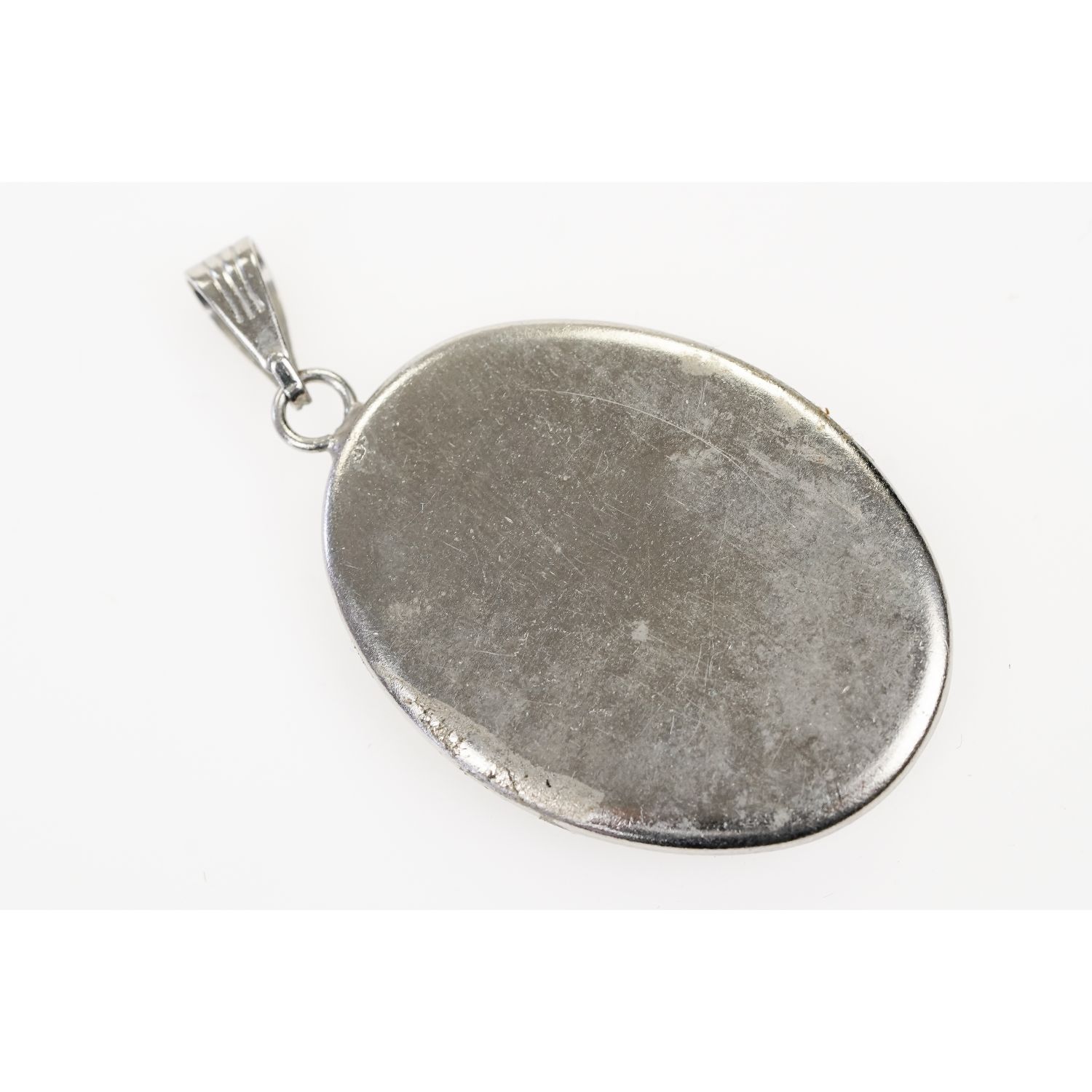 Piękna, stara, porcelanowa brosza zakuta w metal w srebrnym kolorze.