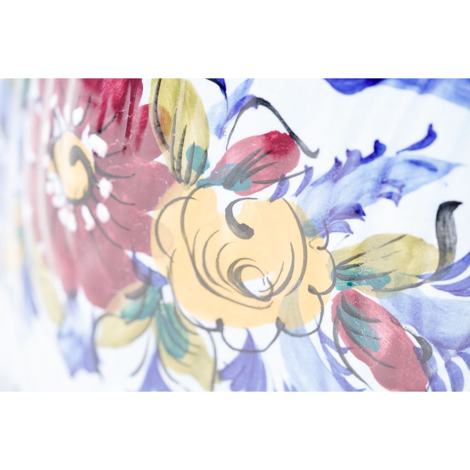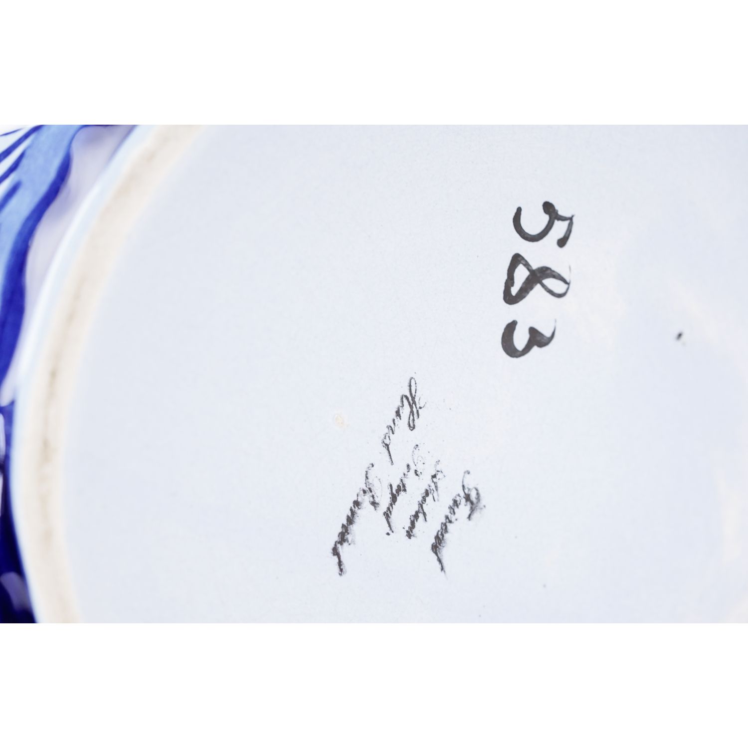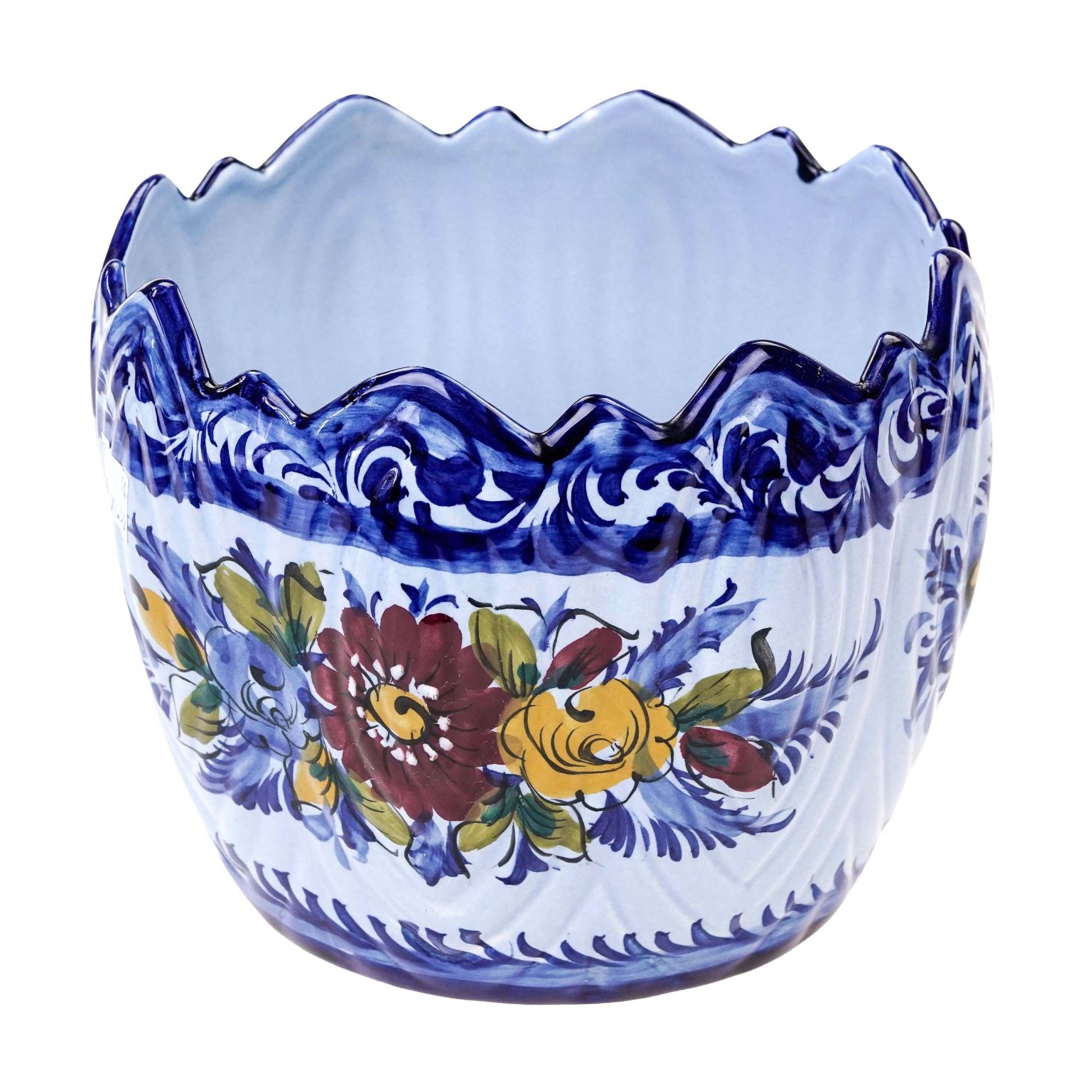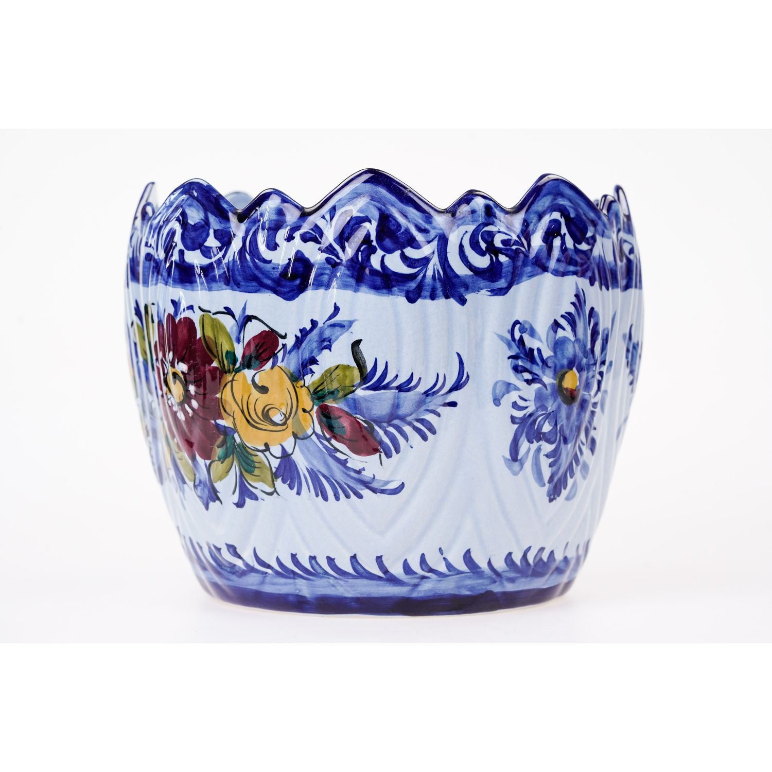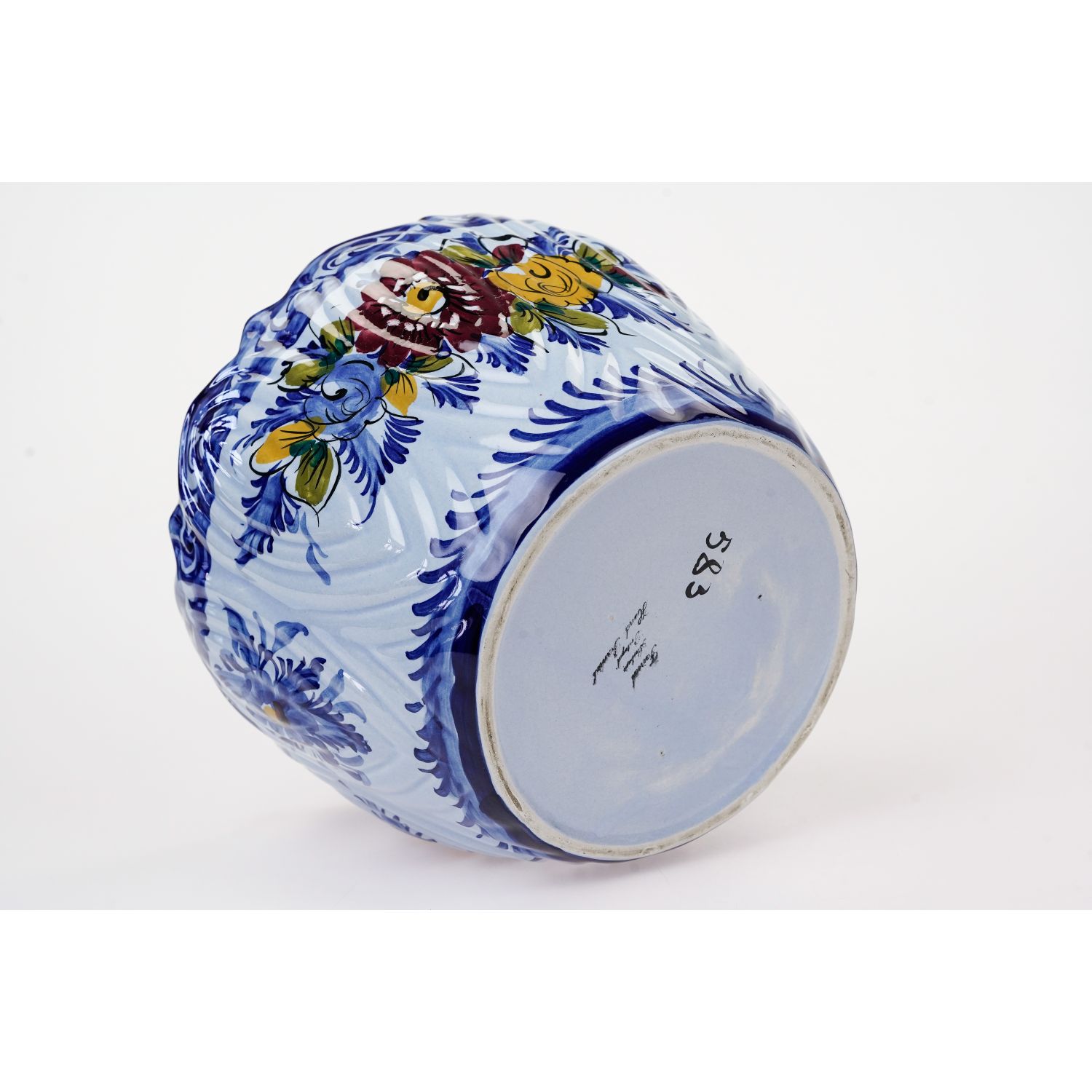 Pochodzi z Portugalii. Sygnowana od spodu "Made in Portugal". Wykonana z glinki. Całość w kolorze błękitnym z kobaltowymi konturówkami. Na donicy medaliony z kwiatami. Co drugi bukiet wielobarwny, ręcznie malowana. Świetnie wygląda.