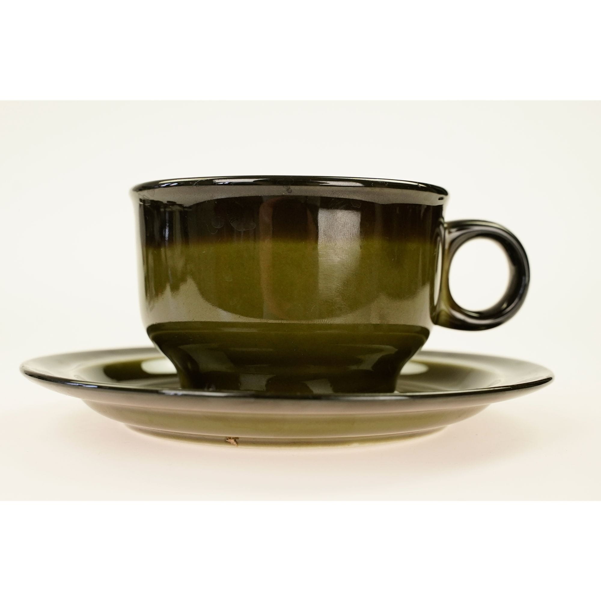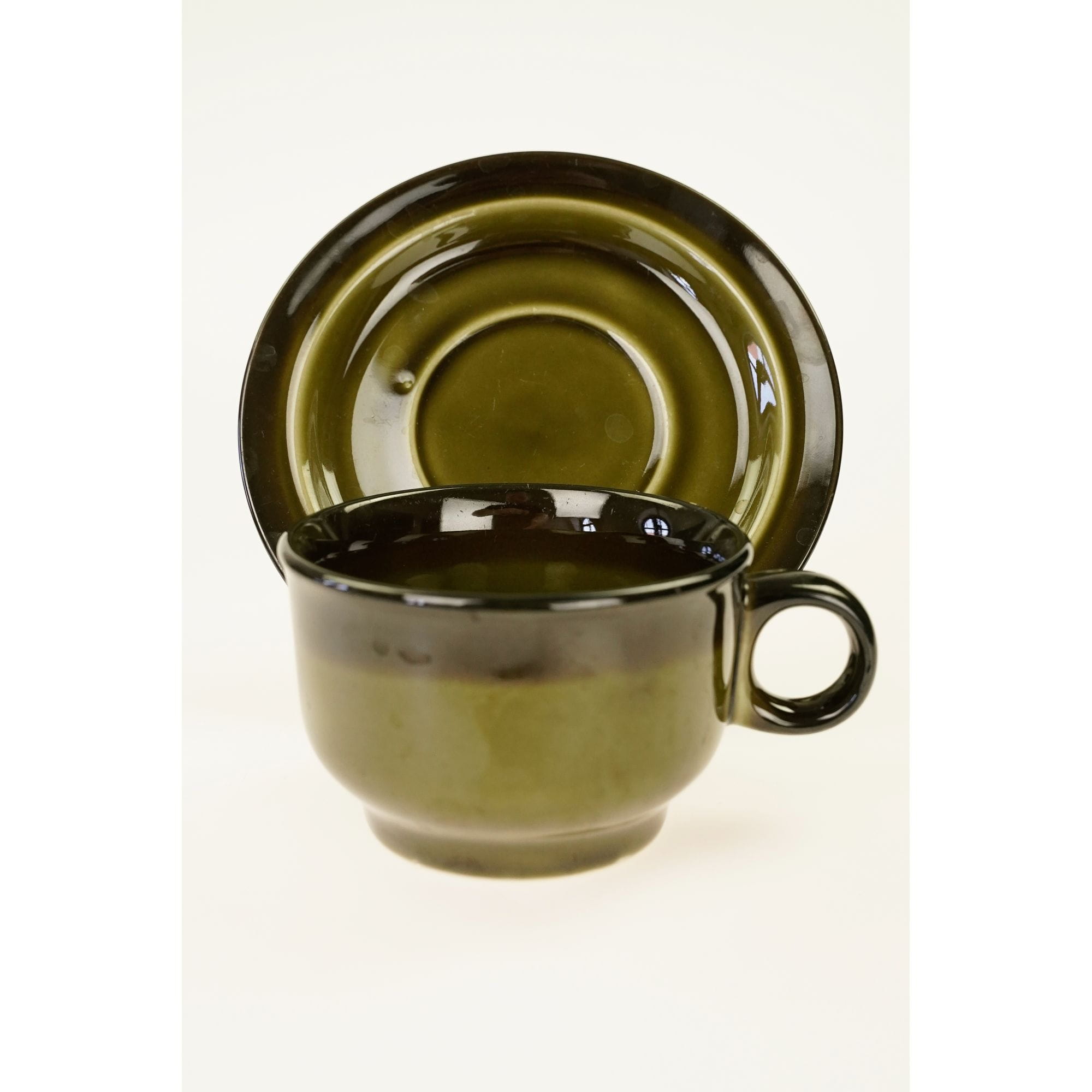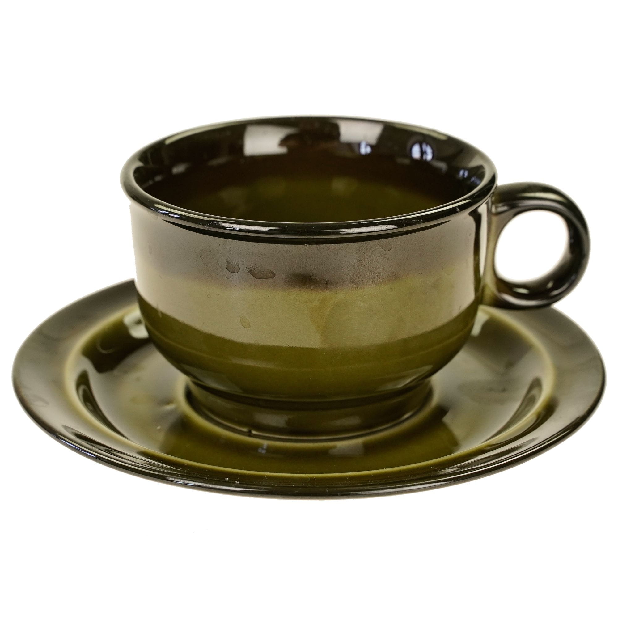 Spora, oliwkowa filiżanka ze spodkiem.