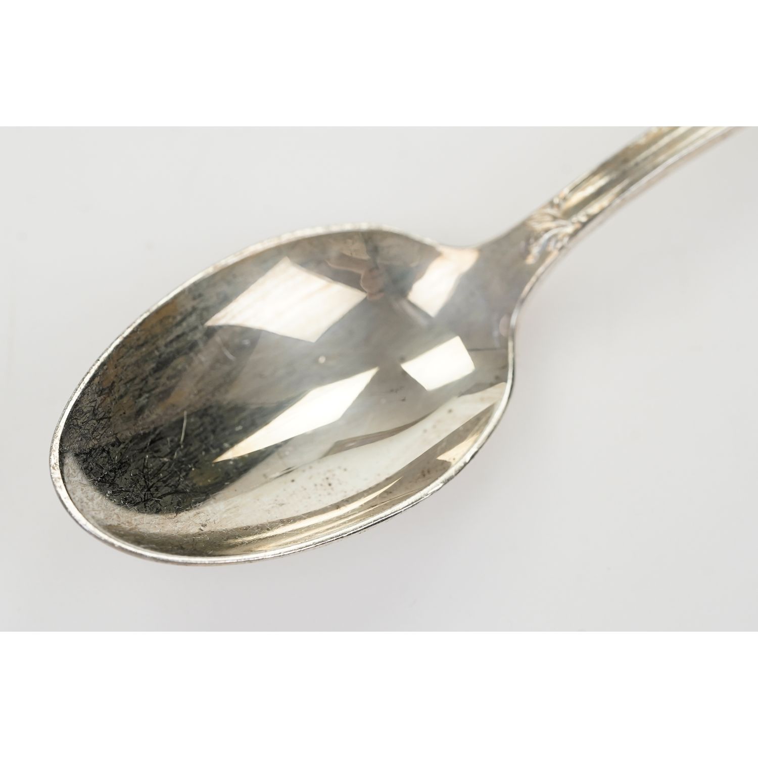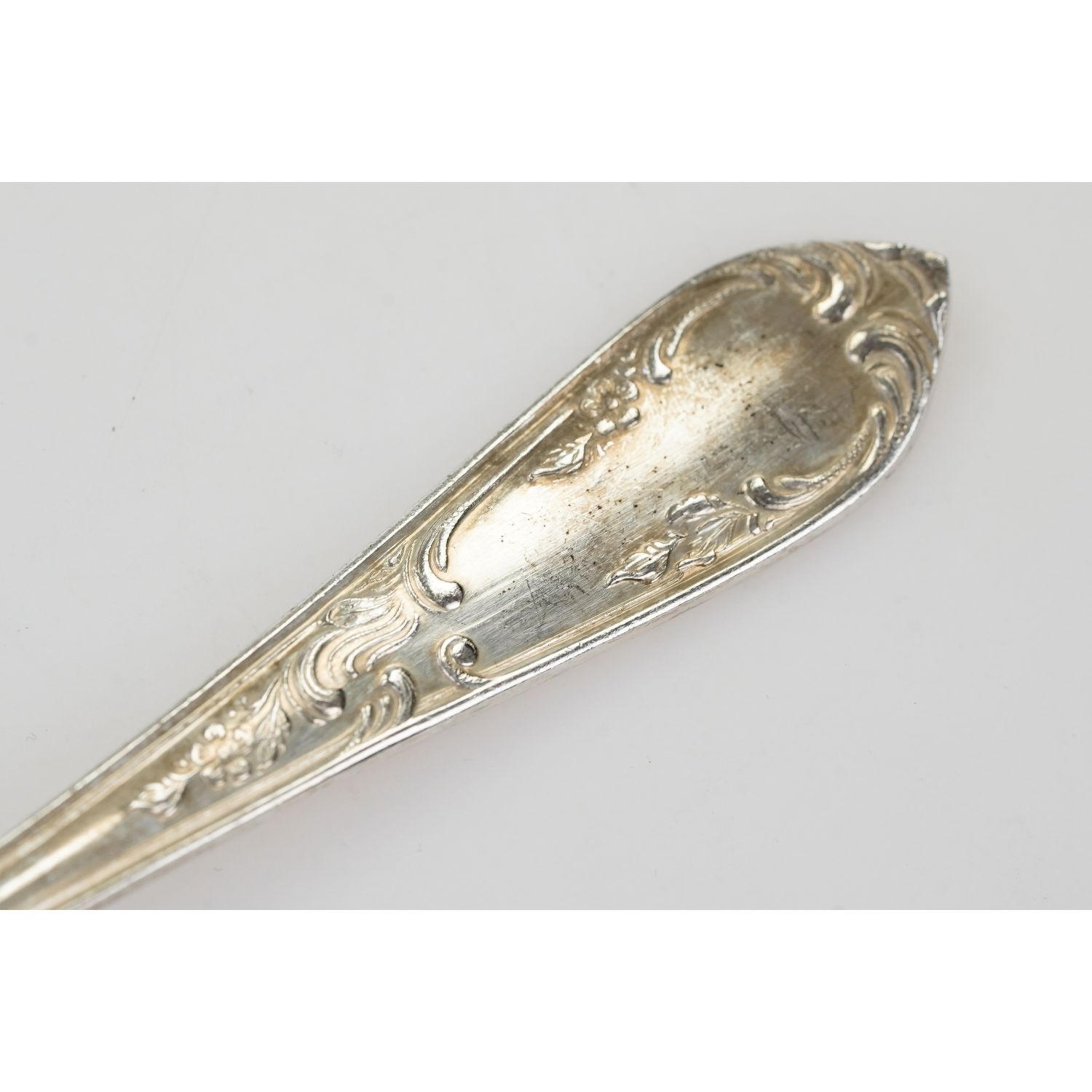 Pochodzi z Niemiec. Sygnowane "R.S.". Srebrzone 100-tką. Trzonki na szczycie zaoblony muszlą zwieńczeniem w stylu Ludwika XV wzorem rocaille z motywem roślinnym z drobnymi kwiatkami. Dekoracja z obu stron. Całość introligatorskim pudełku.