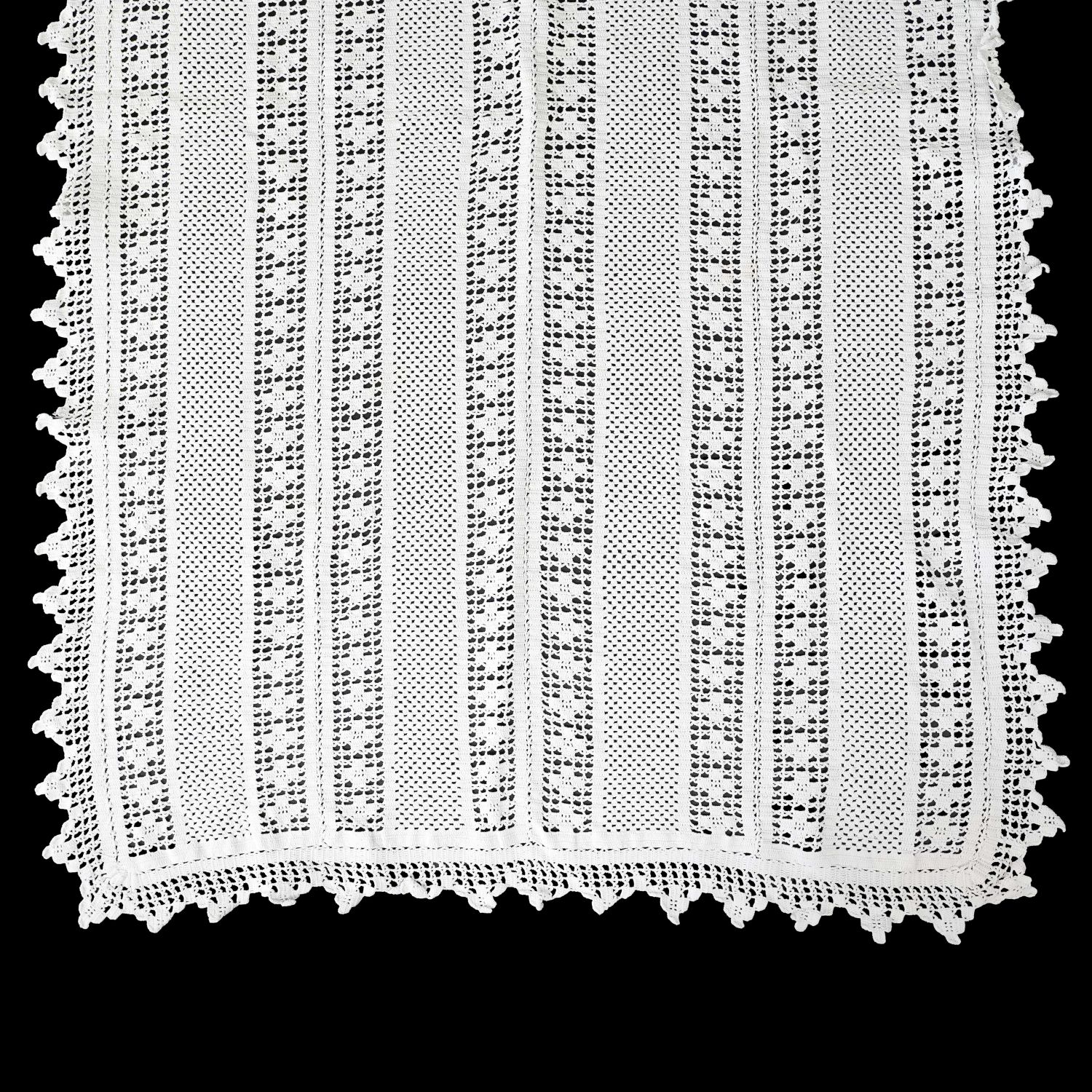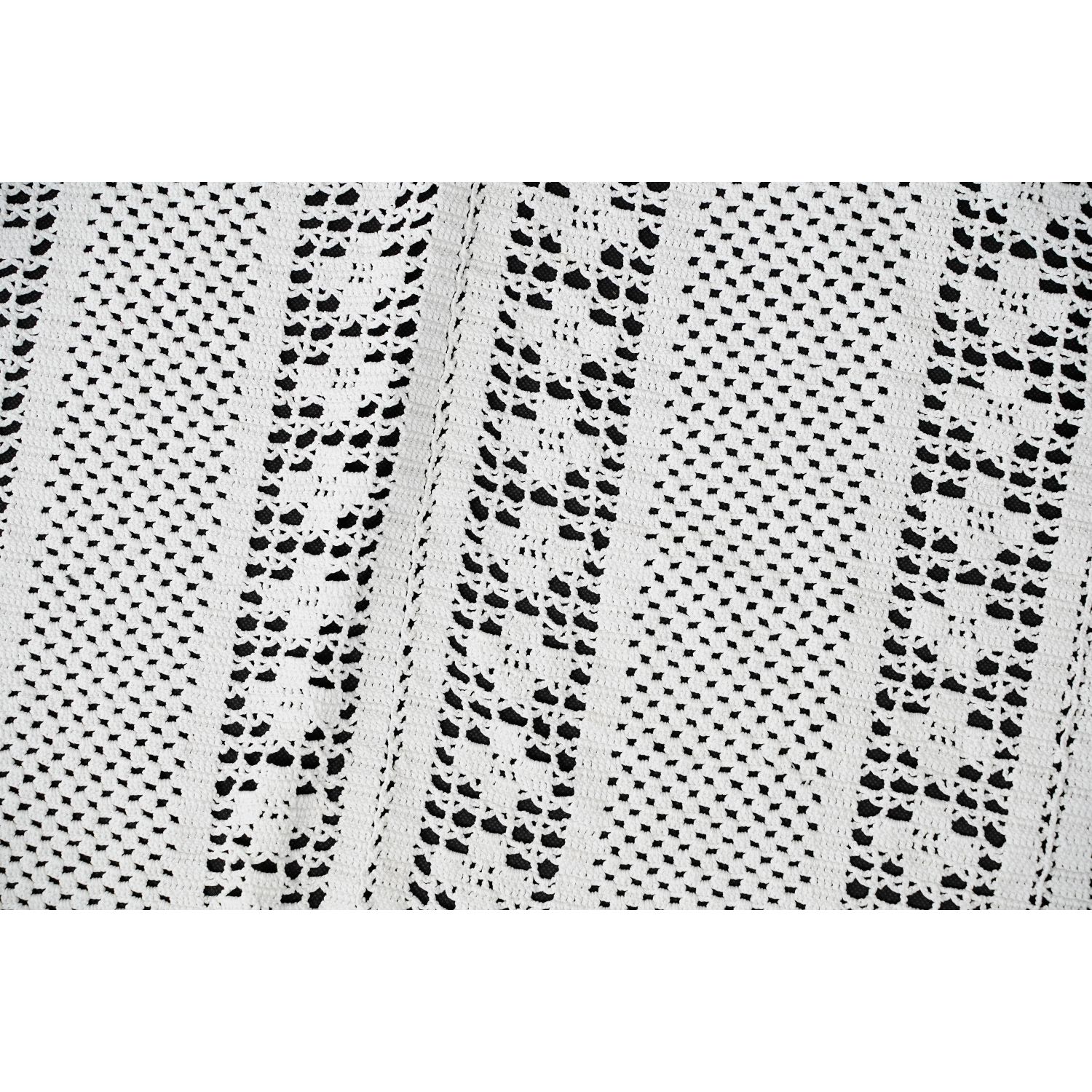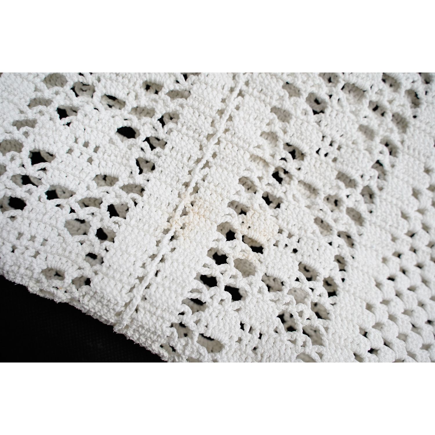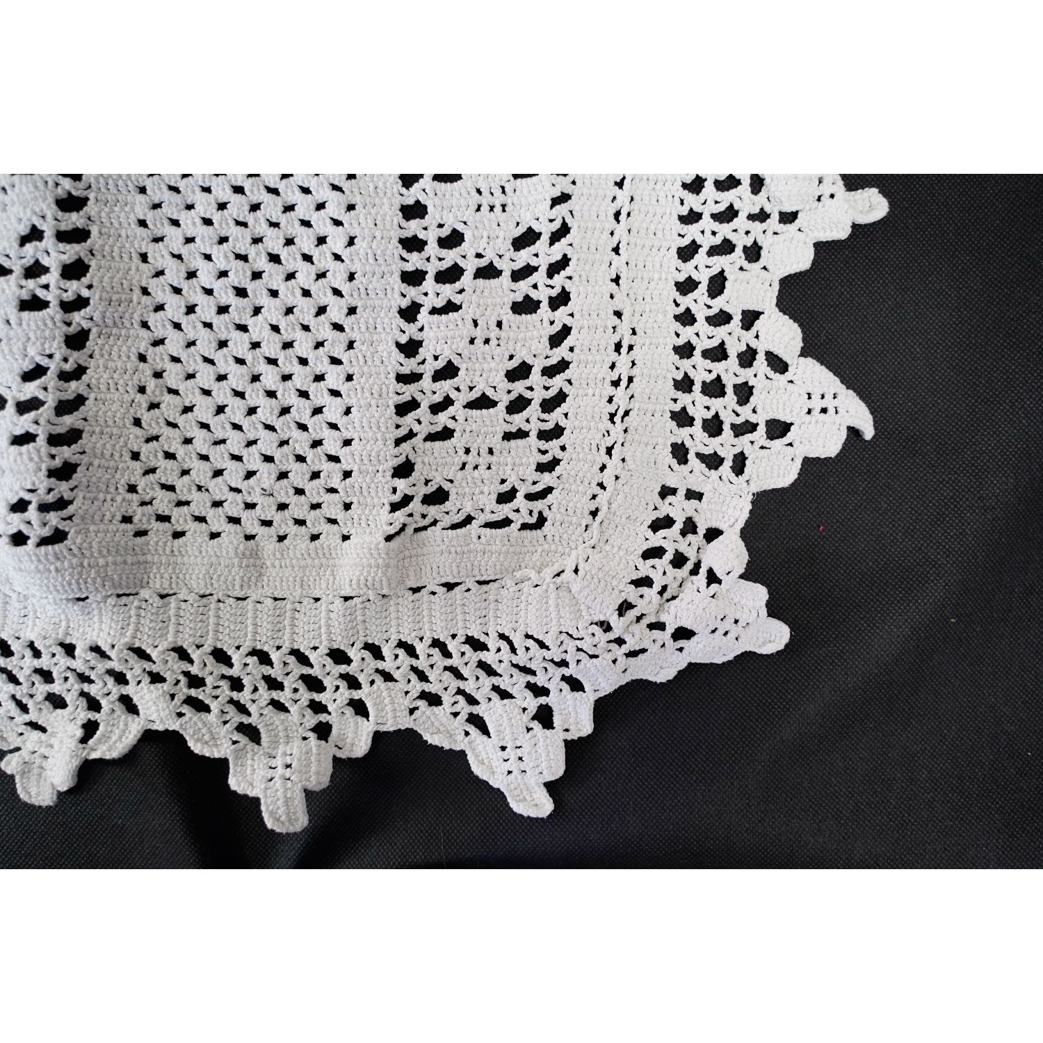 Wykonany z bawełnianej, dość mięsistej nitki, z jakimś dodatkiem w odcieniu bieli na szydełku. Wzór piękny, bogaty geometryczny. Krawędzie wykończone zębami.