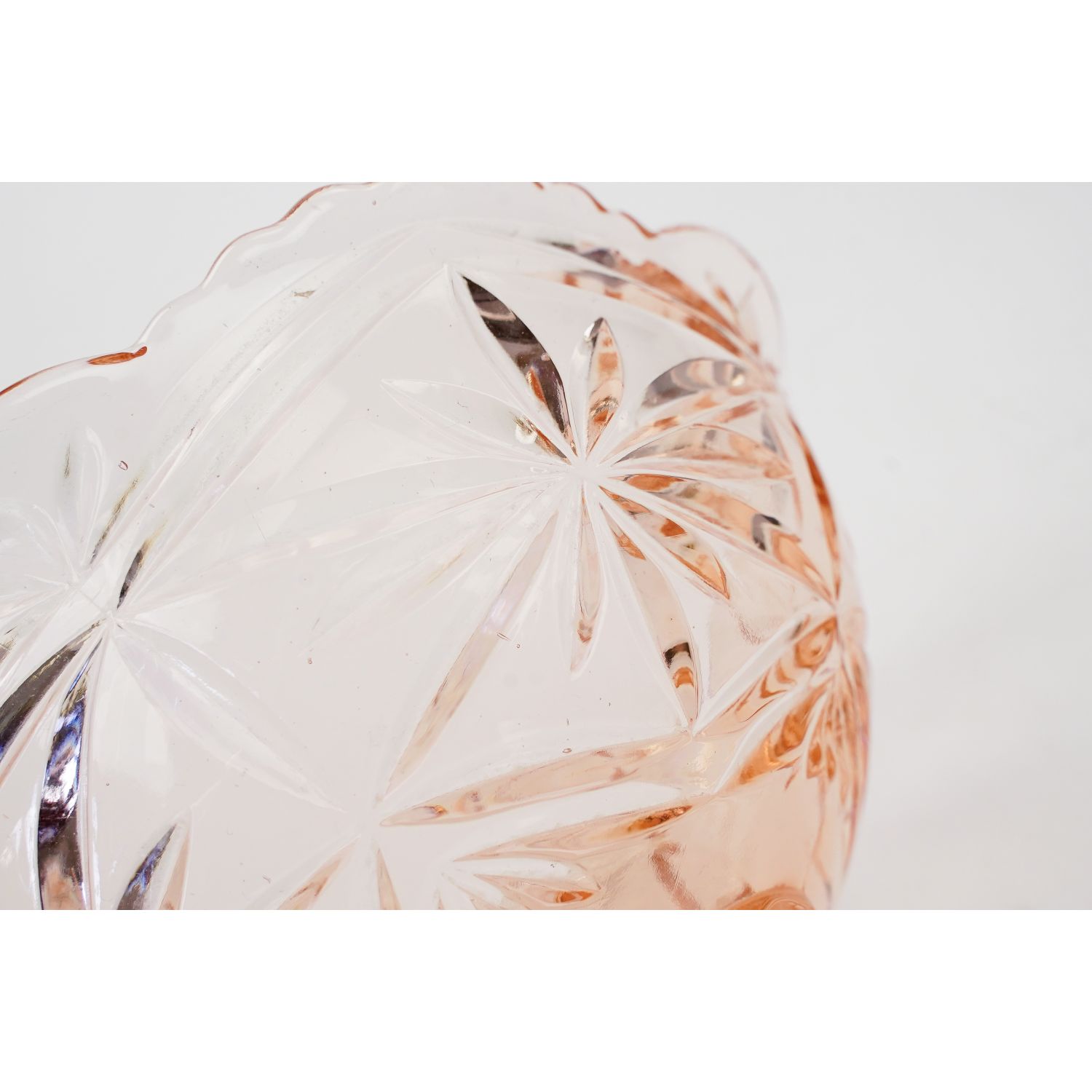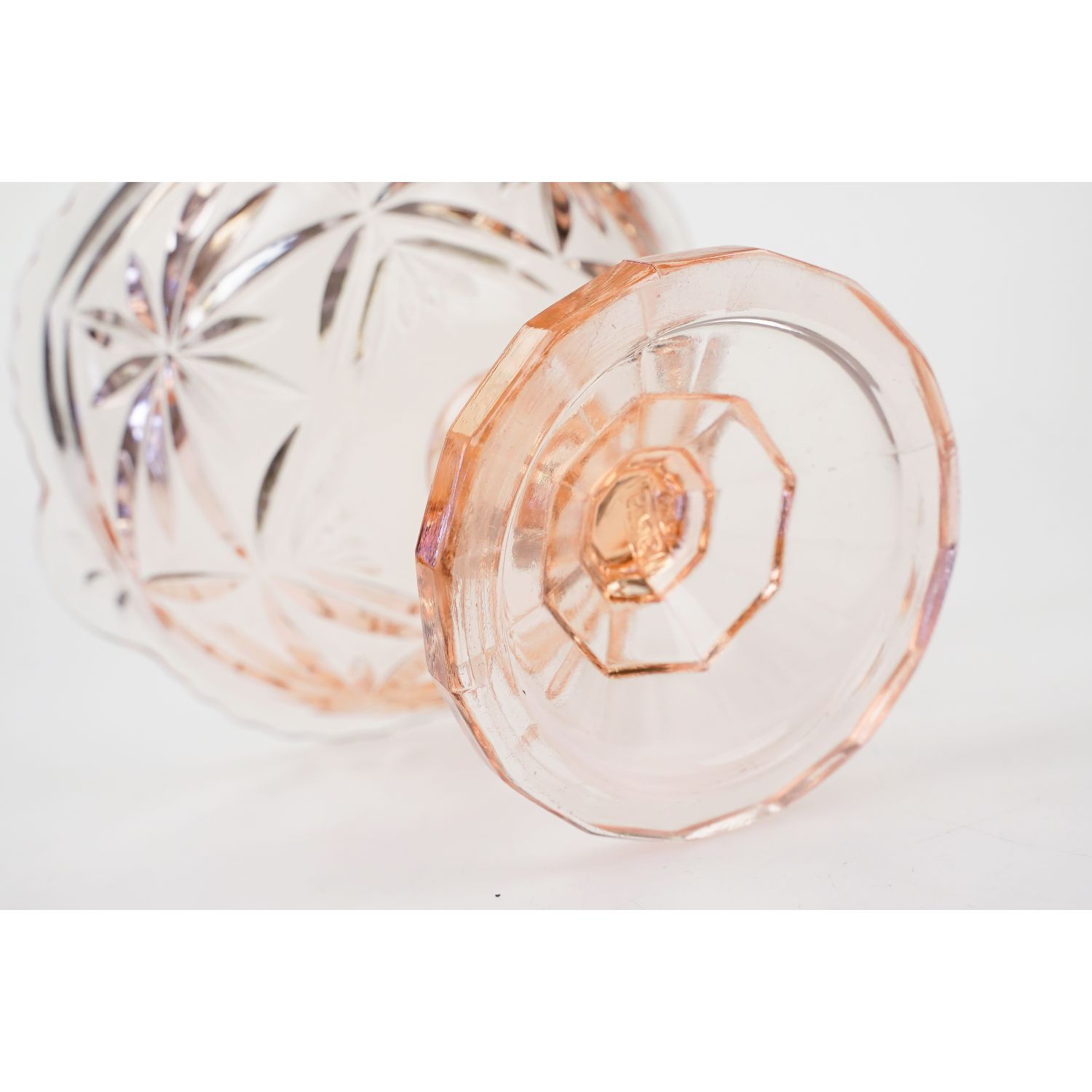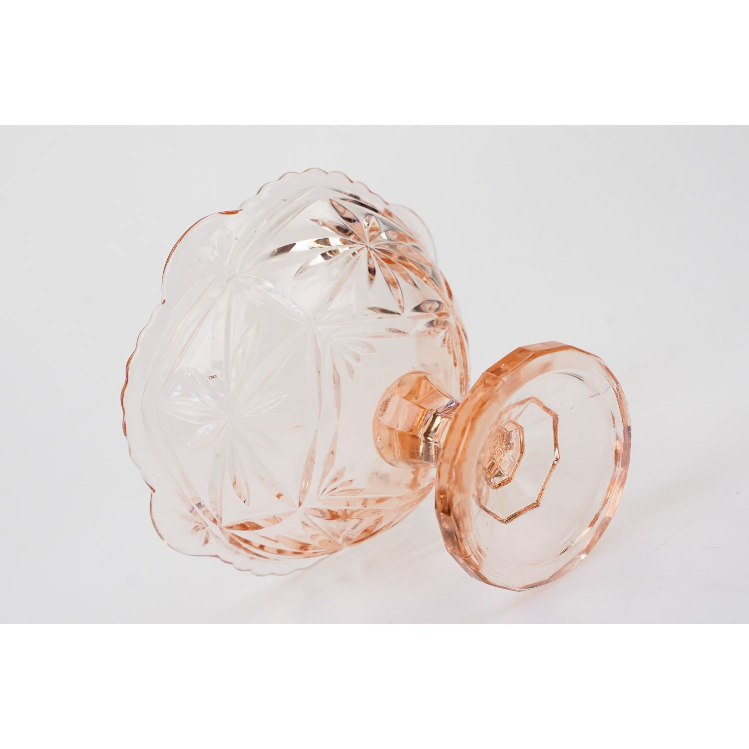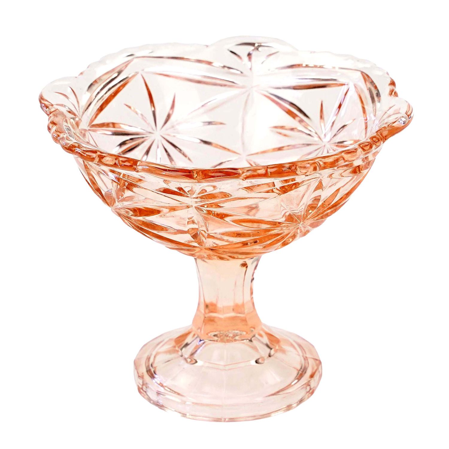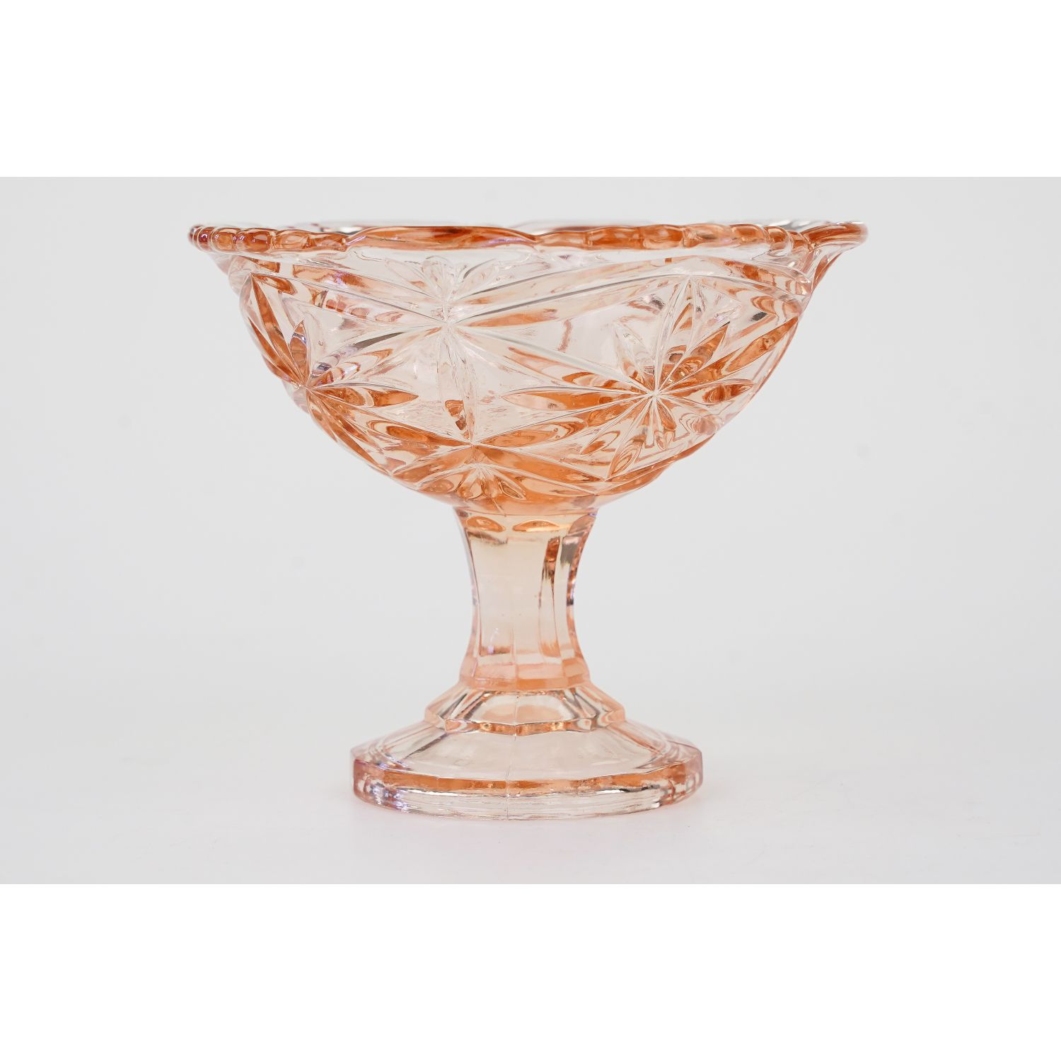 Sygnowana Rastal (Niemcy), lata 80-te. Bardzo ładna forma. Szkło prasowane, w kolorze różowo-łososiowym. Cała powierzchnia czaszy bogato zdobiona z gwiazdami. Noga i stopa graniaste. Ślicznie wygląda!
