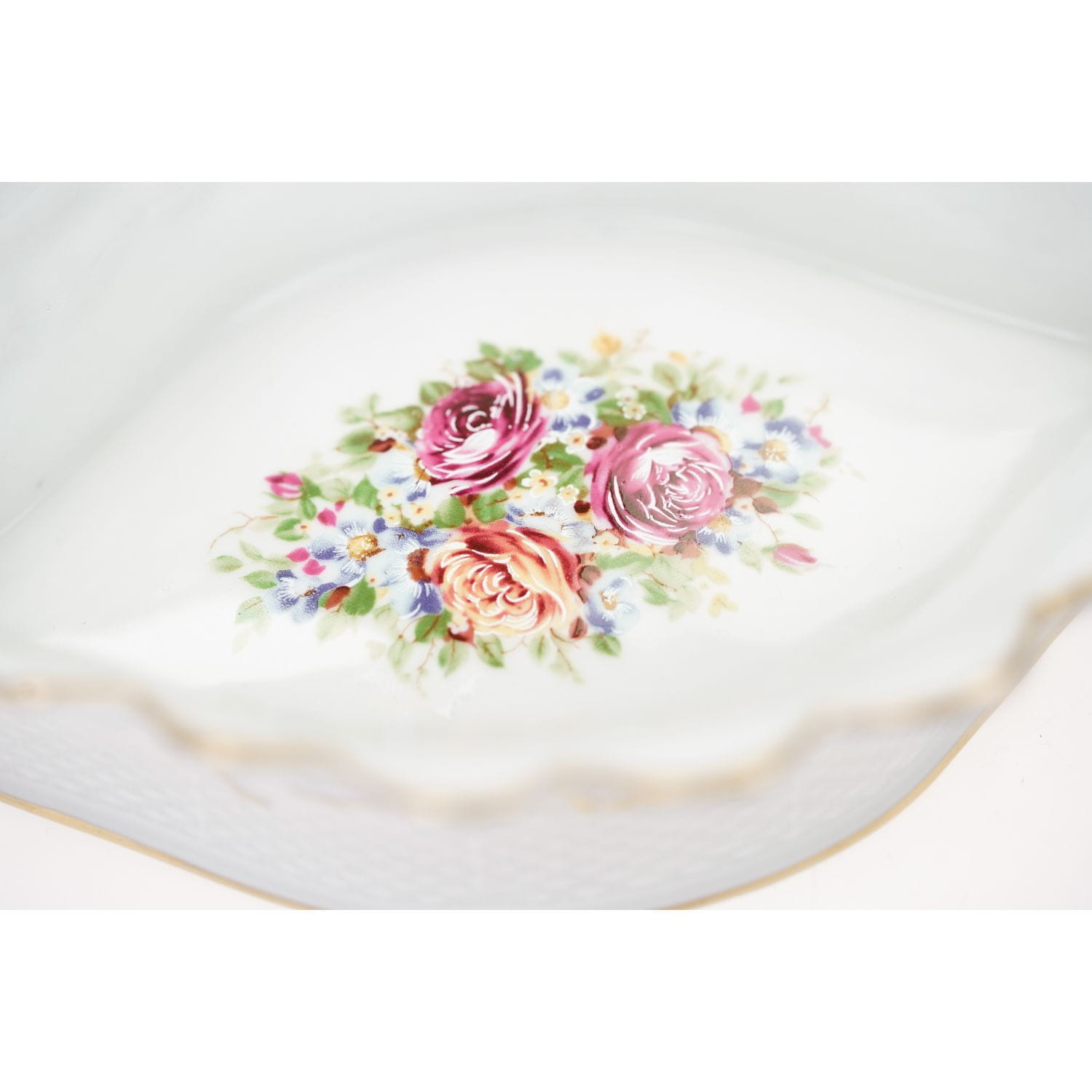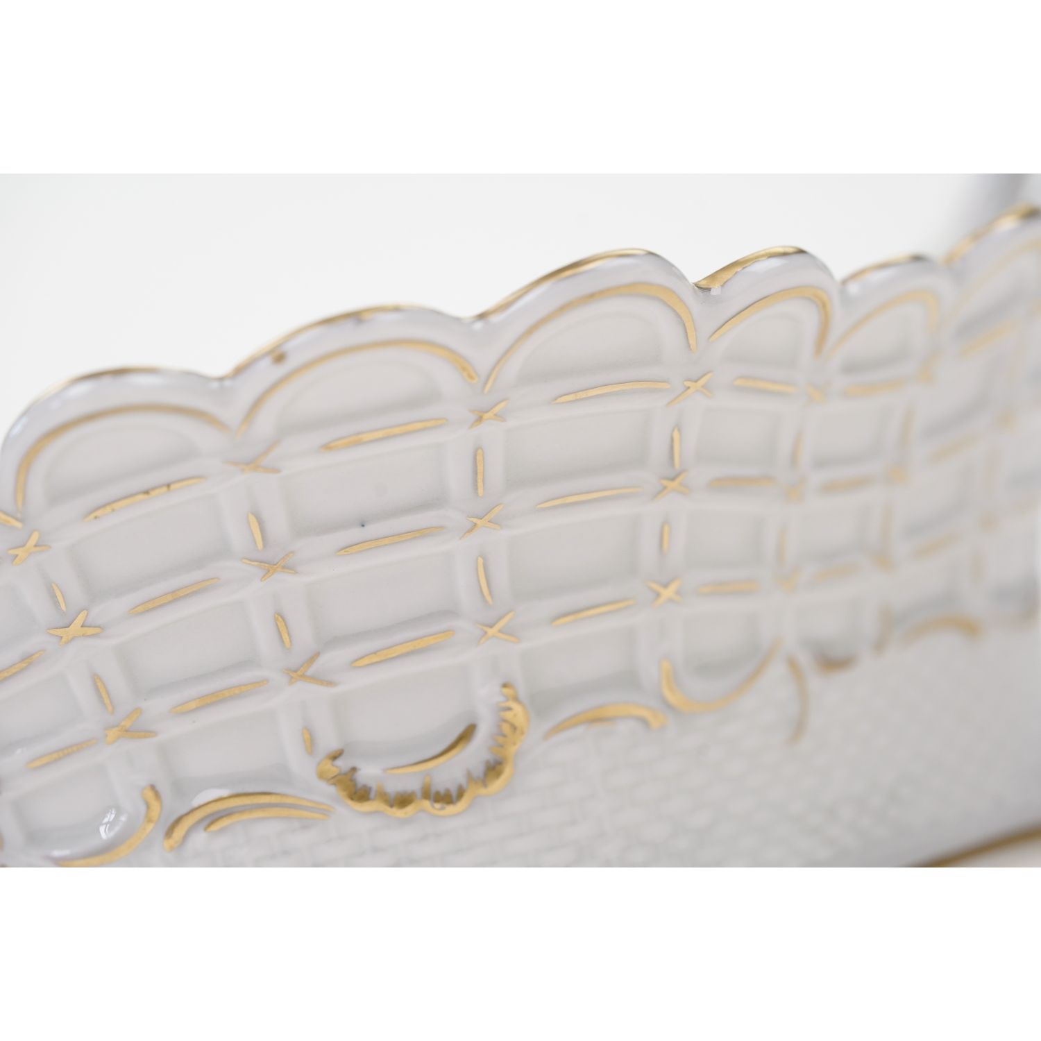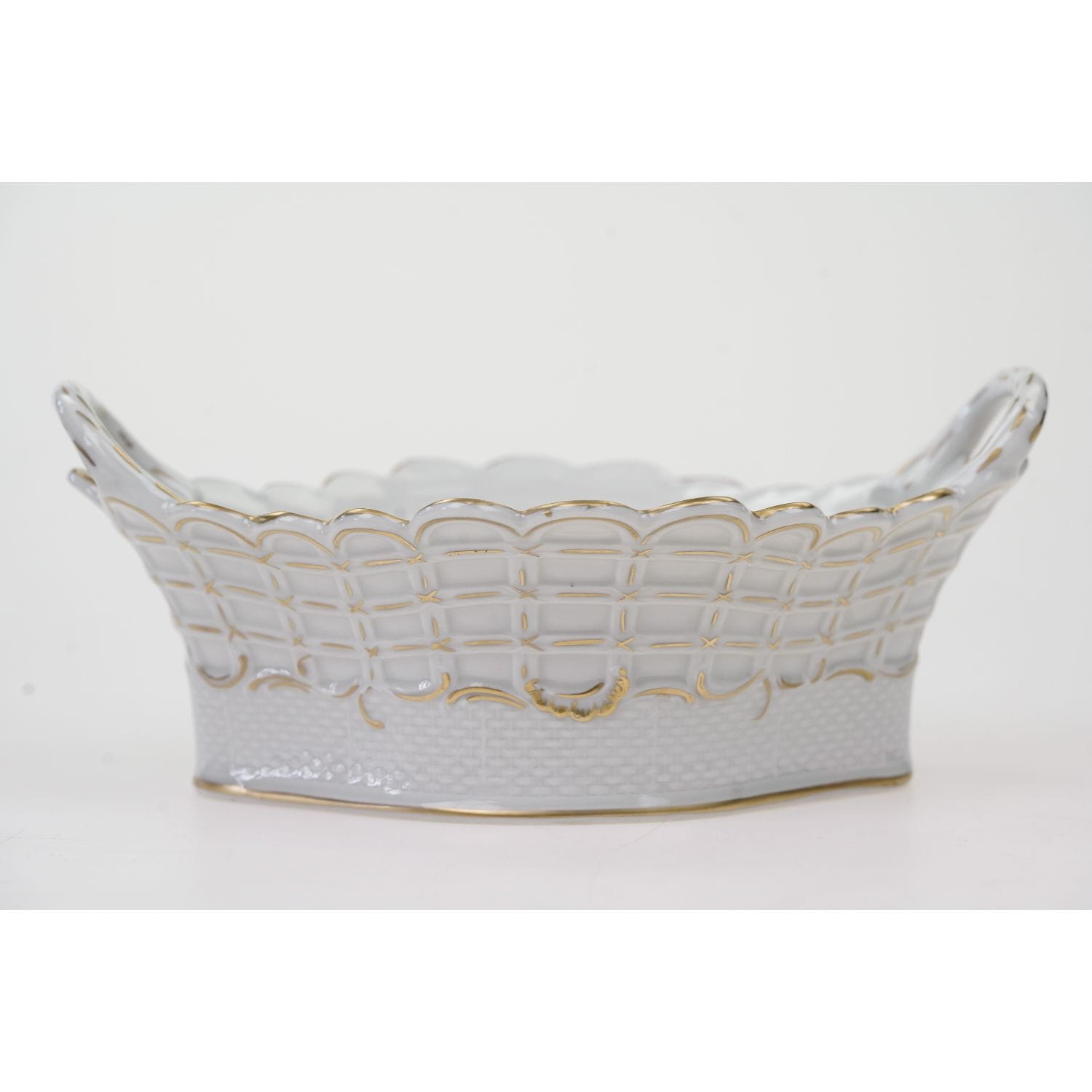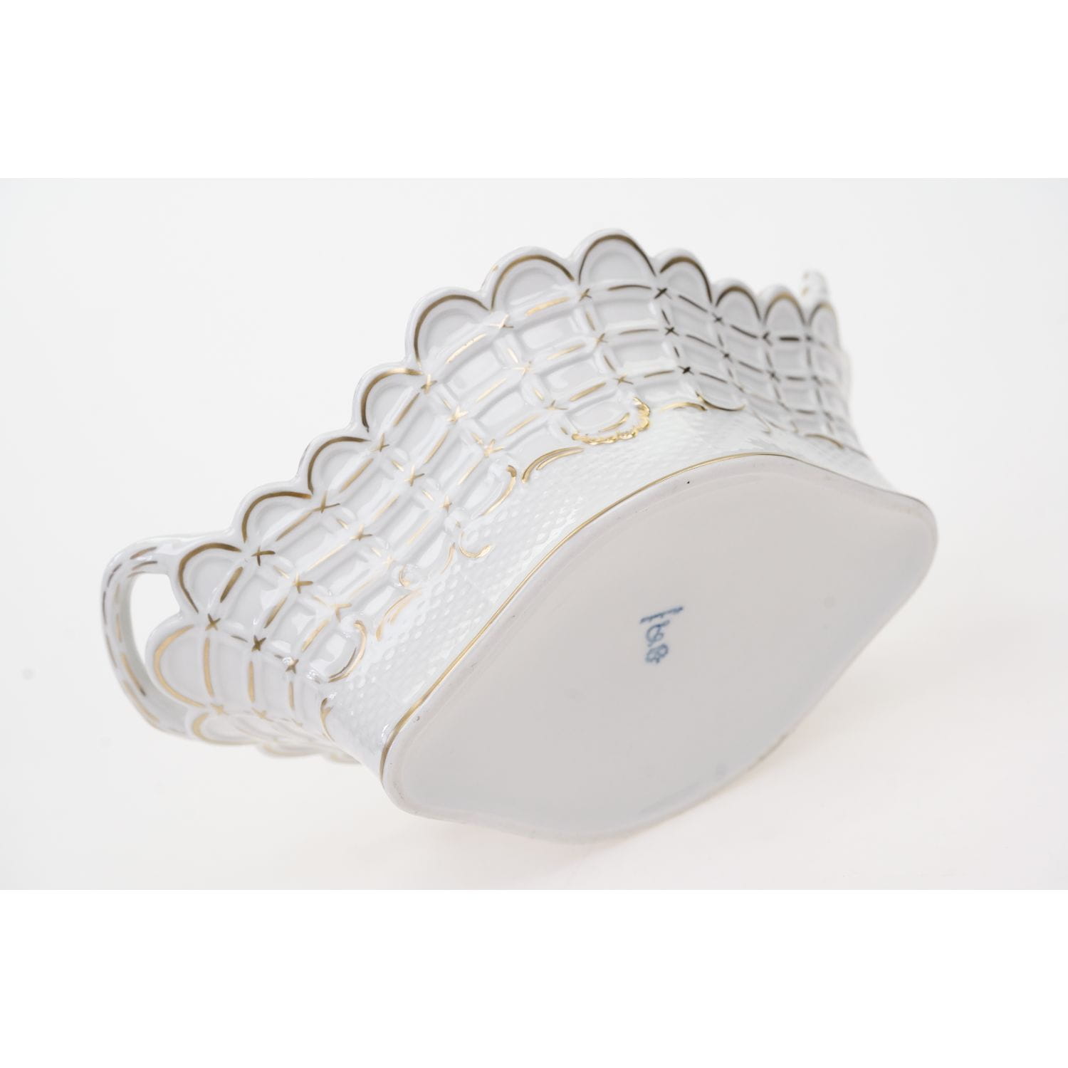 Pochodzi najprawdopodobniej z Drezna. Sygnowany jak na zdjęciu. Porcelana biała z reliefami imitującymi plecionkę wiklinowego kosza podkreślonymi ręcznie złoceniami. Z uszami. Na dnie ręcznie malowany bukiet kwiatów.
