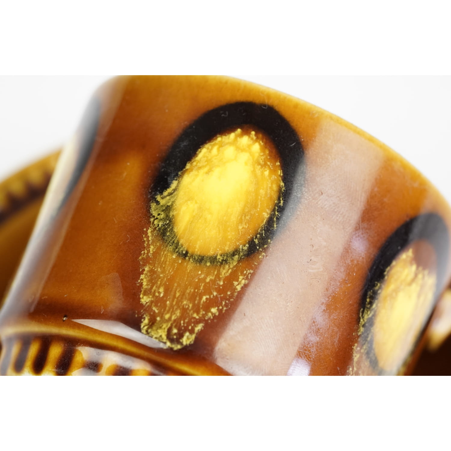 Nie posiada sygnatury. Wykonana z ceramiki szkliwionej w odcieniu miodowym. Z drobnym reliefem przy dolnej krawędzi filiżanki i na brzegu spodka. Na czaszy filiżanki dodatkowo dekoracja w kolorze żółtym i czarnym przypominająca pawie oczka. Spodek bez kolorowych zdobień.
