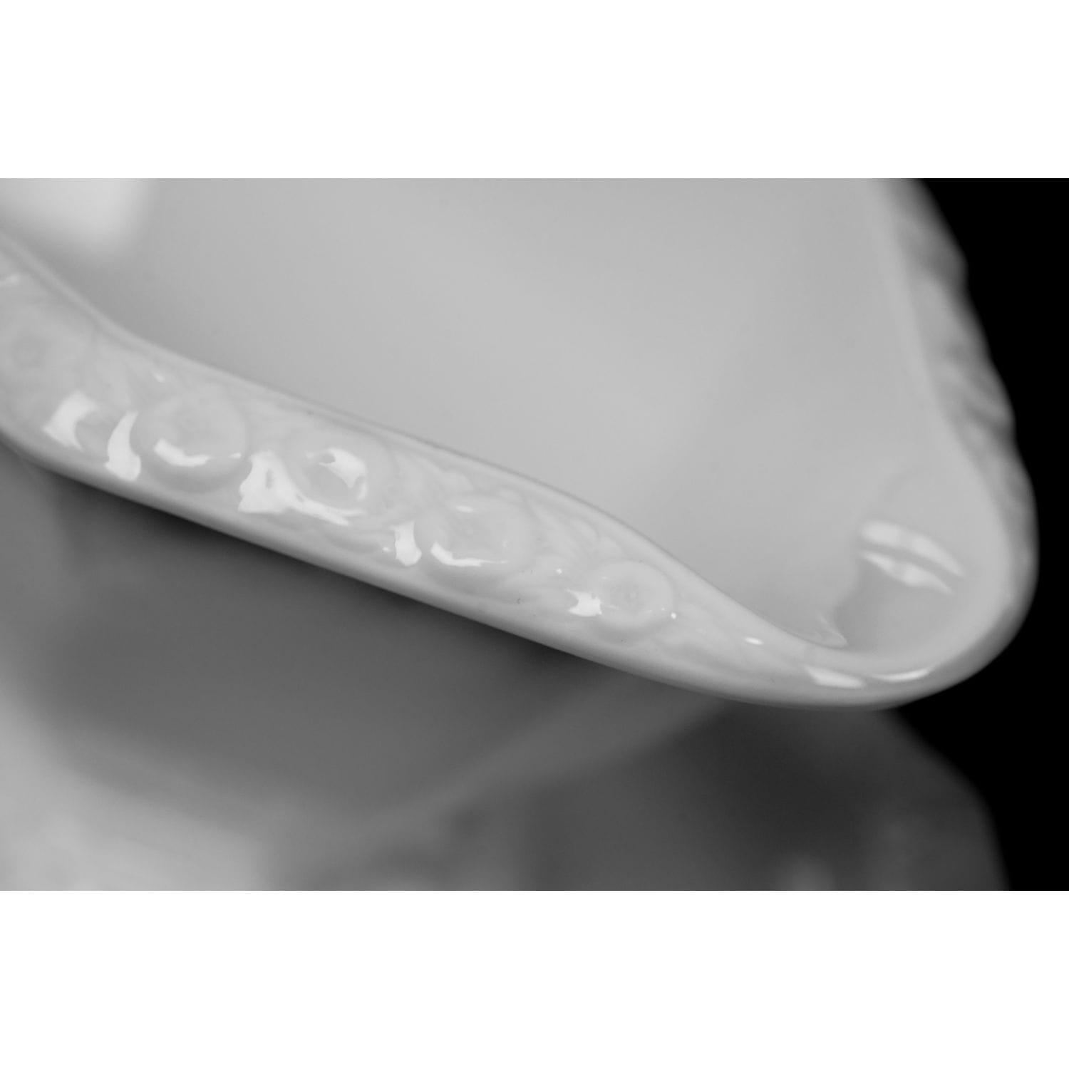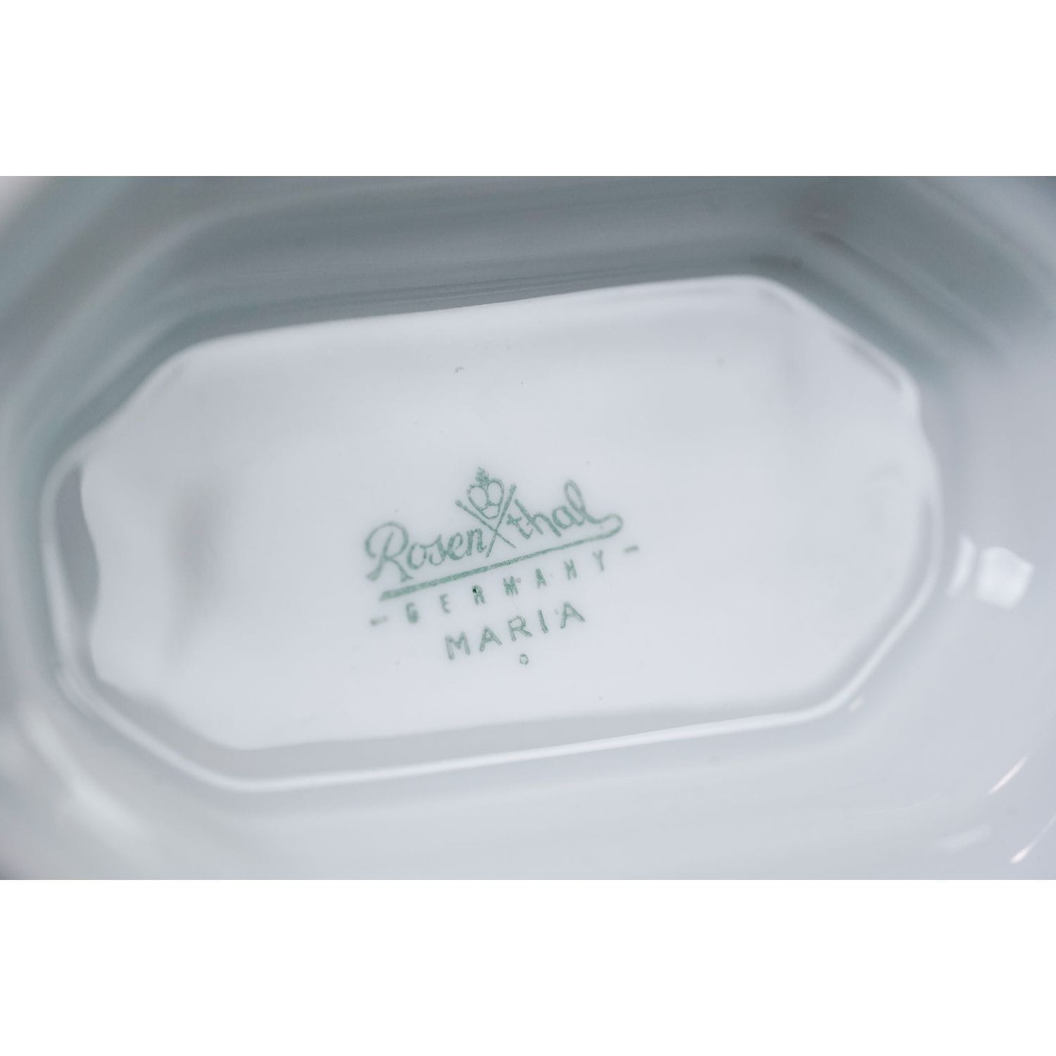 Sosjerka niemieckiej wytwórni porcelany Rosenthal, model Maria. Sygnowana znakiem stosowanym w 1923 roku, model Maria. Z dopiskiem "Modell von Ph. Rosenthal". Graniasta forma z typowymi dla modelu reliefami przedstawiającymi wianuszek kwiatów granatu. Forma jest jedyną dekoracją, porcelana bez złoceń, malatury a więc klasyczna Maria weiß (biała Maria). Wykonana z białej, szkliwionej porcelany sosjerka ma lekko zgeometryzowaną formę osadzona na podstawie. Dekorowana reliefami typowymi dla tego modelu.