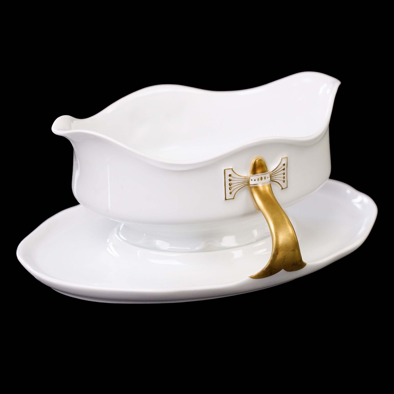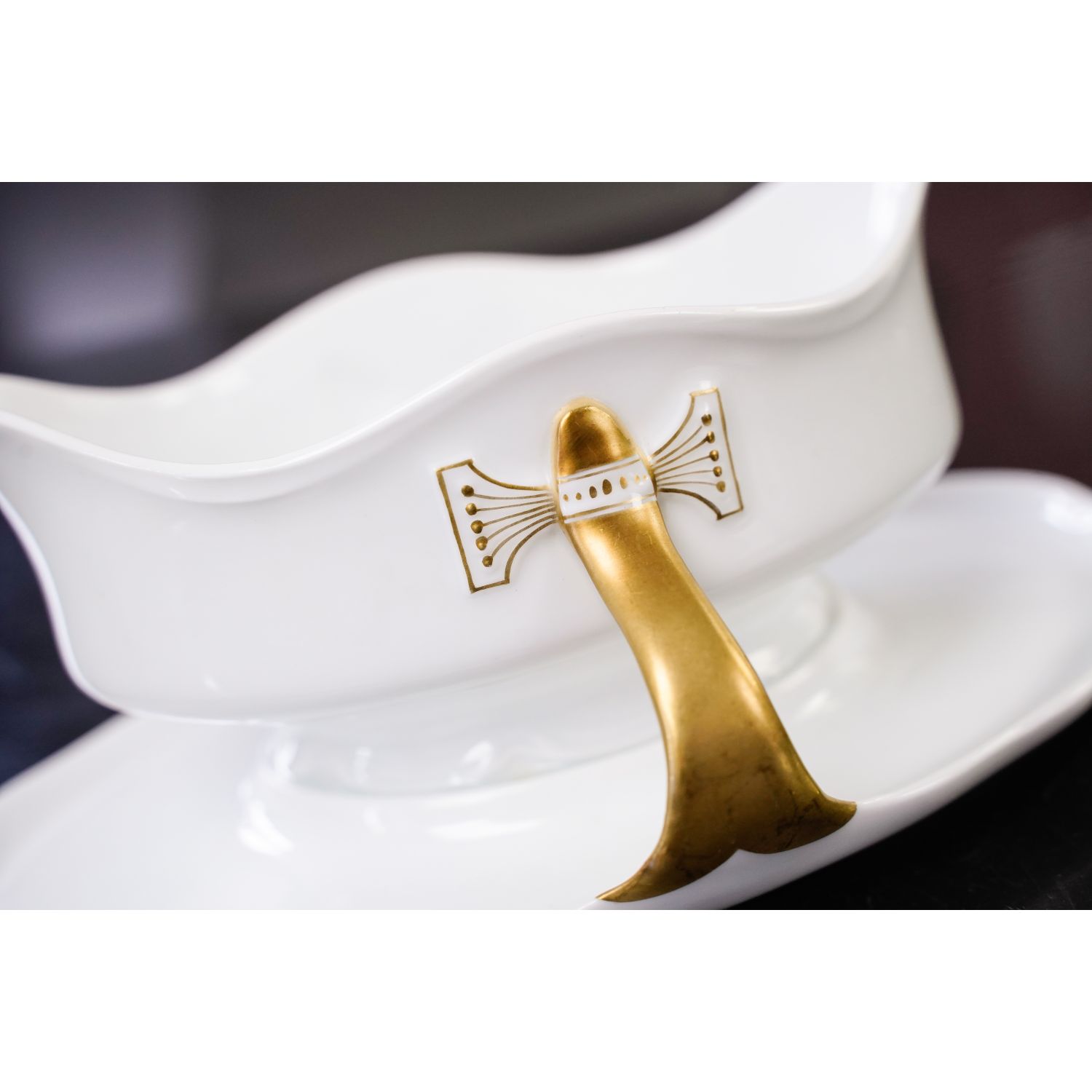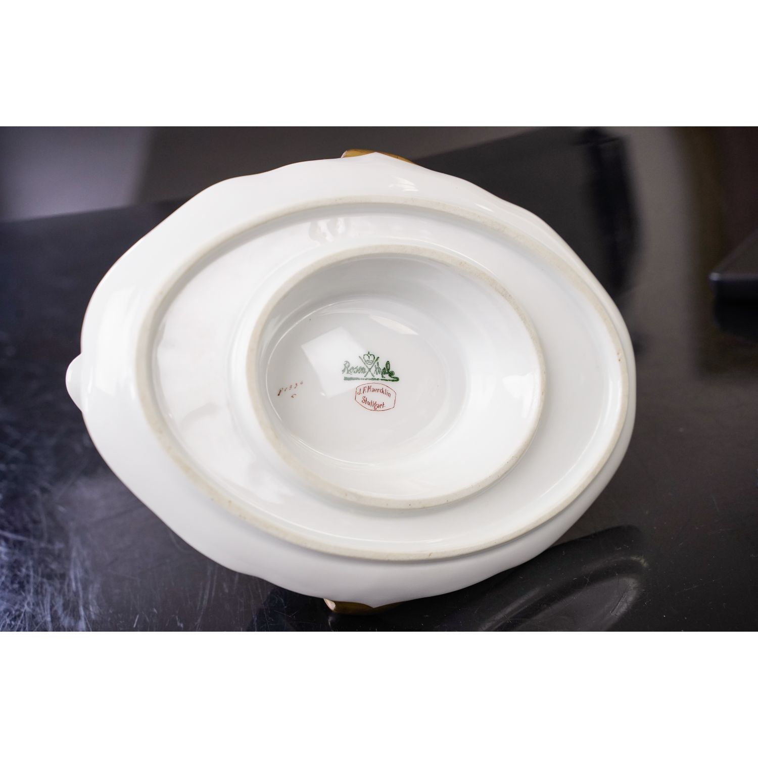 Pochodzi z wytwórni porcelany Philippa Rosenthala z Selb. Sygnowana znakiem stosowanym w latach 20/30-tych XX wieku. Naczynie ma formę typową dla epoki. Wykonana z białej porcelany. Dekorowana jedynie złoceniami. Kontury podkreślone złoceniami. Uszy w pełni złocone z kokardkami.
