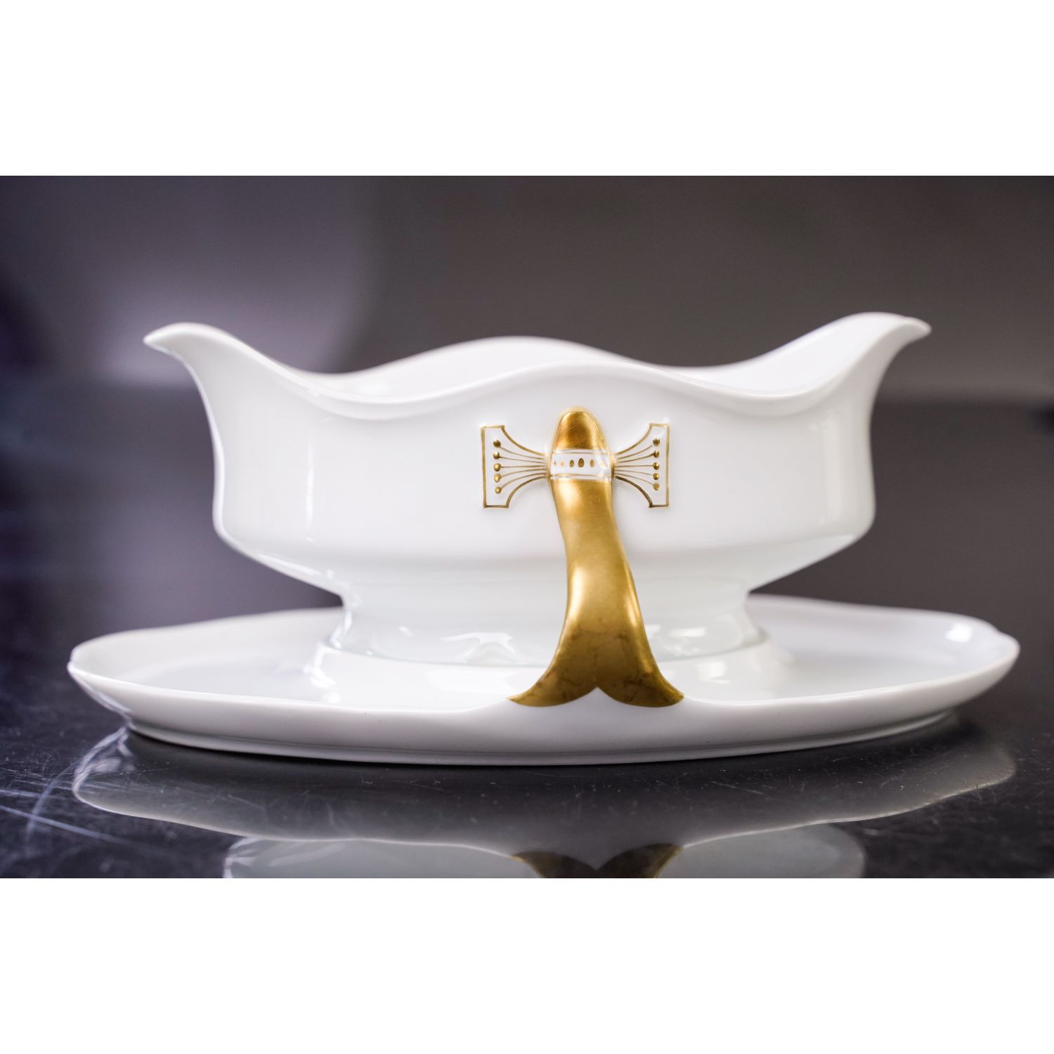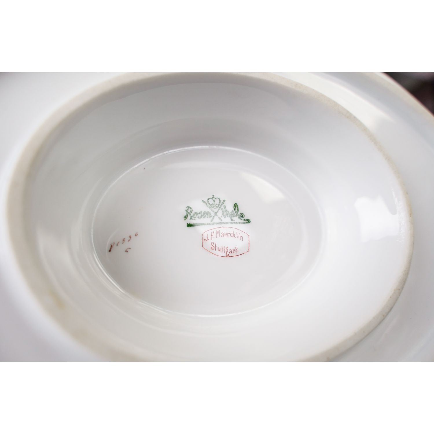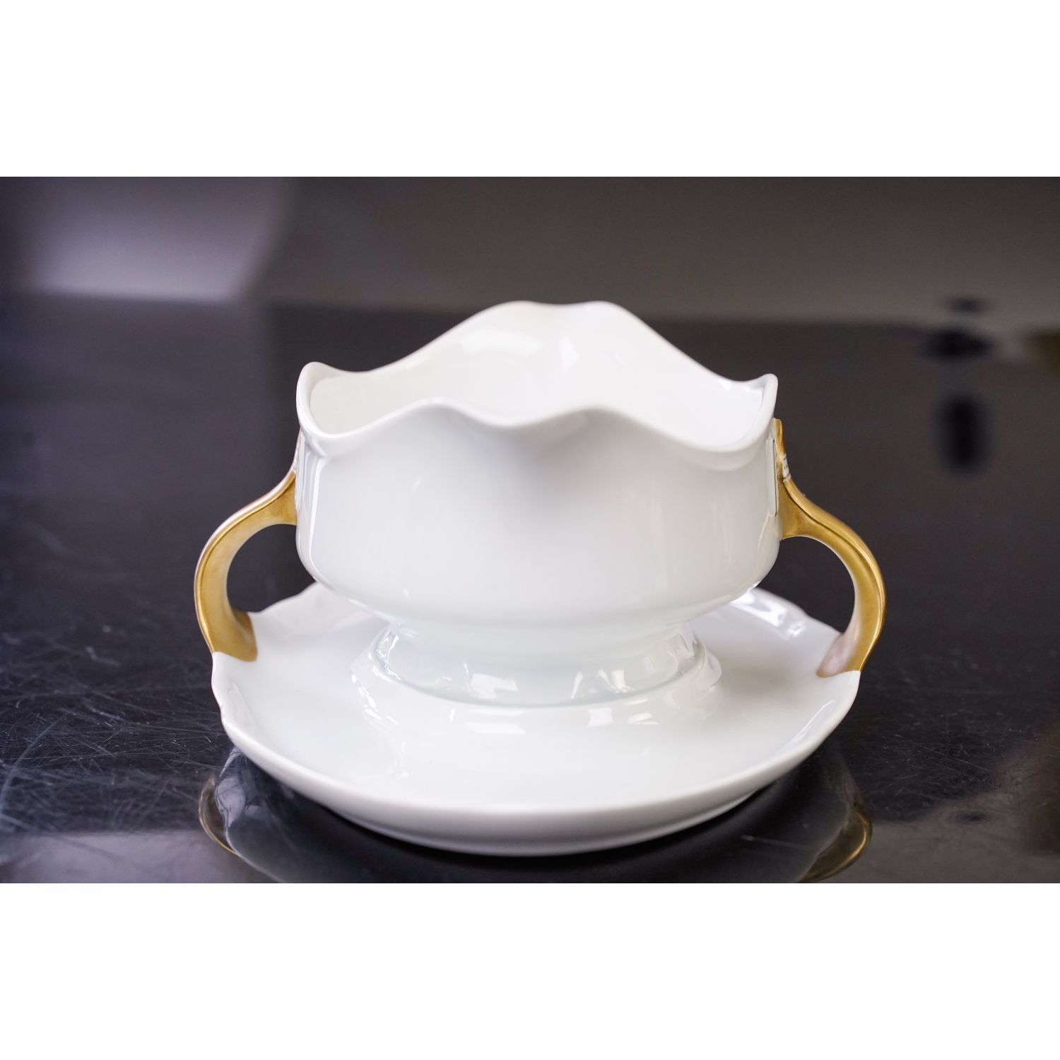 Pochodzi z wytwórni porcelany Philippa Rosenthala z Selb. Sygnowana znakiem stosowanym w latach 20/30-tych XX wieku. Naczynie ma formę typową dla epoki. Wykonana z białej porcelany. Dekorowana jedynie złoceniami. Kontury podkreślone złoceniami. Uszy w pełni złocone z kokardkami.