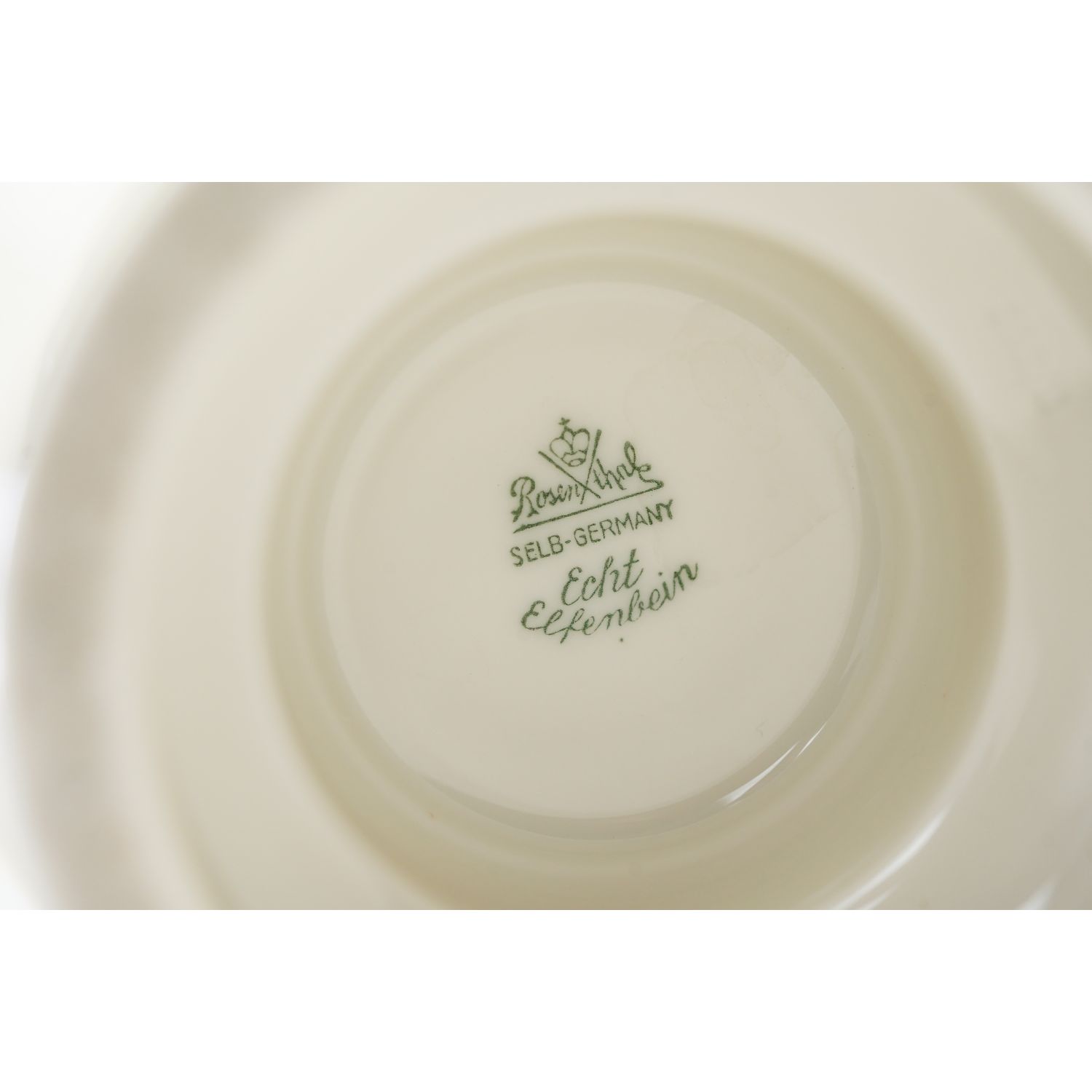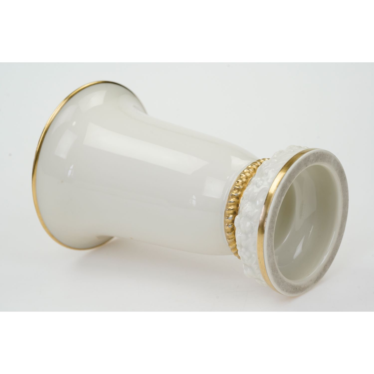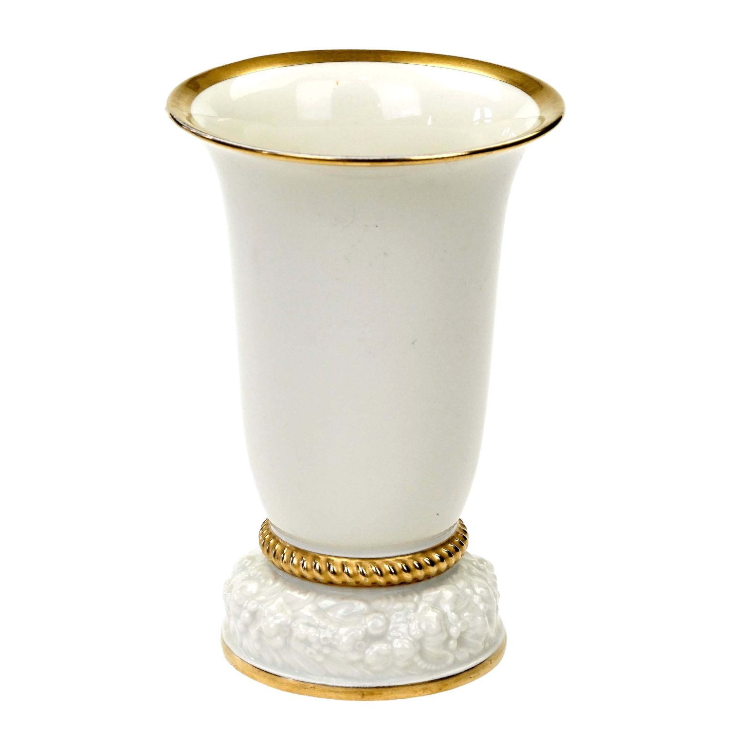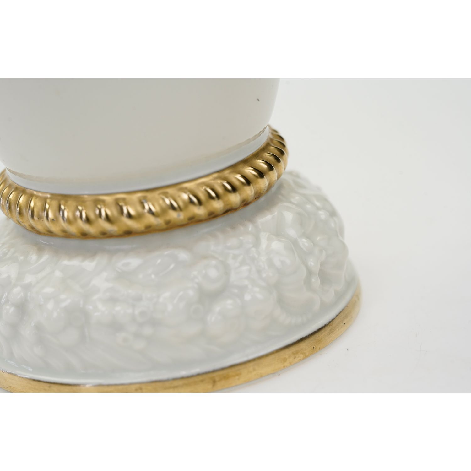 Sygnatura z lat 30-tych XX wieku. Porcelana w kolorze szlachetnej kości słoniowej, szkliwiona. Zdobiony reliefami z kwiatami i owocami granatów. Zdobiony jedynie złoceniami.