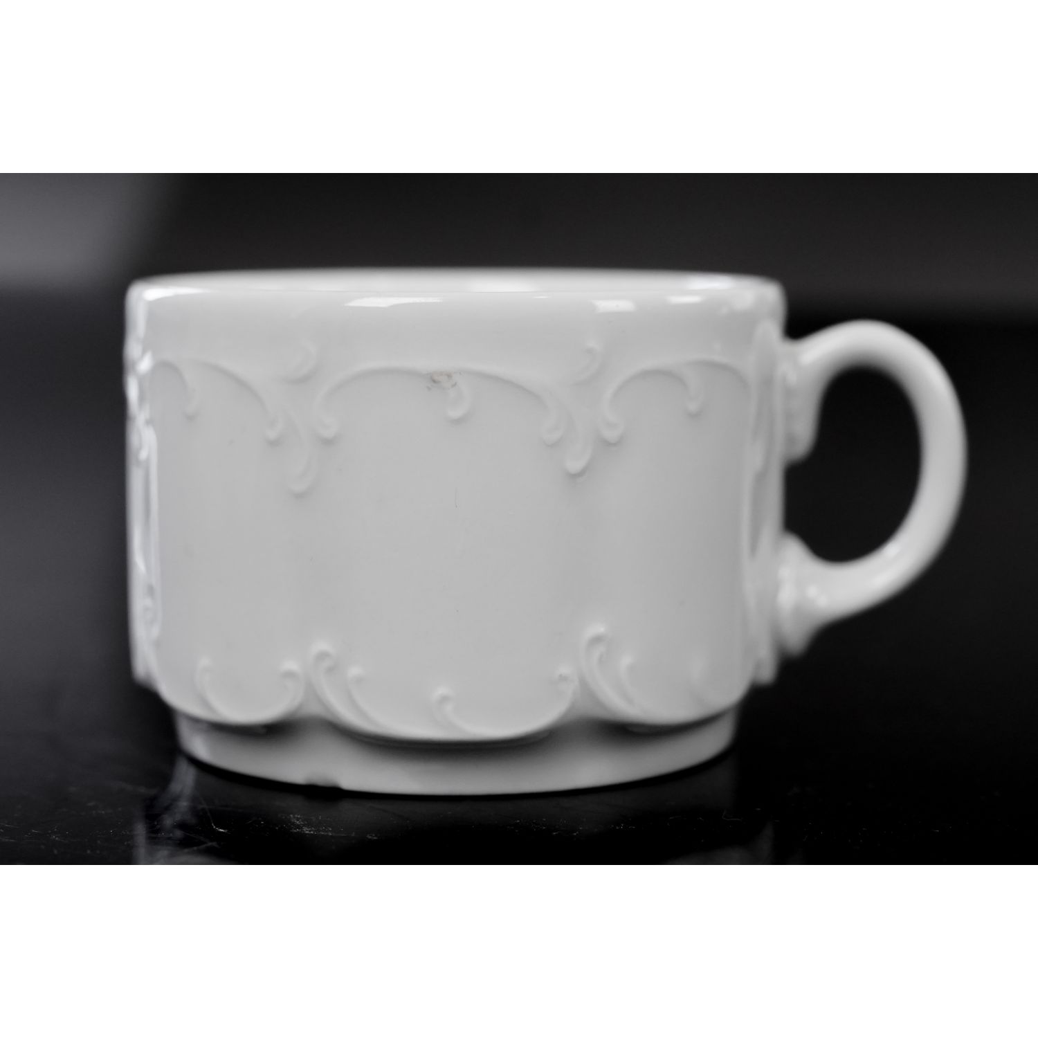 Pochodzi z Selb z wytwórni Rosenthala. Z lat 70-tych XX wieku. Sygnowane Classic Rose Rosentahl Group Germany. Fason Monbijou. Porcelana w odcieniu bieli z reliefami typowymi dla modelu.