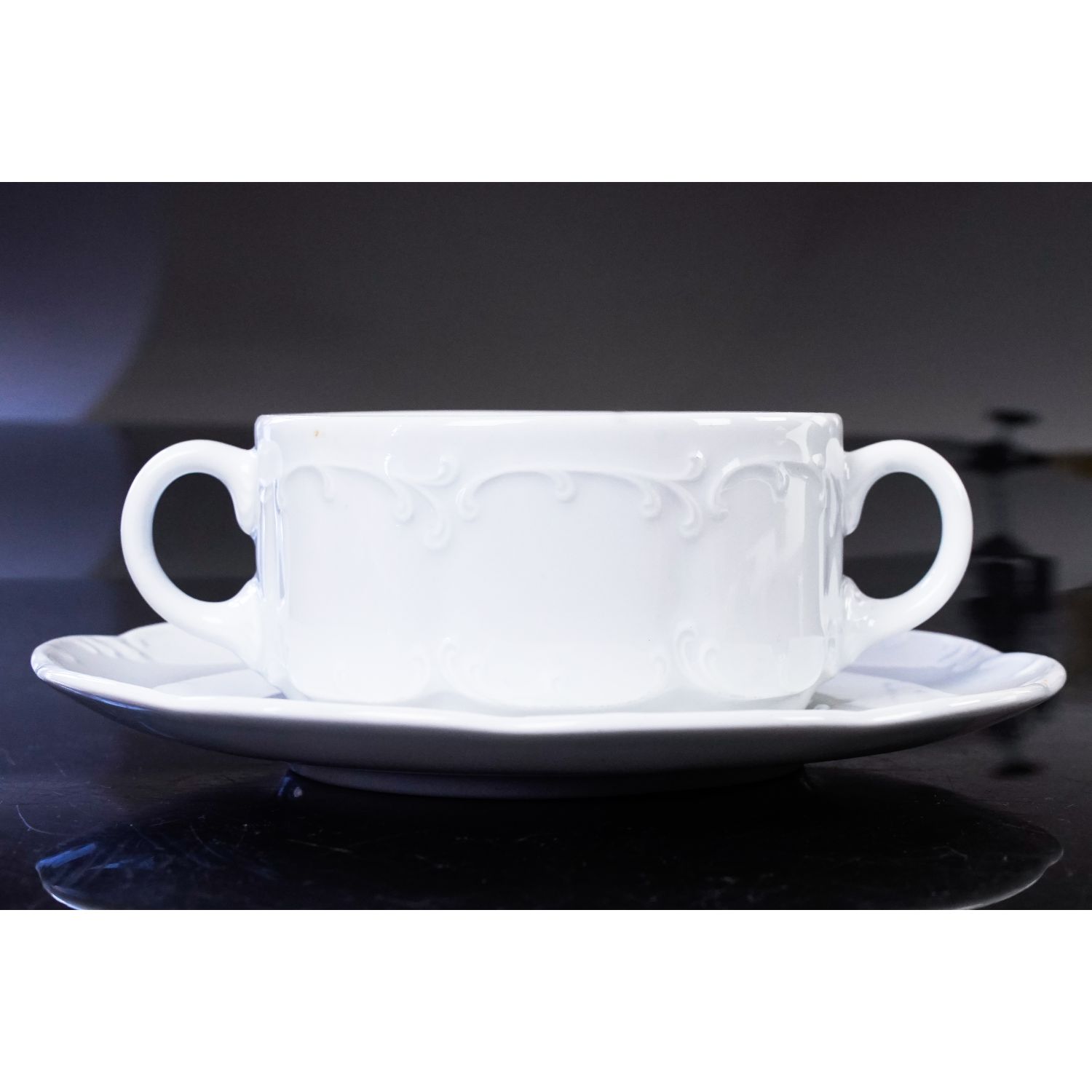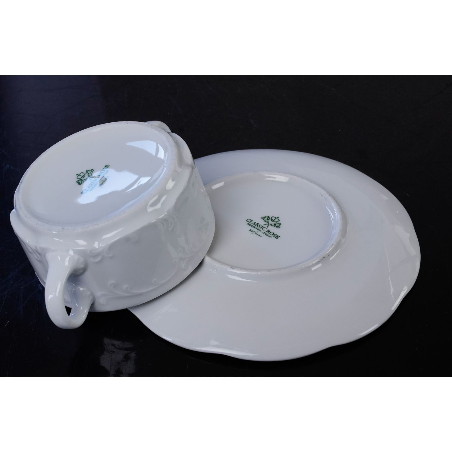 Sygnowana Classic Rose Collection, Rosenthal Group. Germany. Sygnatura z lat 70-tych XX wieku. Porcelana biała, dekorowana reliefami typowymi dla tego modelu. Bulionówka z podstawkiem. Śliczny i praktyczny przedmiot. Do zup, do dań jednogarnkowych, do owsianki.
