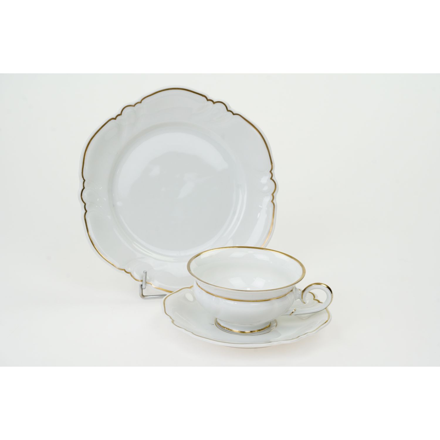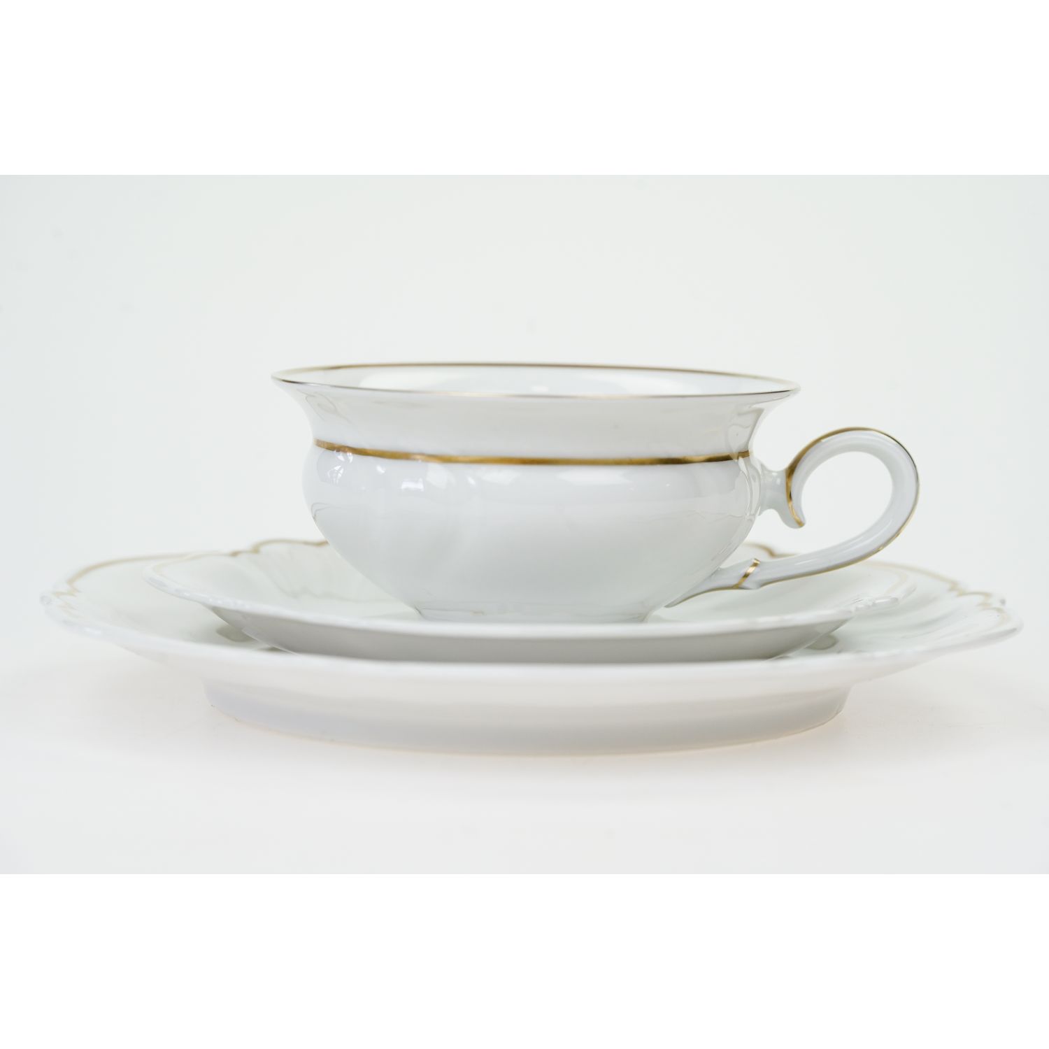 Sygnowana Rosenthal Kronach, model Viktoria z lat 30-tych XX wieku. Zestaw śniadaniowy ze sporą filiżanką. Porcelana w kolorze białym z reliefami typowymi dla modelu, ranty złocone.