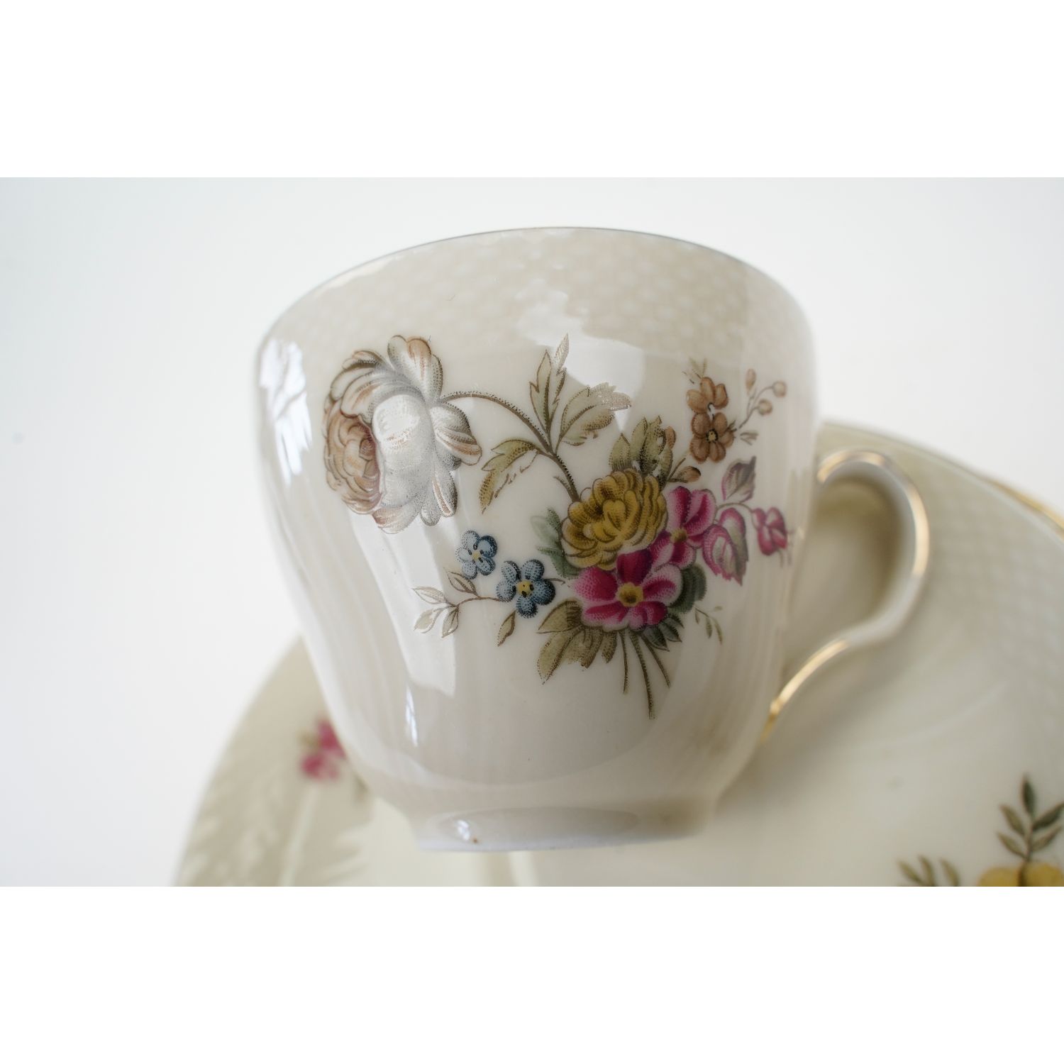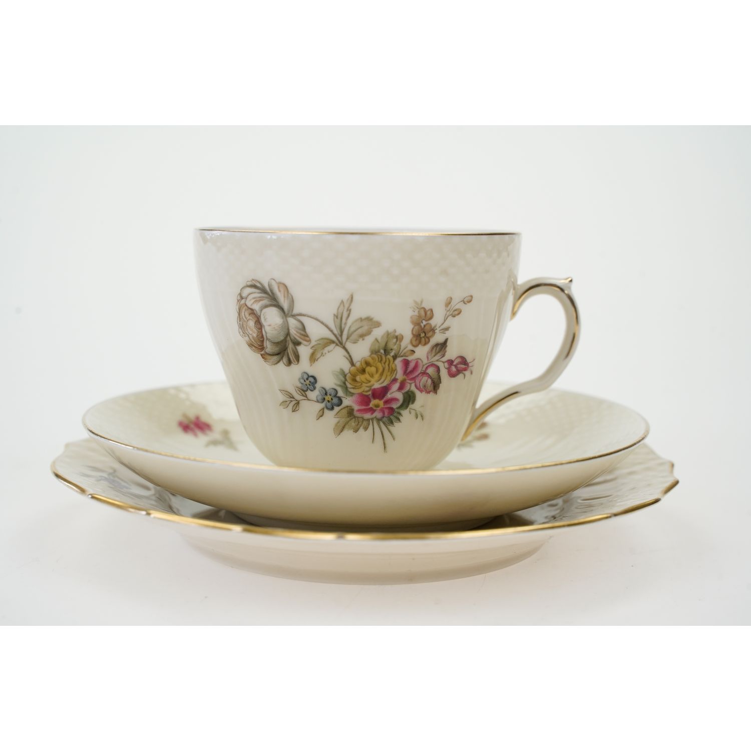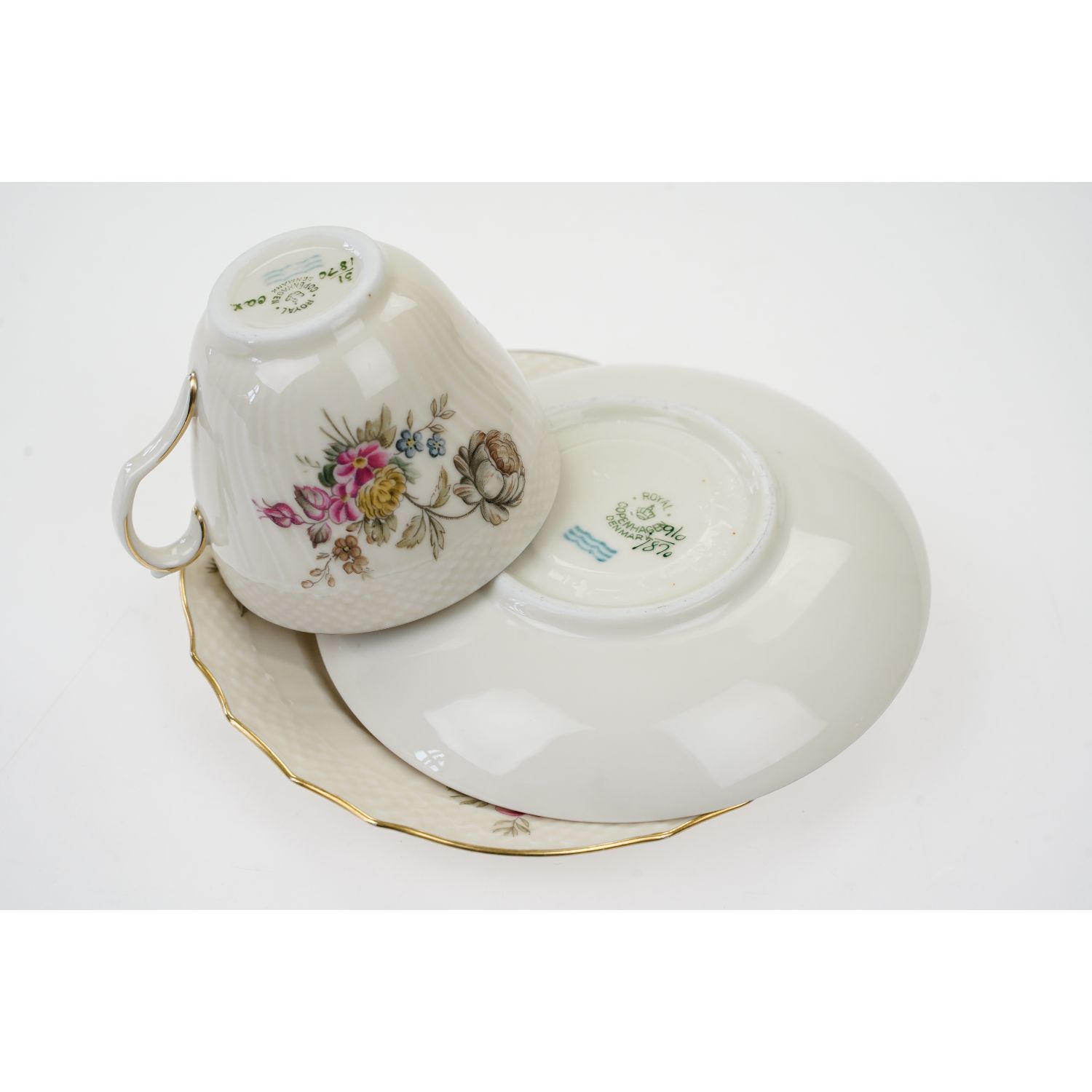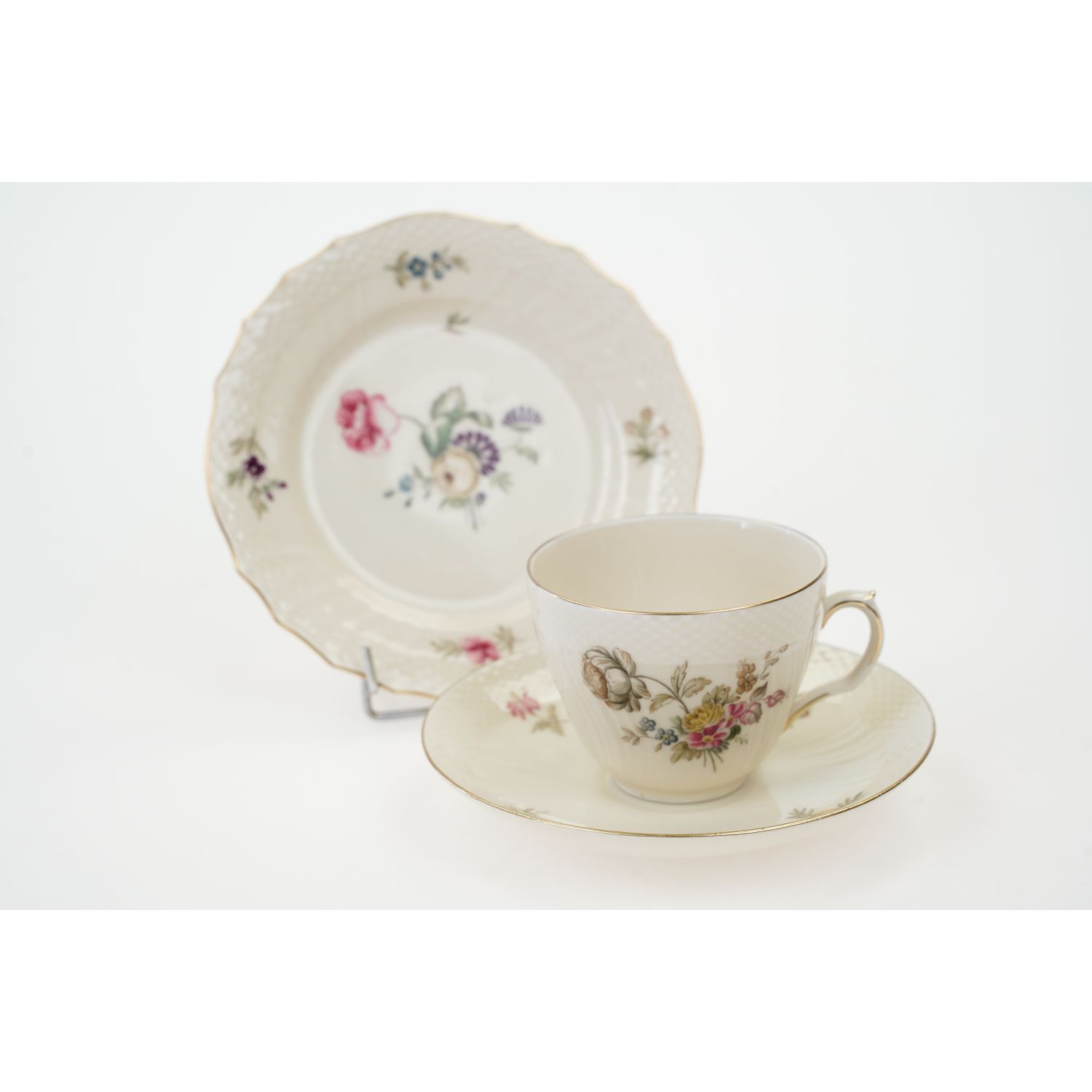 Filiżanka i talerzyki wykonane z wysokogatunkowej, białej porcelany. Mają typowe dla tej wytwórni reliefy imitujące plecionkę wiklinowego koszyka. Z obu stron duże kwiatowe dekoracje. W ofercie jest siedem zestawów, ale układ kwiatów na każdym zestawie może być inny, tak jak ich kolorystyka.