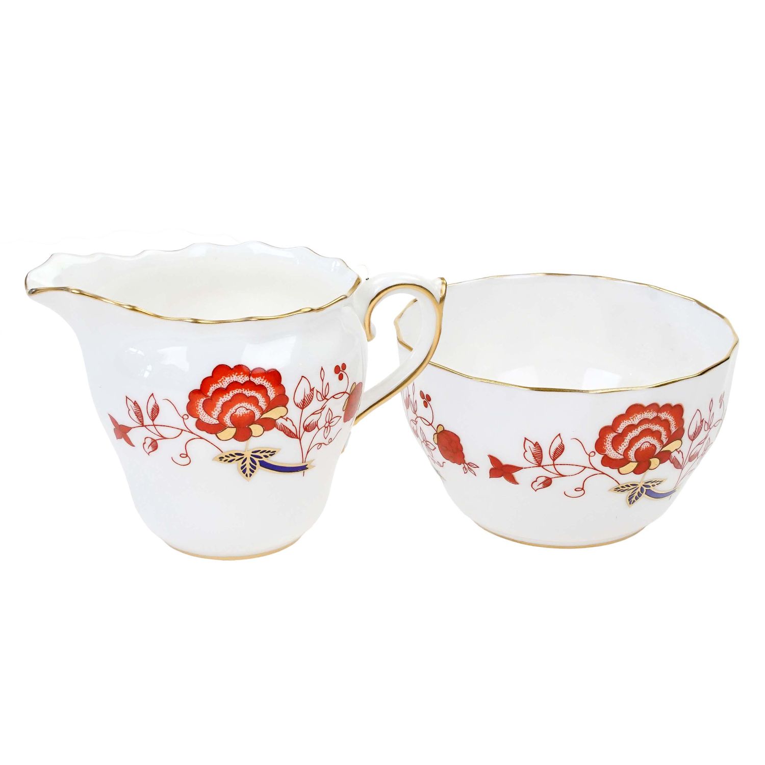 Śliczny zestaw składający się z cukierniczki i mlecznika z dekoracją w stylu orientalnym.