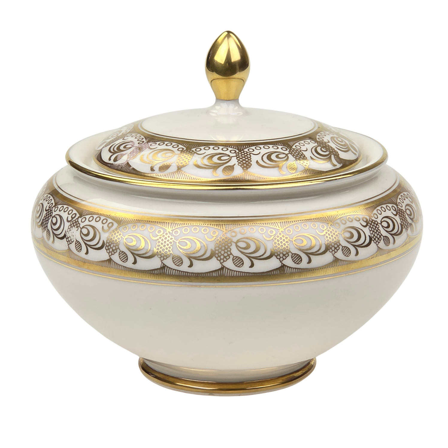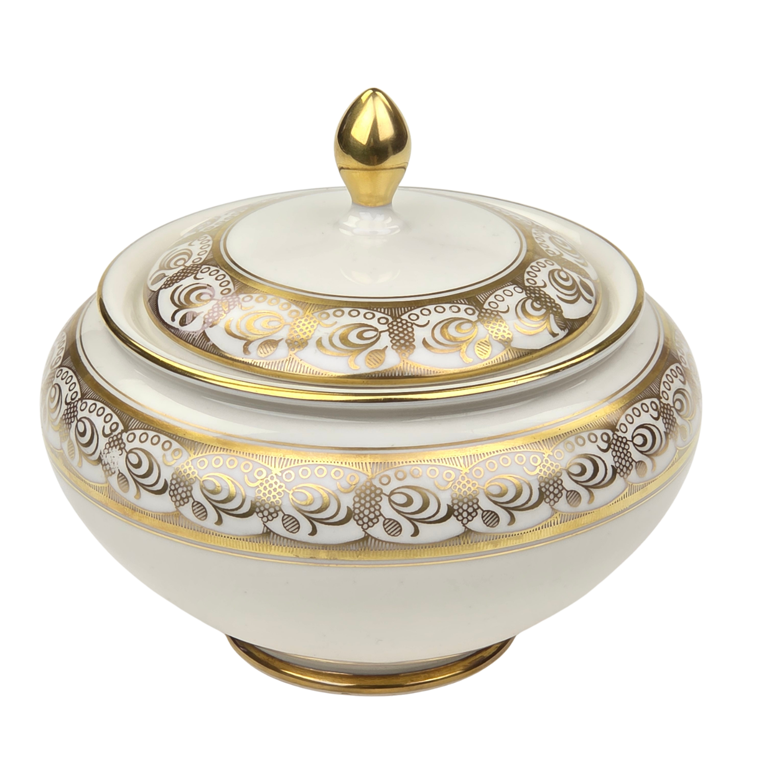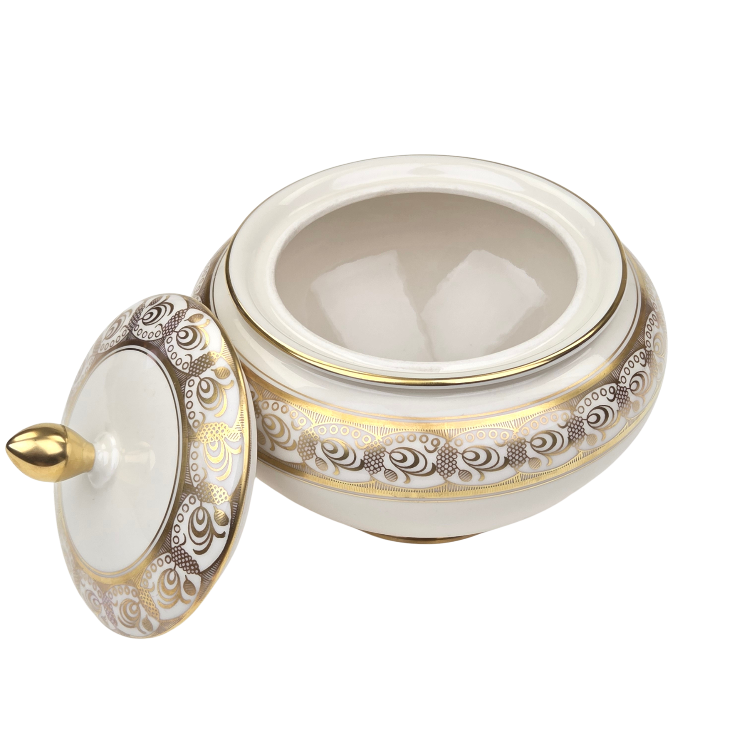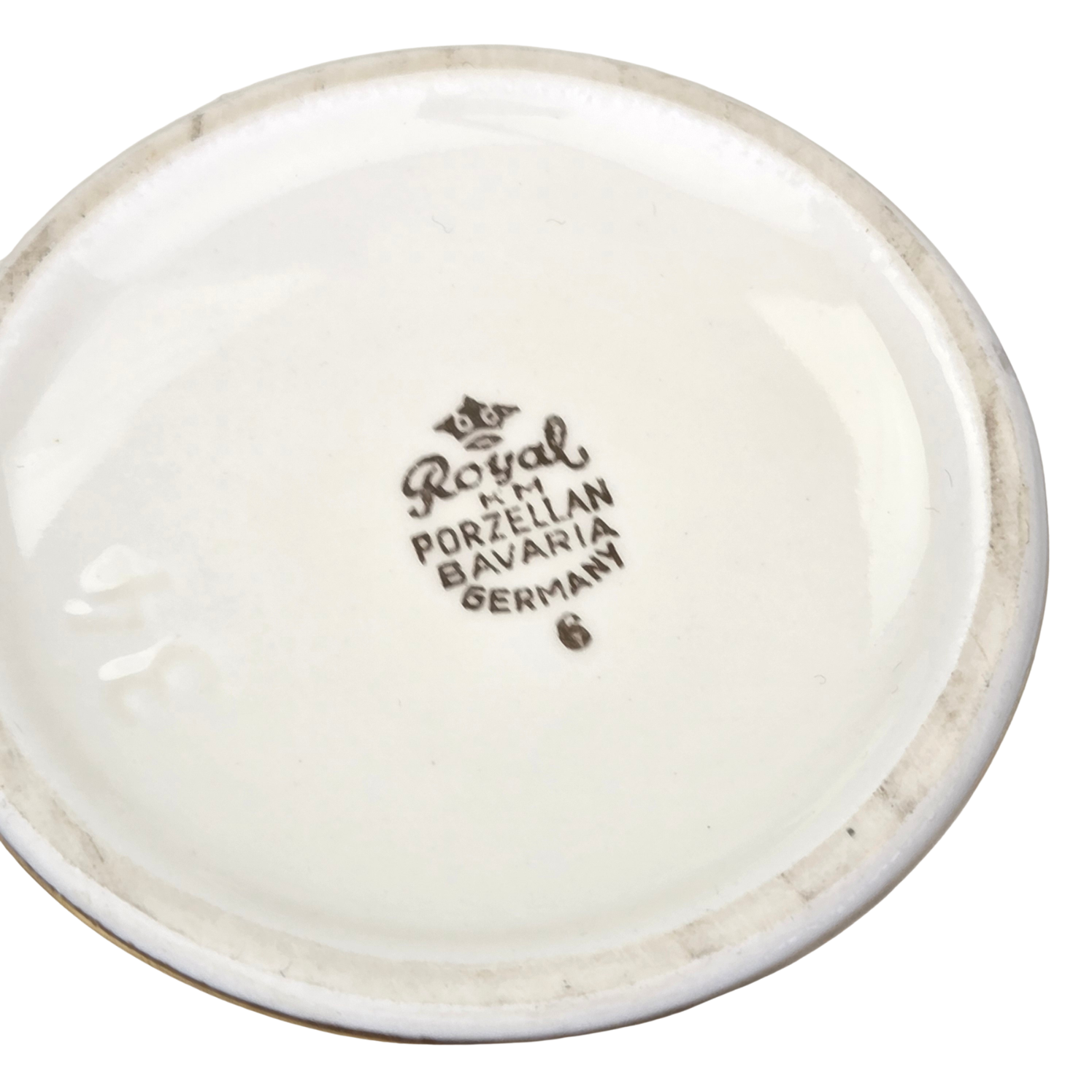 Pochodzi z niemieckiej manufaktury porcelany z Marktredwitz, Kerafina GmbH Porzellanfabrik, Royal KM. Sygnowany znakiem z lat 50-tych XX wieku. Wykonana z najwyższej jakości, kremowej porcelany. O brzuchatym kształcie. Na brzuścu i na pokrywie szlaczek złotych ornamentów. Rant podkreślono oryginalnym złoceniem oraz w pełni złocona sterczynka.