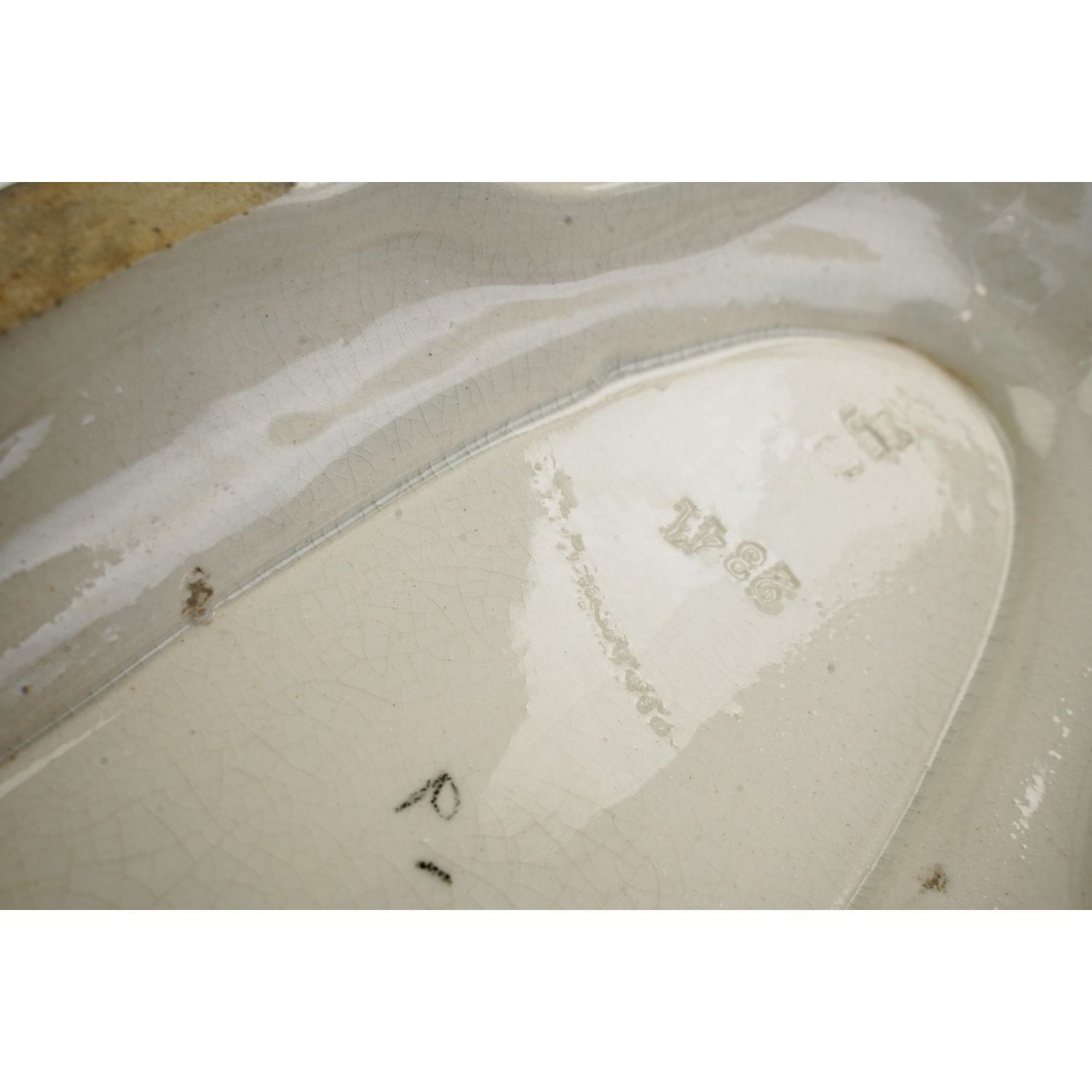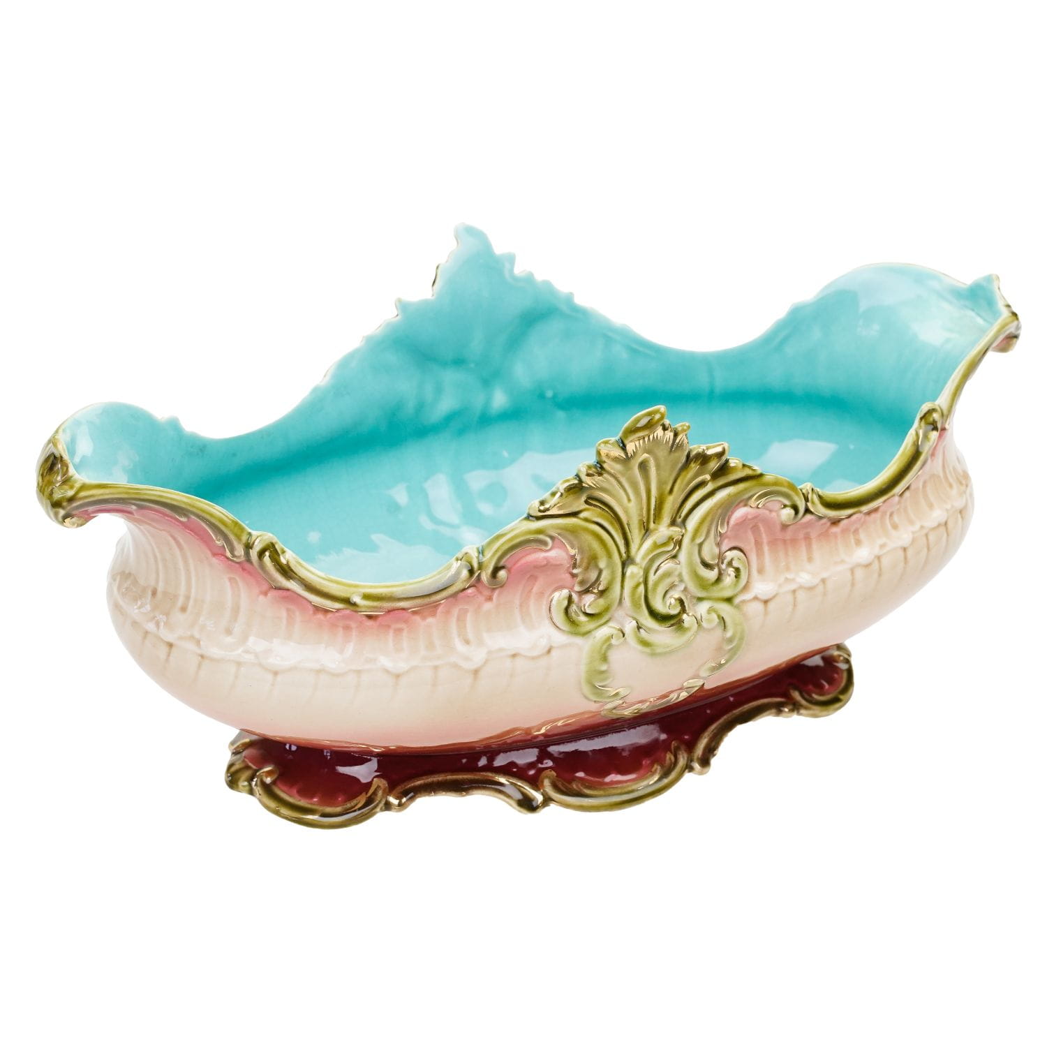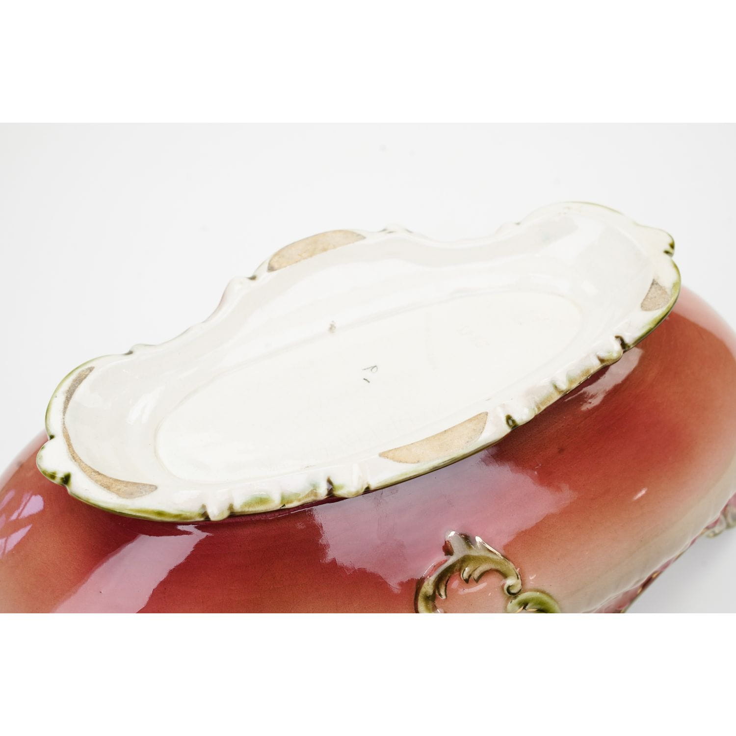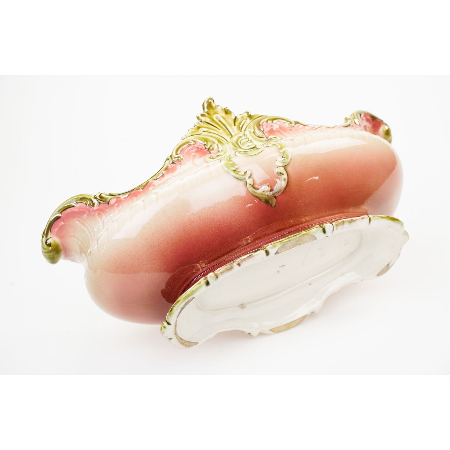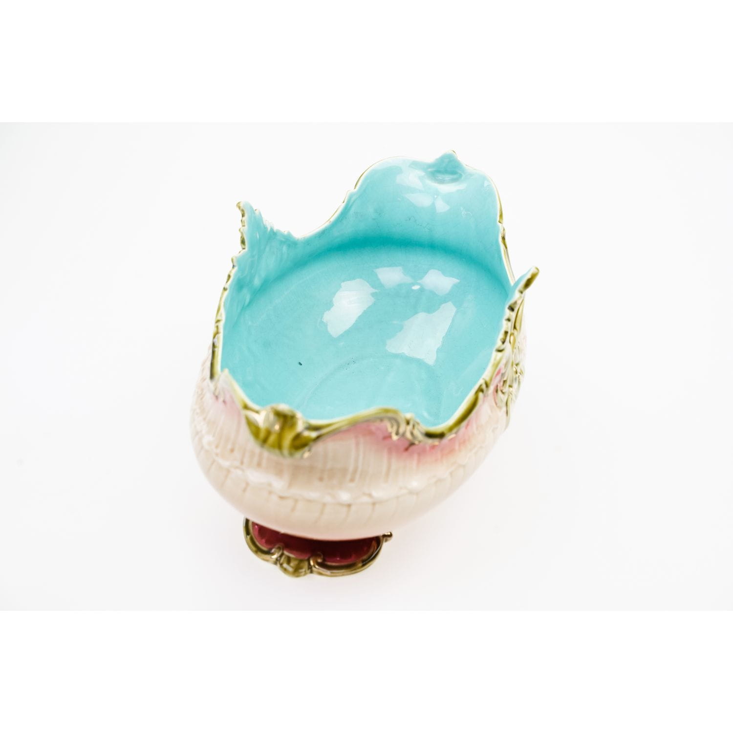 Pochodzi z Pochodzi z Francji z Sarreguemines z Utzschneider et Cie. Sygnowana znakiem stosowanym od 1880 roku, choć może być nawet starsza. Posiada wyciśnięty numer wzoru. Sygnowany jak na zdjęciu. Z początku XX wieku. Malinowo-różowa, cieniowana u dołu, Z roślinnymi, zielonymi reliefami ze złoceniem. Wewnątrz turkusowa. Całość szkliwiona.