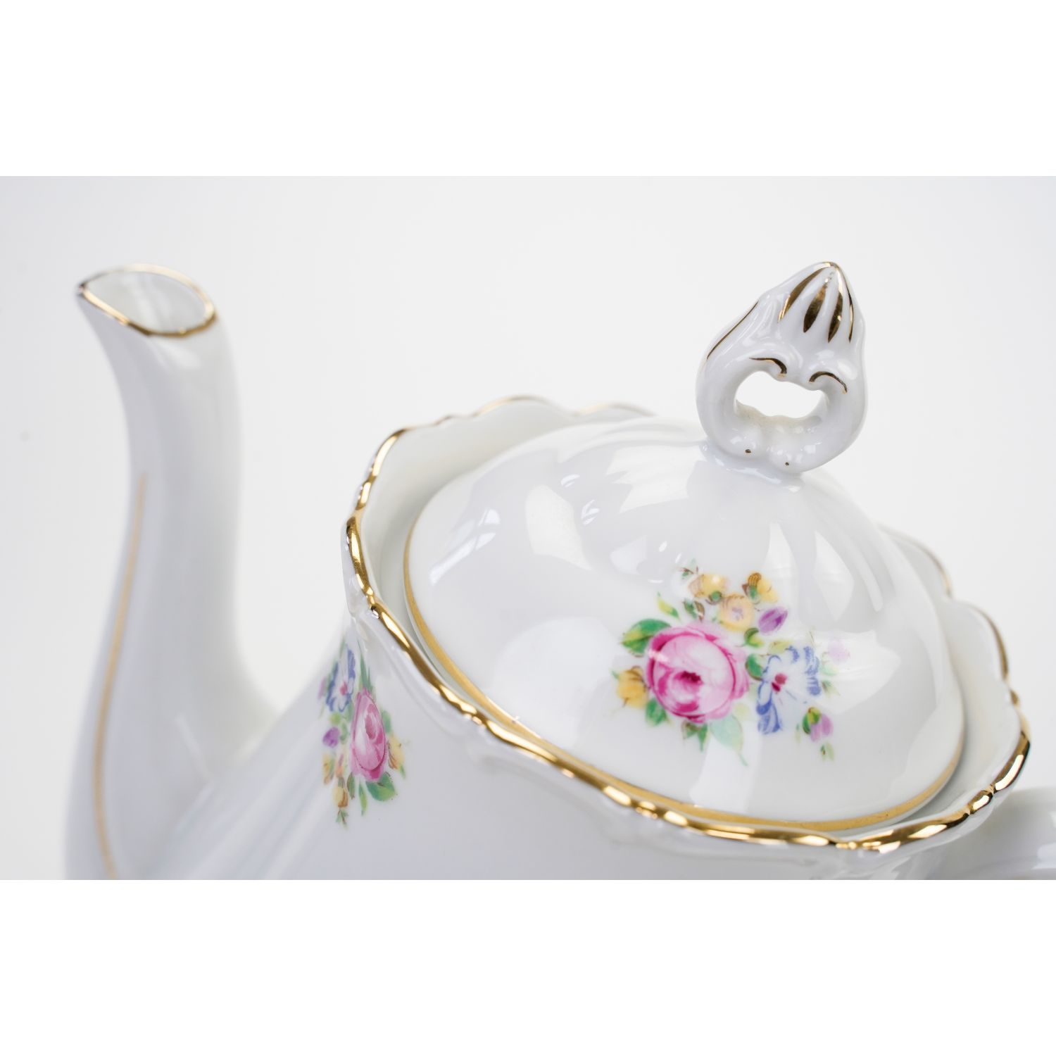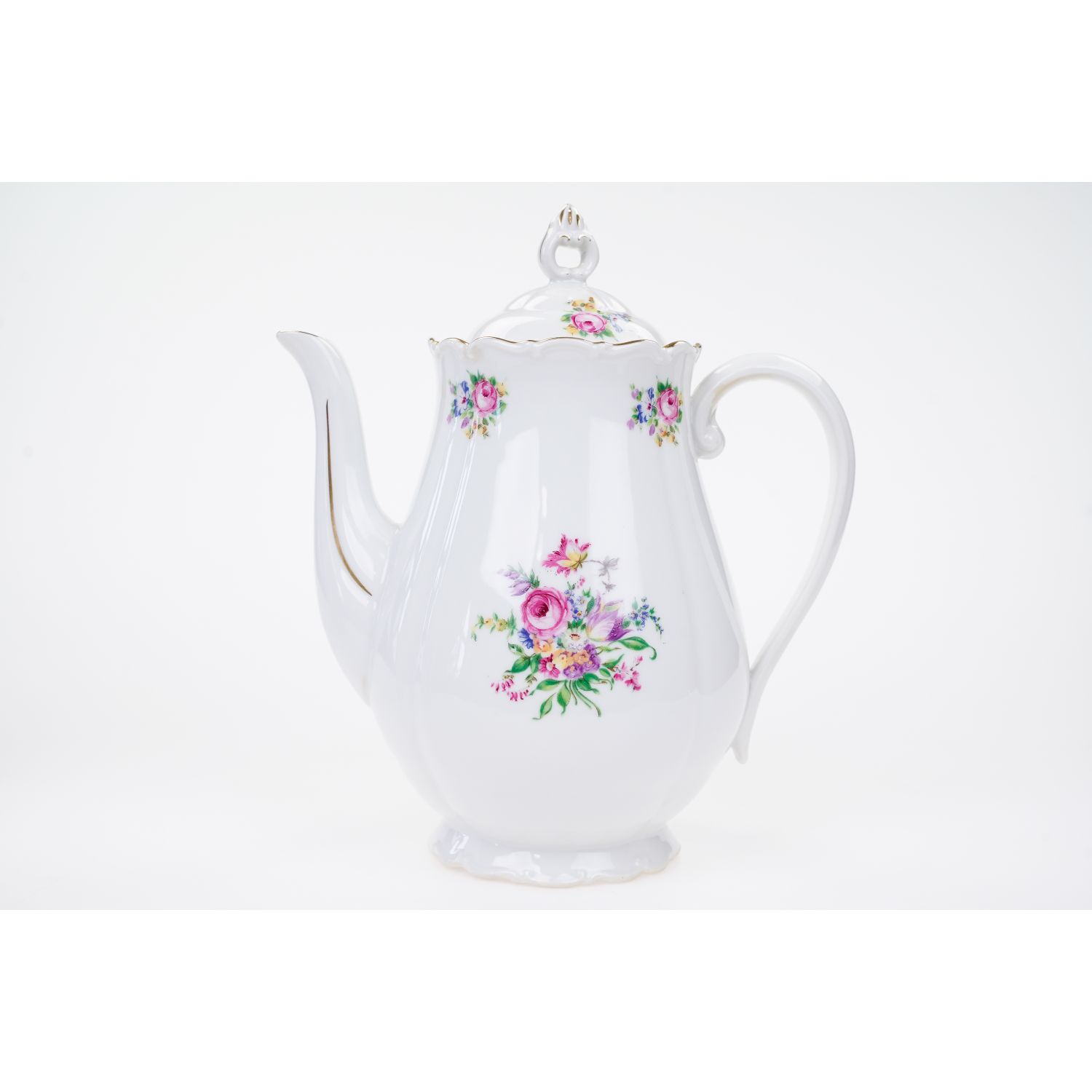 Pochodzi z Czech z miejscowości Horní Slavkov (niem. Schlaggenwald), z Haas & Cžjžek. Sygnatura stosowana po 1945 roku taki sam znak był stosowany dla wyrobów eksportowych. Porcelana odcieniu złamanej bieli o klasycznej, eleganckiej formie. Zdobiona większymi i mniejszymi bukietami kwiatów. Kontury złocone oraz uszko, wlewka i sterczyn złocone.