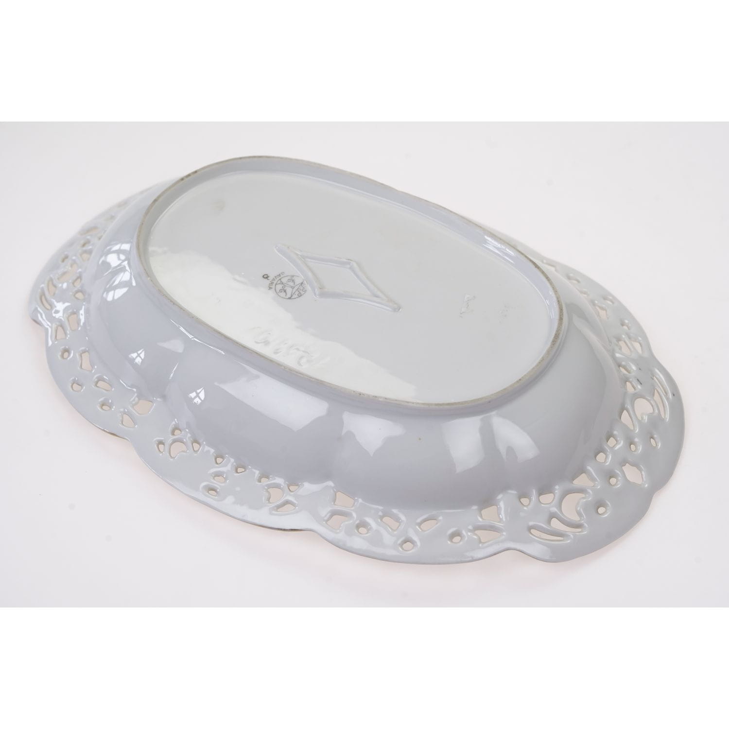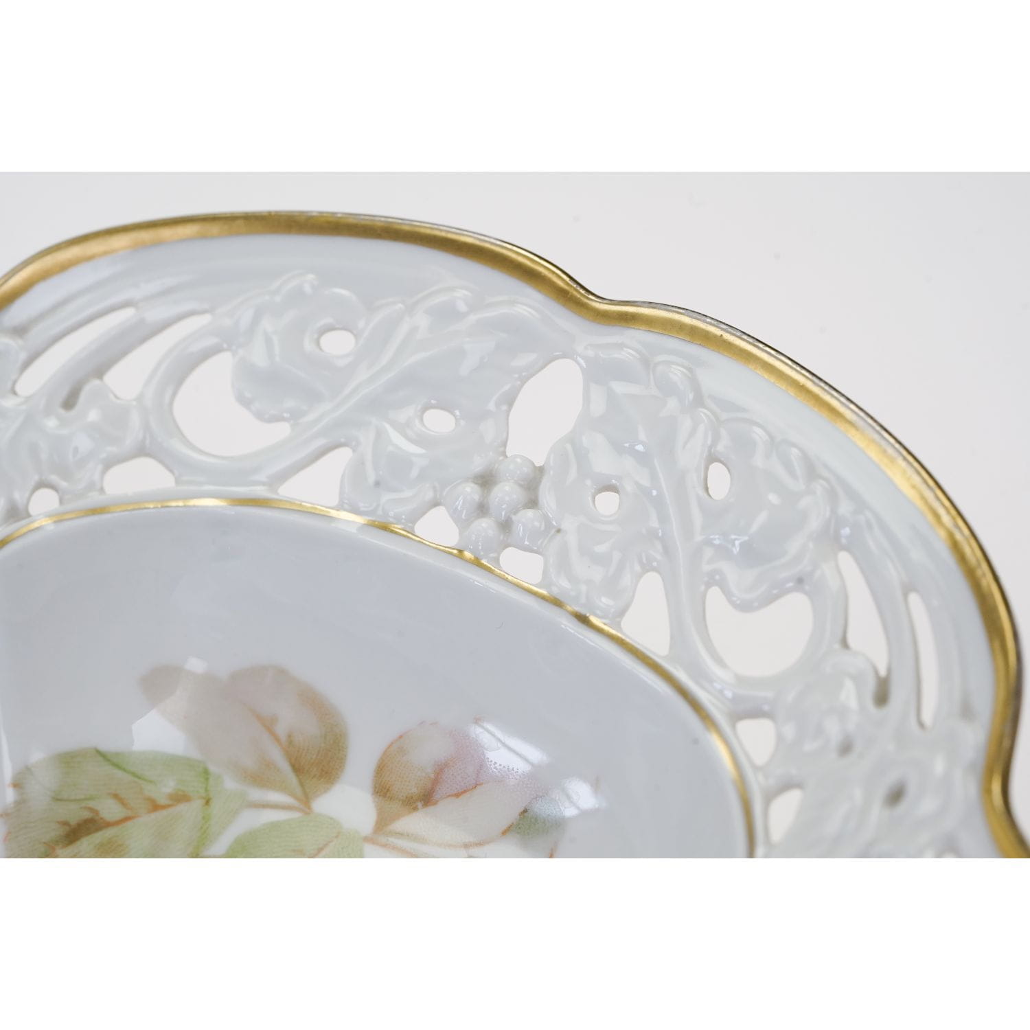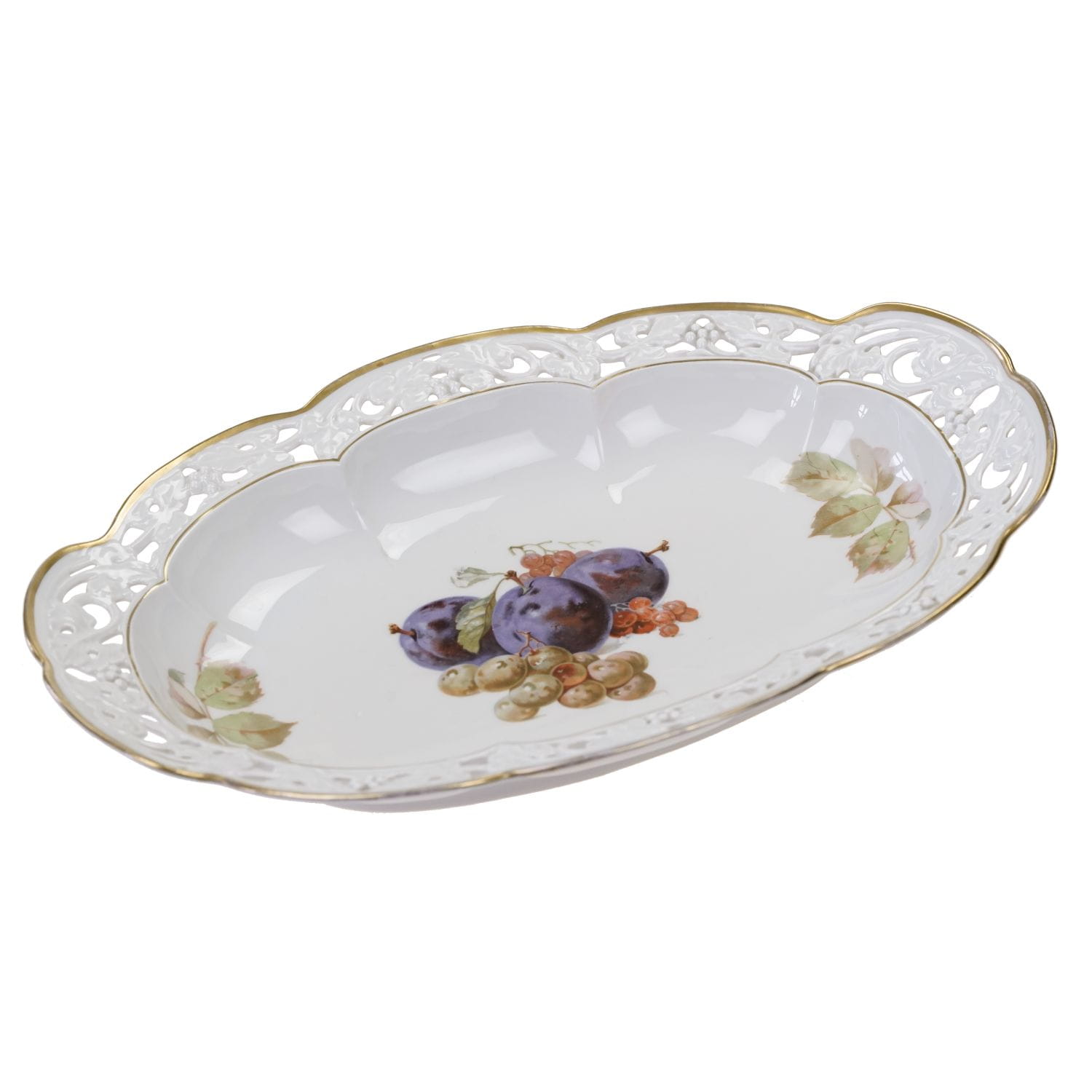 Pochodzi najprawdopodobniej z Arzberg z Porzellanfabrik Schönwald Abteilung Arzberg. Sygnatura Fabryki Porcelany Schönwald oddział Arzberg z lat 1919 - 1927. Śliczna, biała porcelana z przepięknymi ażurkami, które mają formę winnych liści i kiści winogron. Na lustrze bukiet realistycznych, smakowitych owoców: winogrona, śliwki i porzeczki. Rant złocony, trochę poprzecierany.