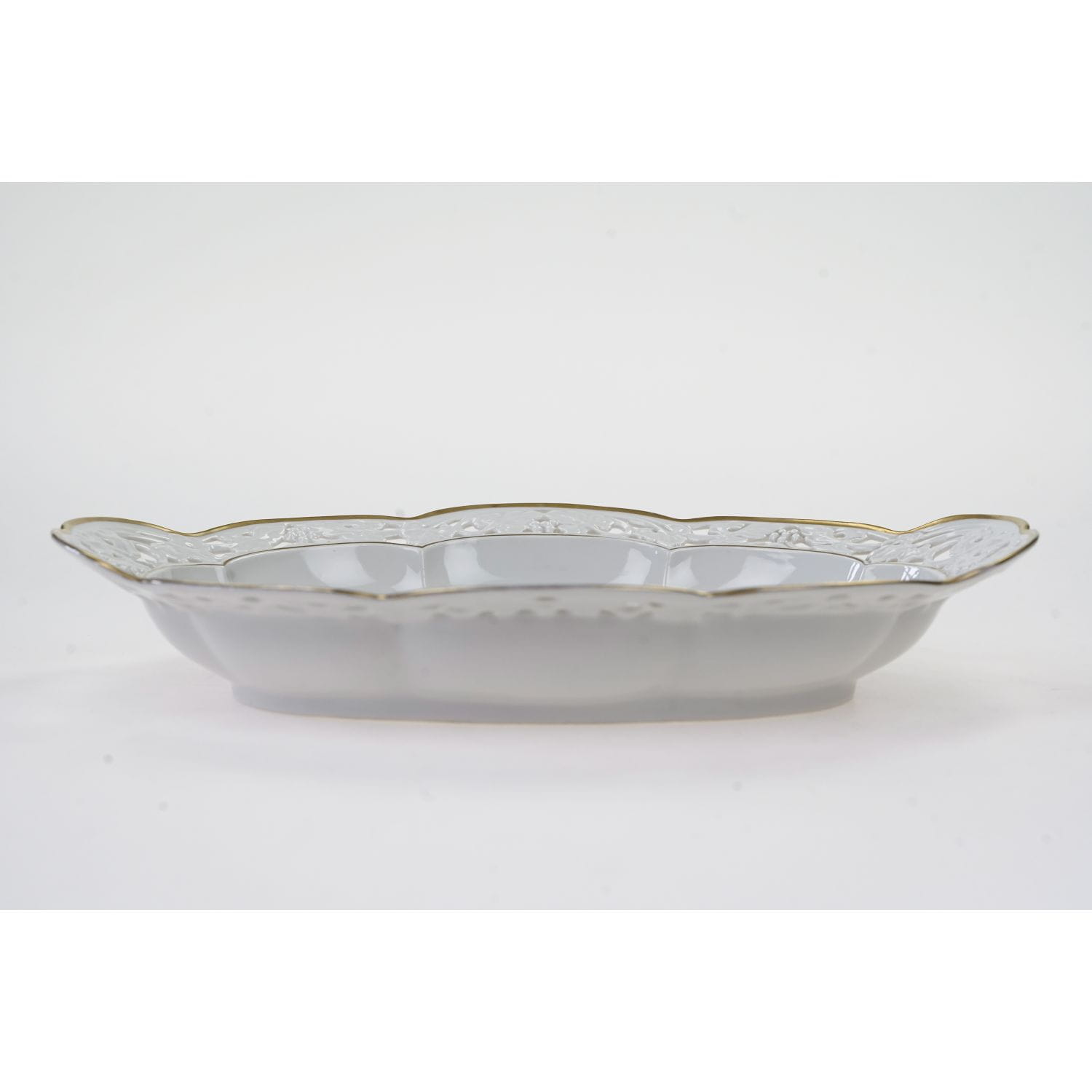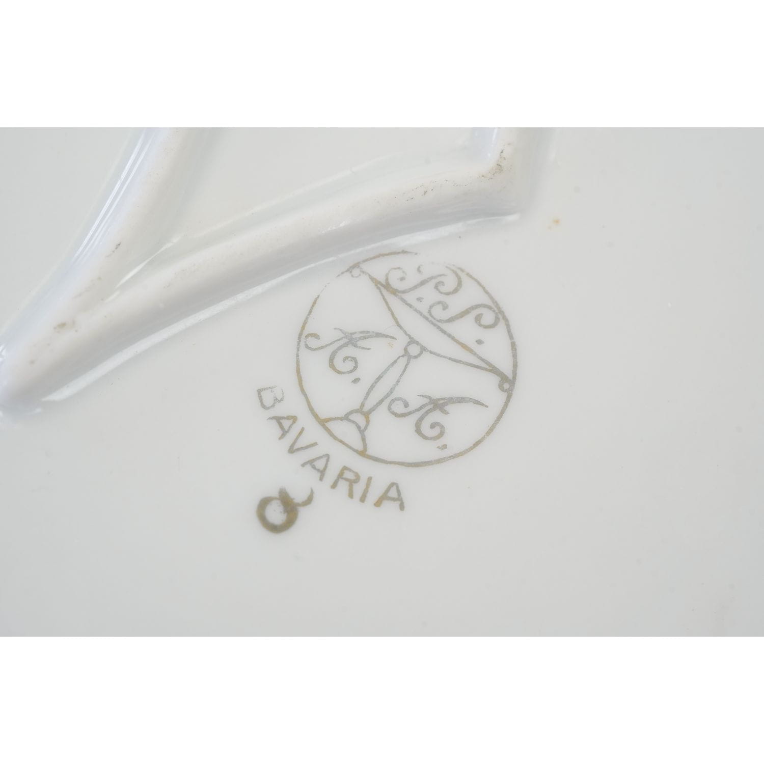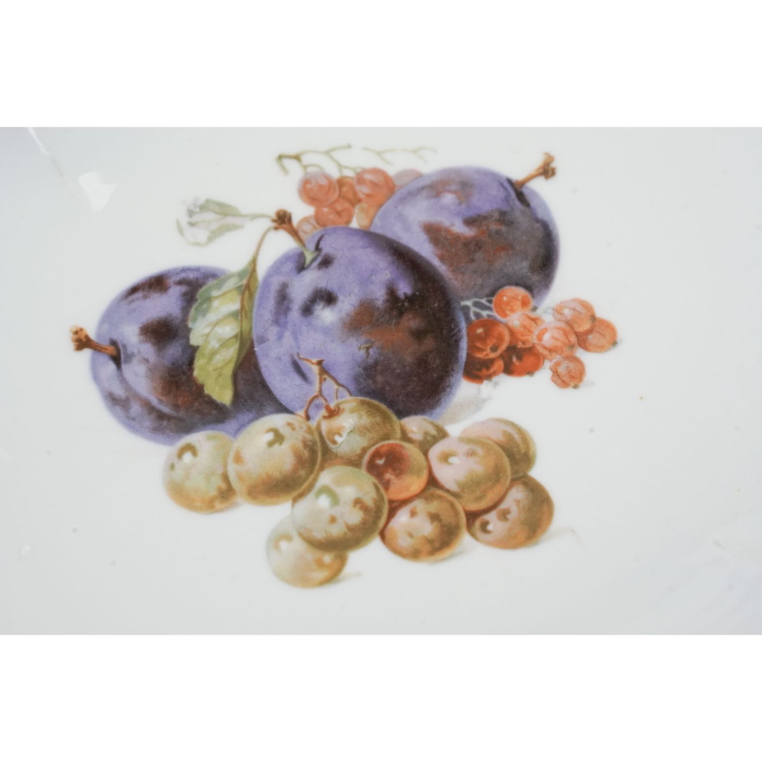 Pochodzi najprawdopodobniej z Arzberg z Porzellanfabrik Schönwald Abteilung Arzberg. Sygnatura Fabryki Porcelany Schönwald oddział Arzberg z lat 1919 - 1927. Śliczna, biała porcelana z przepięknymi ażurkami, które mają formę winnych liści i kiści winogron. Na lustrze bukiet realistycznych, smakowitych owoców: winogrona, śliwki i porzeczki. Rant złocony, trochę poprzecierany.
