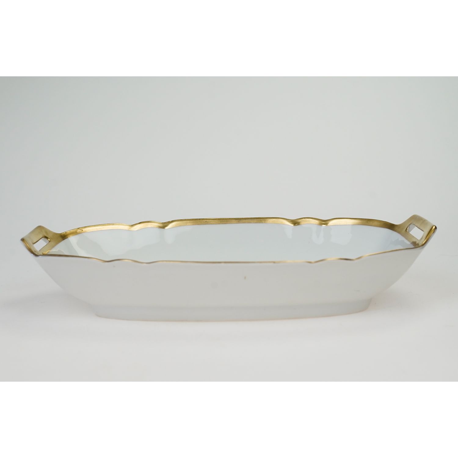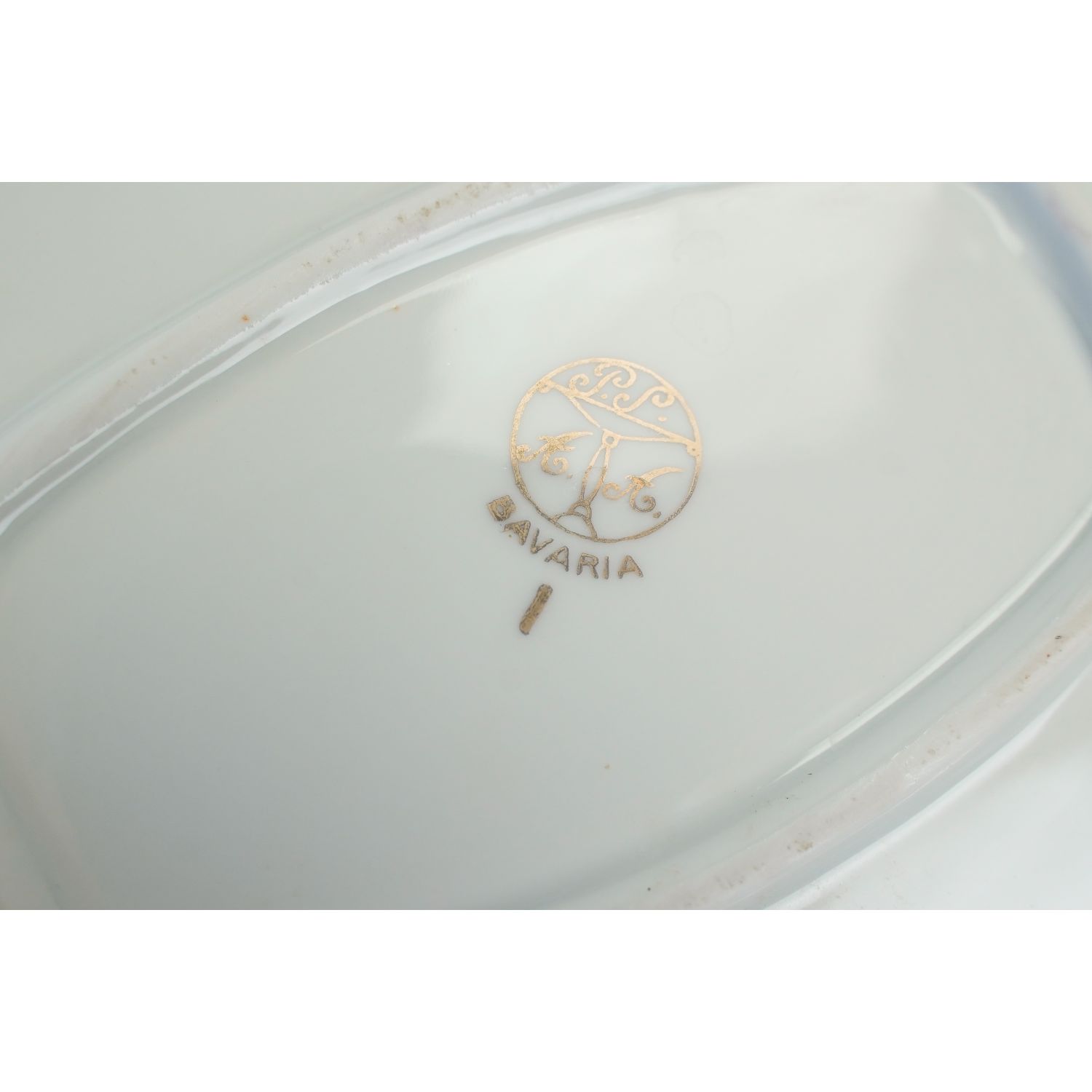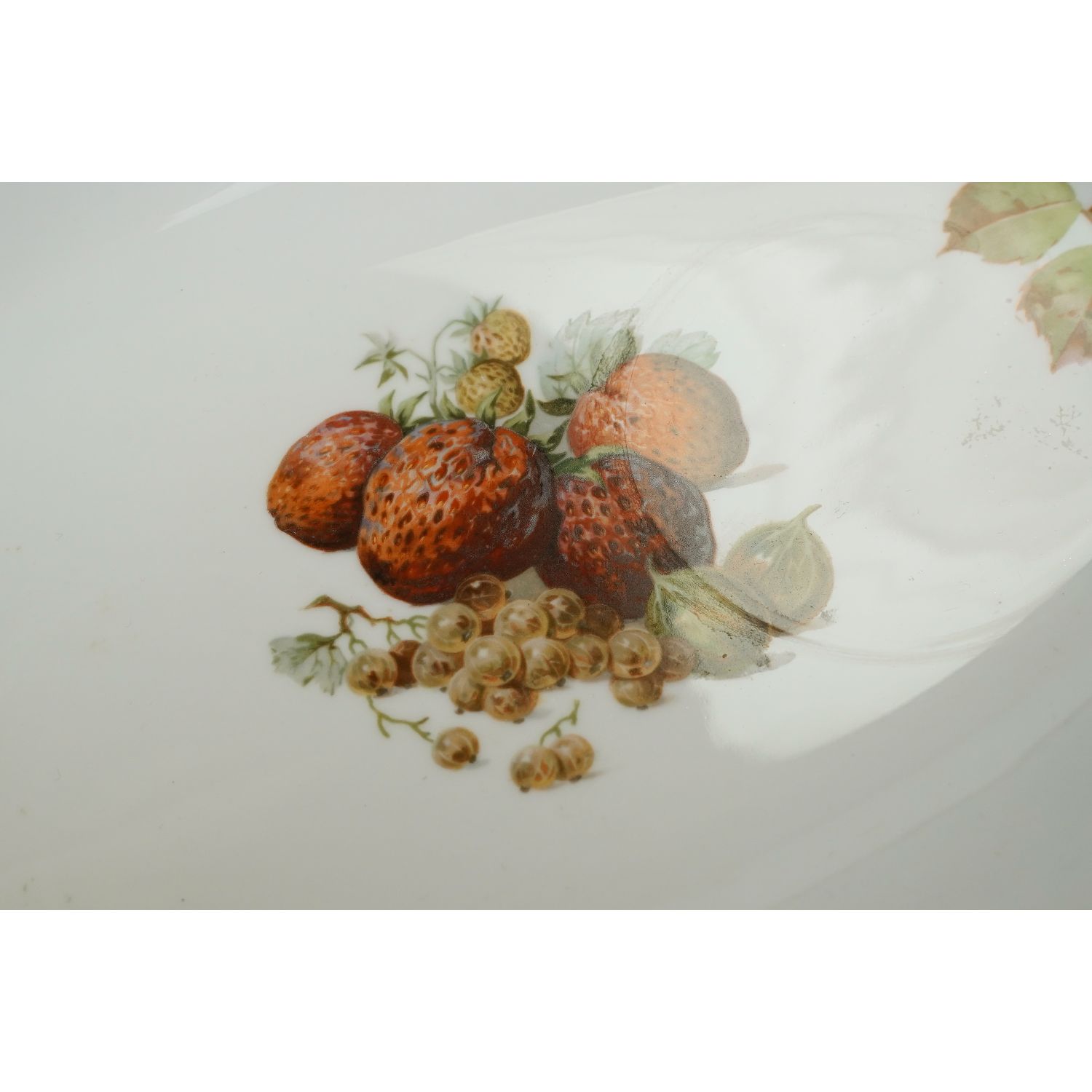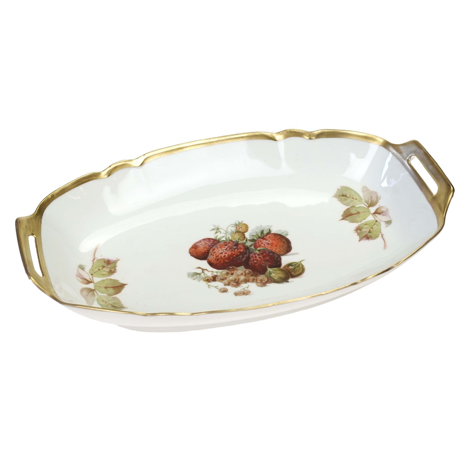 Pochodzi z Arzberg z Porzellanfabrik Schönwald Abteilung Arzberg. Sygnatura Fabryki Porcelany Schönwald oddział Arzberg z lat 1919 - 1927. Śliczna, biała porcelana z przepięknymi ażurowymi uszami. Na lustrze bukiet realistycznych, smakowitych owoców: truskawki i agresty. Rant i uszy grubo złocone.