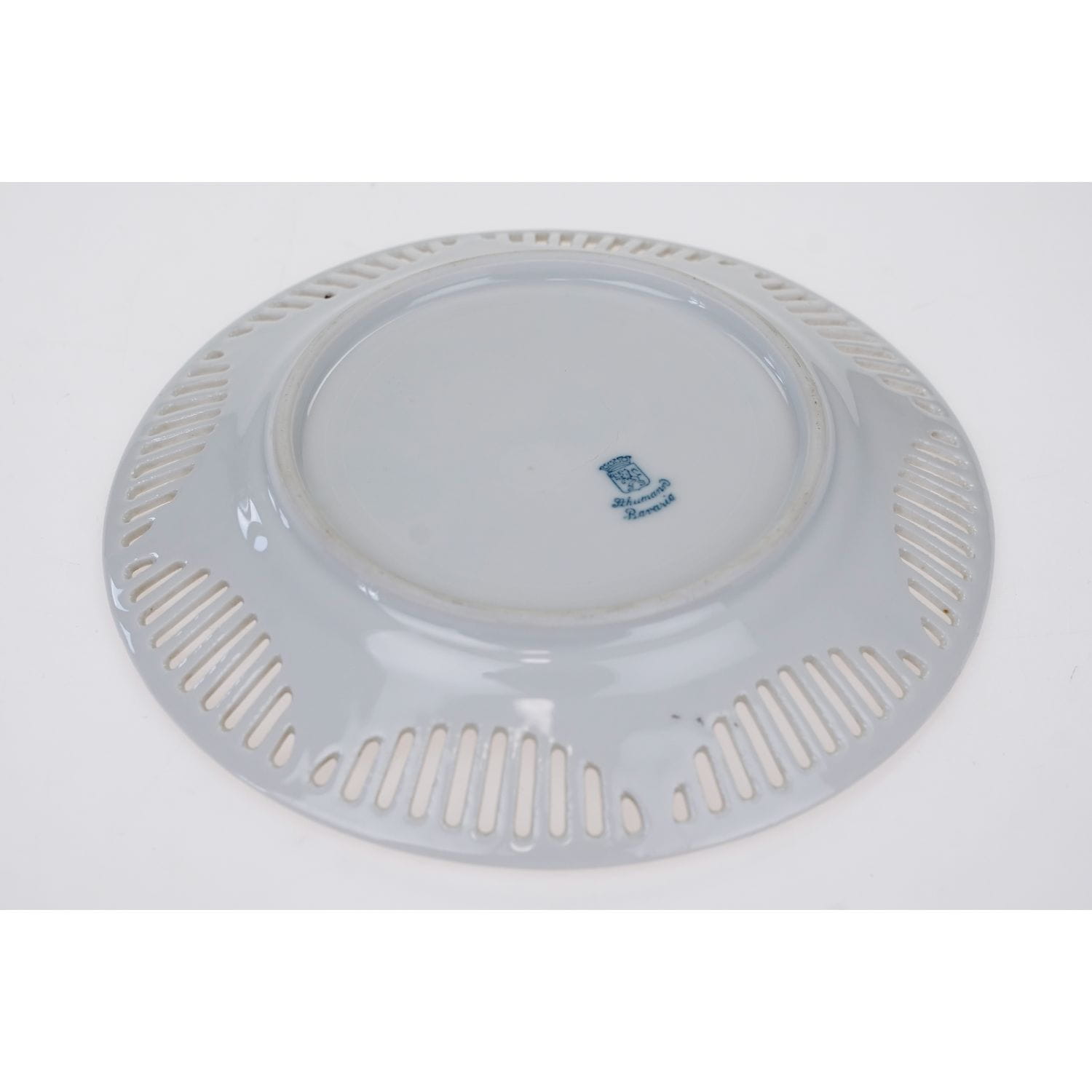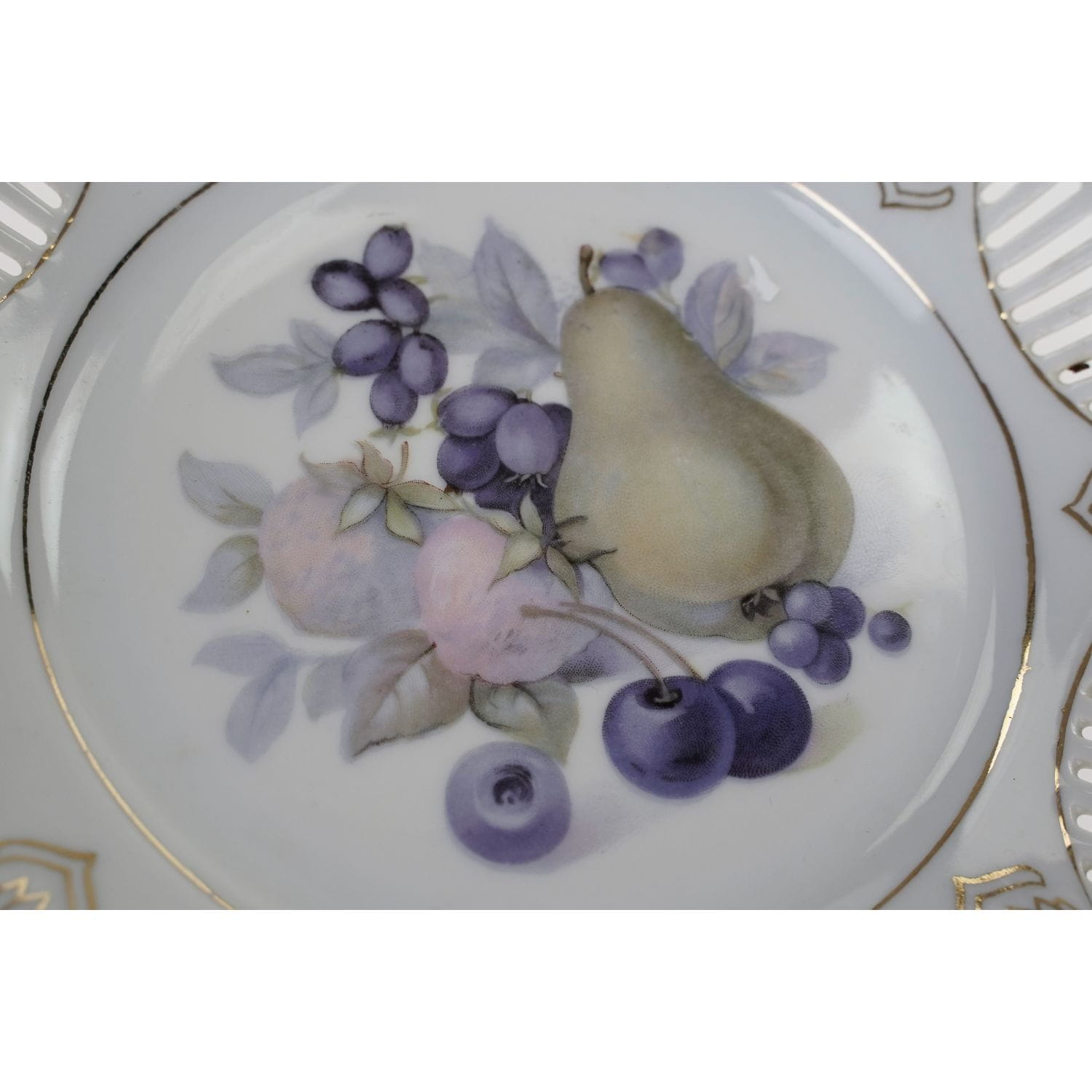 Pochodzi z Bawarii z Arzberg z Carl Schumann Porzellanfabrik. Porcelana w odcieniu bieli. Na lustrze smakowite bukiety owoców w stonowanych kolorach. Kołnierz cały w ażurach, pomiędzy nimi reliefy podkreślone złoceniami. Rant kiedyś złocony, dzisiaj trochę przetarty.