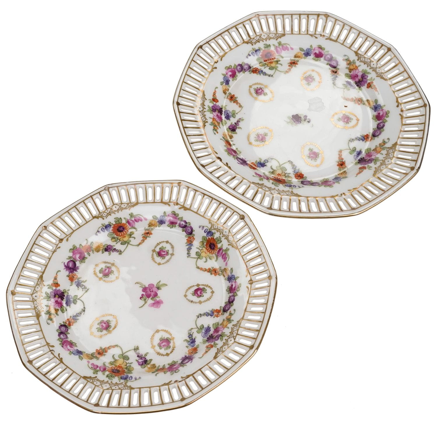 Para pięknych, kwiatowych talerzyków deserowych z ażurowymi kołnierzykami.