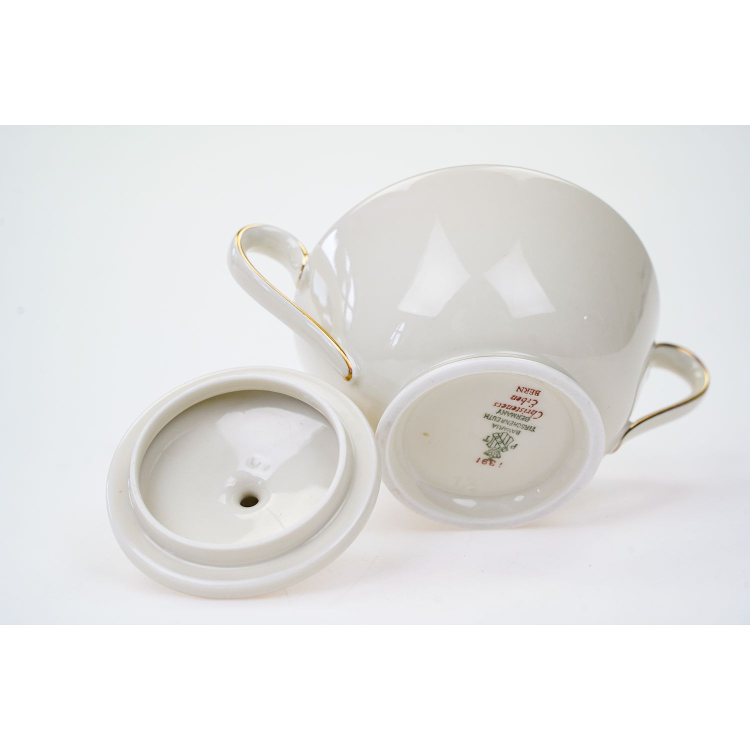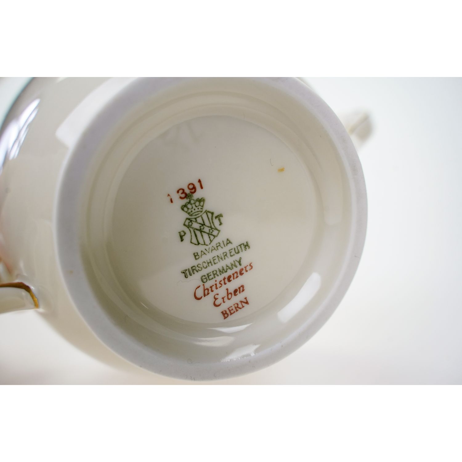 Pochodzi z Schwarzenhammer z Schumann & Schreider Porzellanfabrik Schwarzenhammer. Sygnowana znakiem stosowanym po 1930 roku. Porcelana biała. Kołnierz w skomplikowanych ażurach, które ręcznie podkreślono złoceniami. Rant falowany, wykończony perlaturą pokrytą złoceniem. Na lustrze ręcznie malowane kwiaty róż.