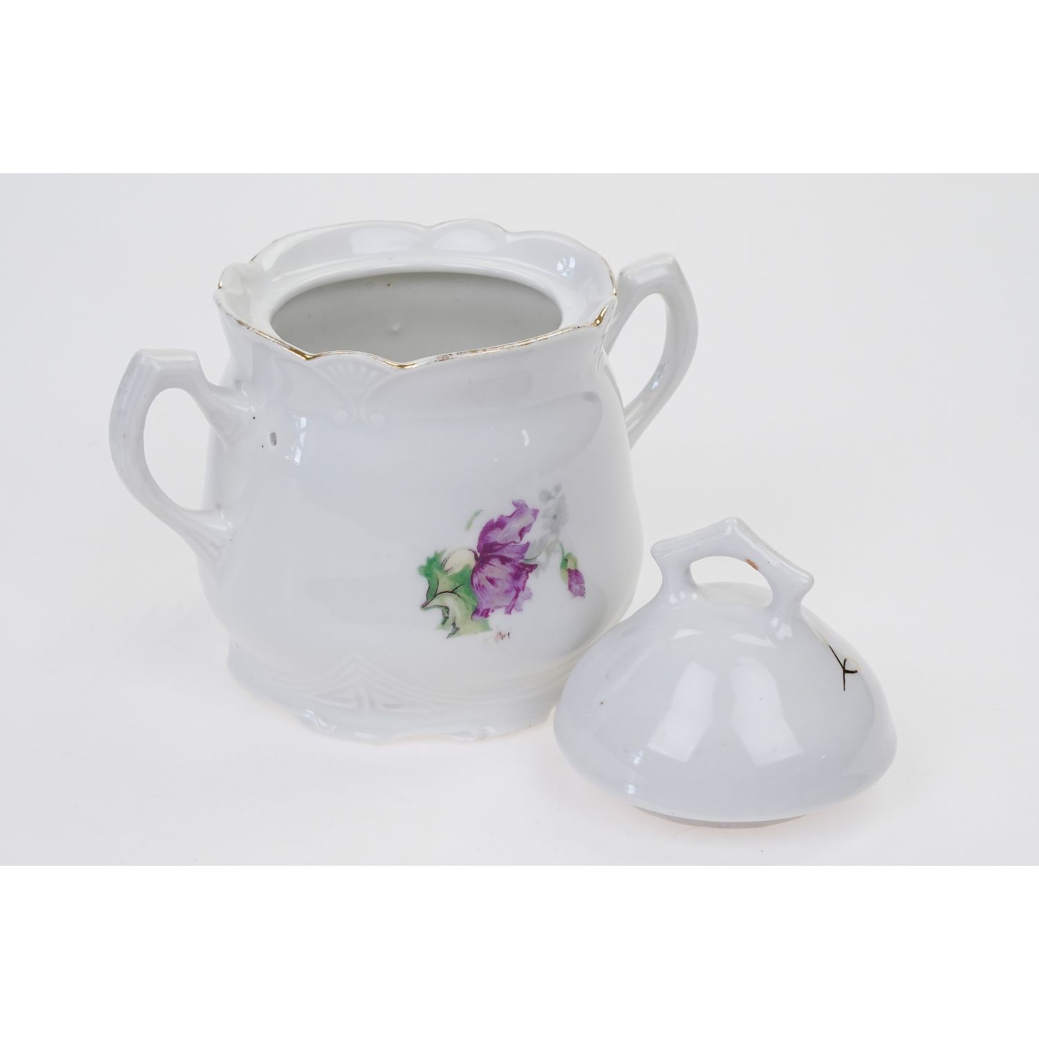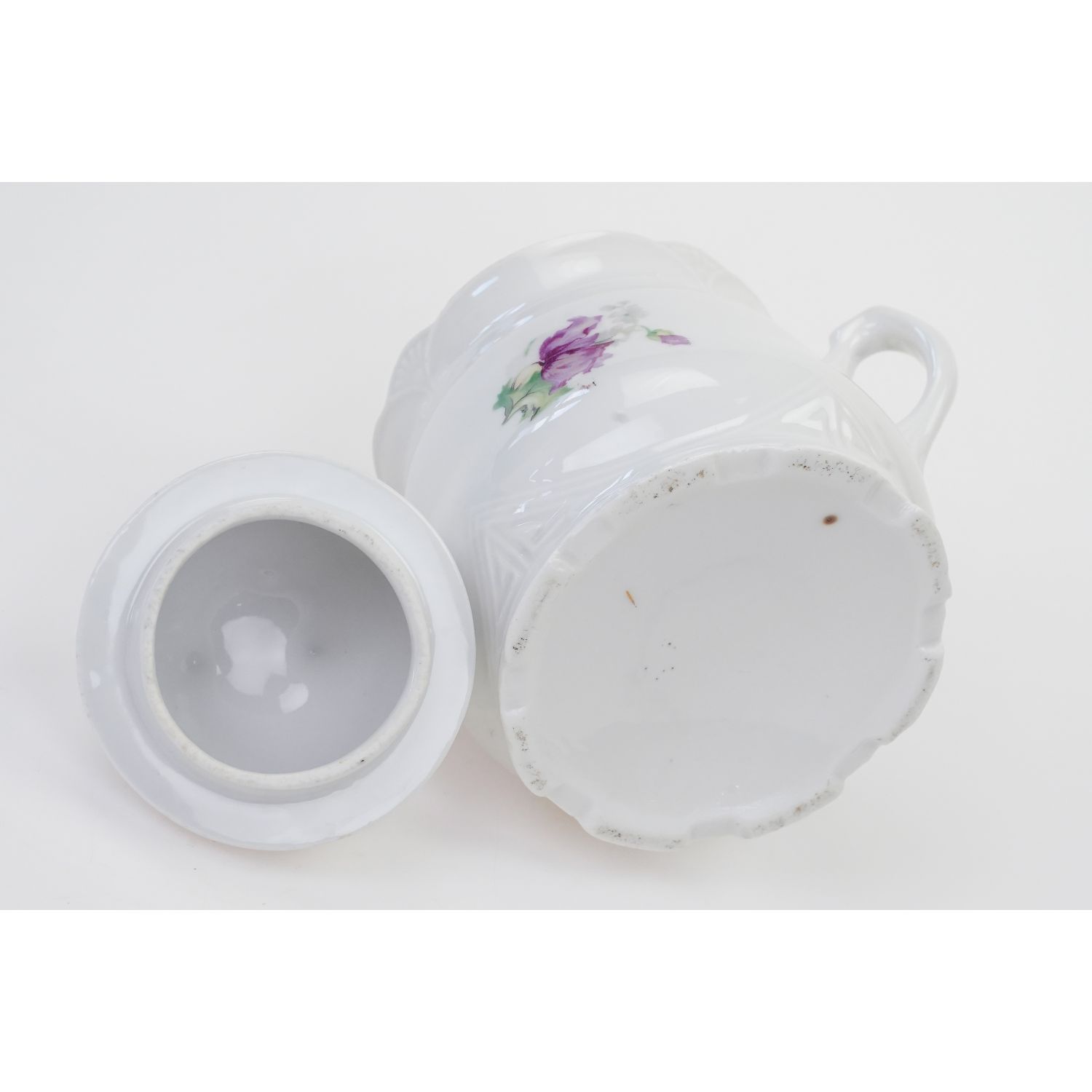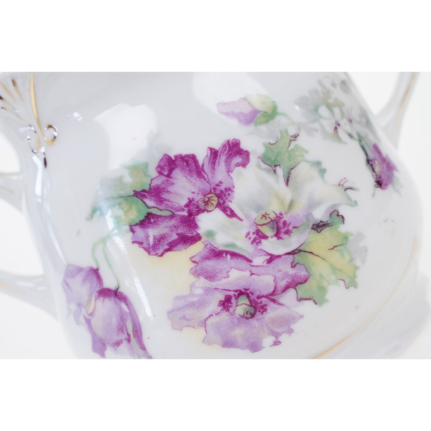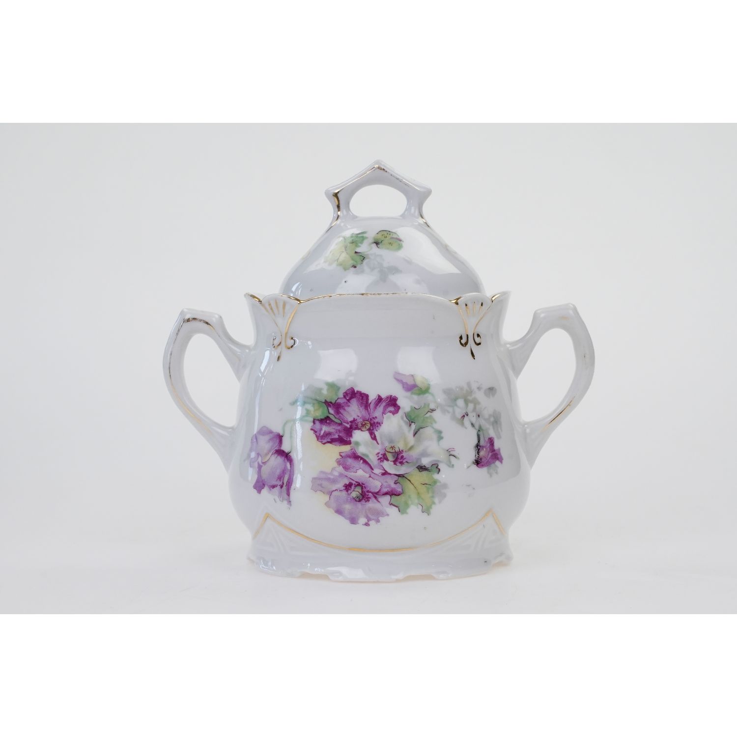 Piękna, zabytkowa cukiernica w fioletowe kwiaty.