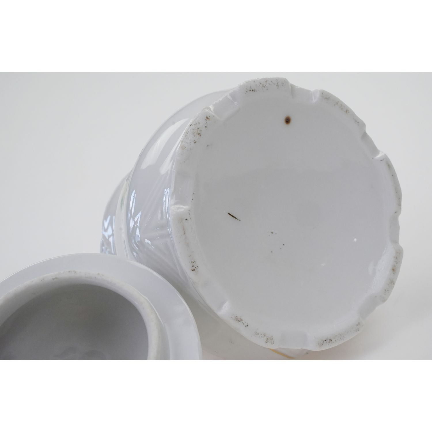 Nie posiada sygnatury. Wykonany z białej porcelany z reliefami, które podkreślono złoceniami. Na porcelanie fioletowe anemony.