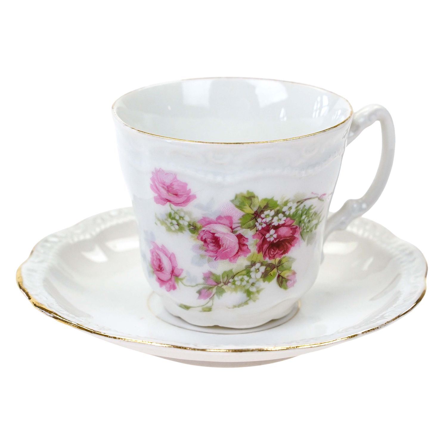 Stara filiżanka ze spodkiem z dekoracją w stylu secesyjnym, przedstawiającą gałązki kwitnących różyczek.