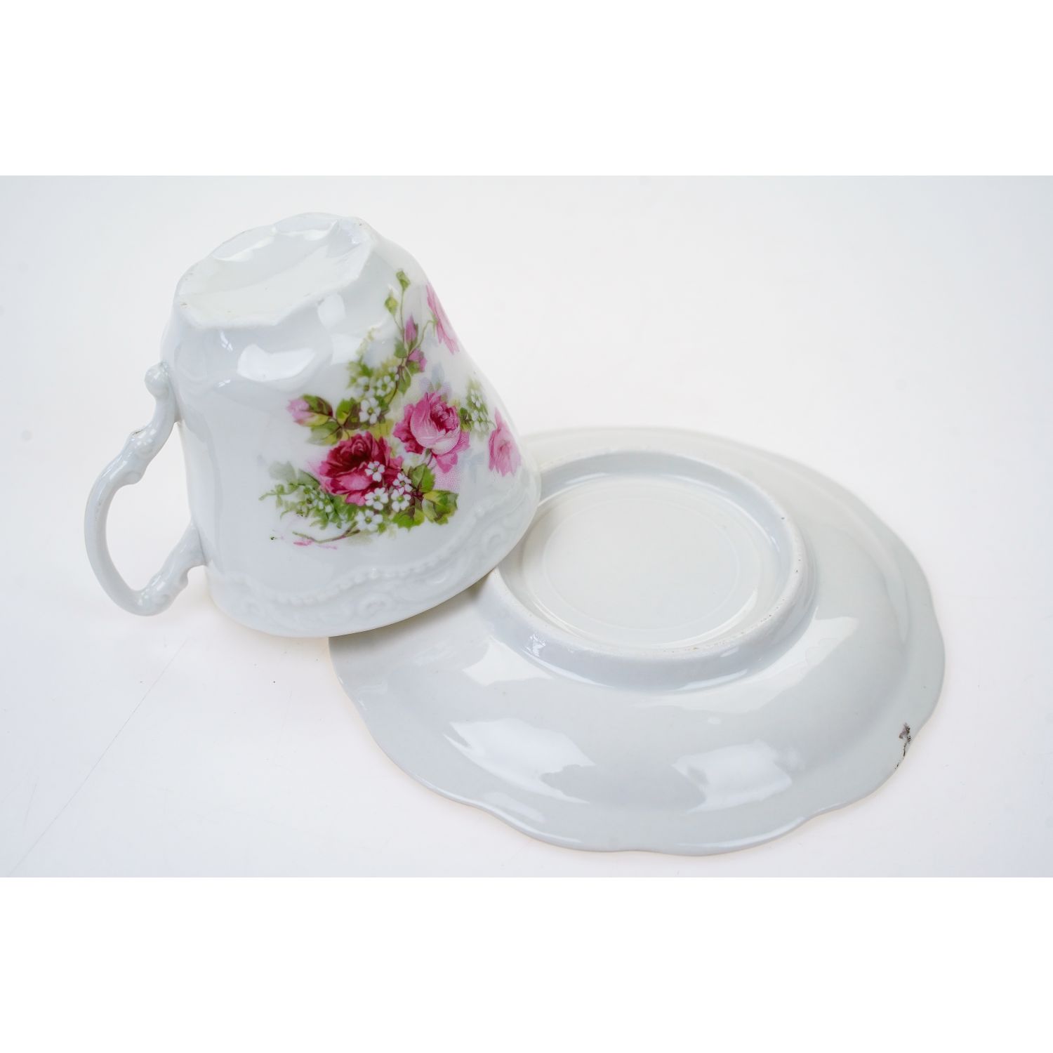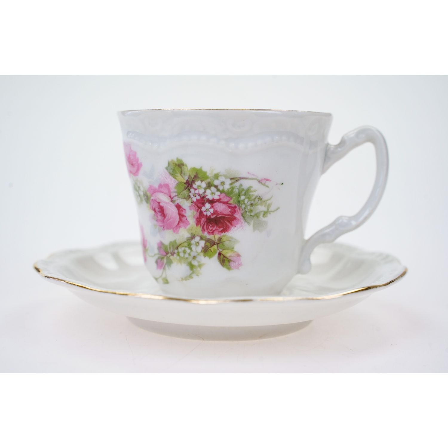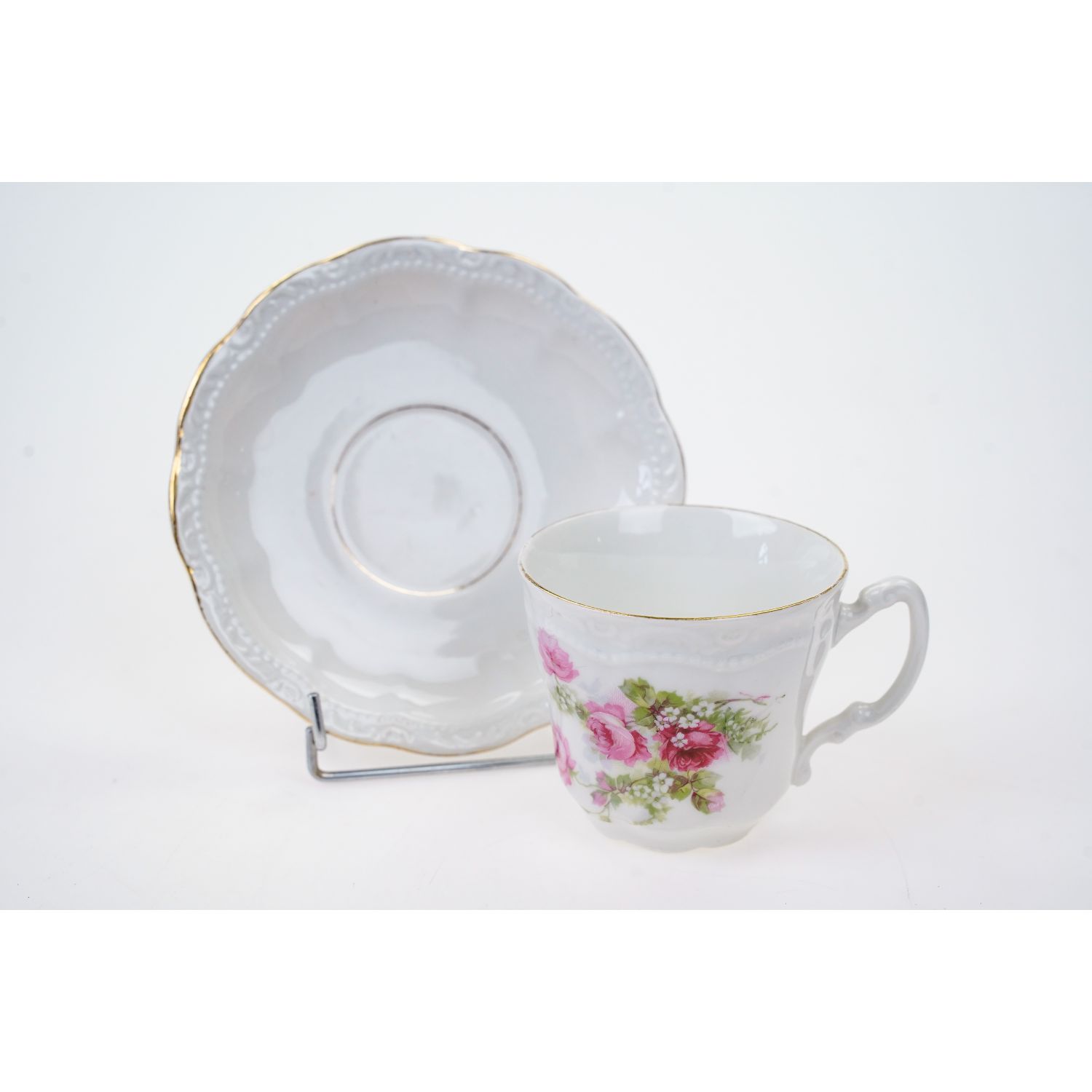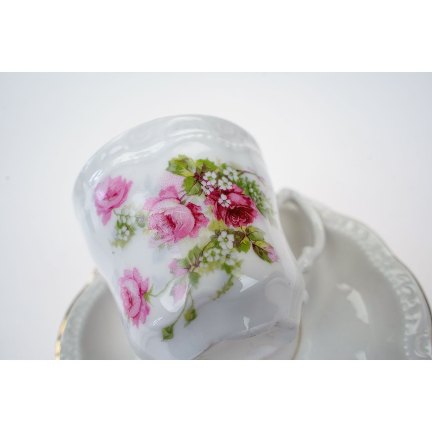 Porcelana nie jest sygnowana. Porcelana o klasycznej formie. Na porcelanie piękne reliefy i rzędy perlatur. Filiżanka ozdobiona śliczniutkimi kwiatami różyczek z jednej strony. Ranty kiedyś złocone, dzisiaj w śladowych ilościach.