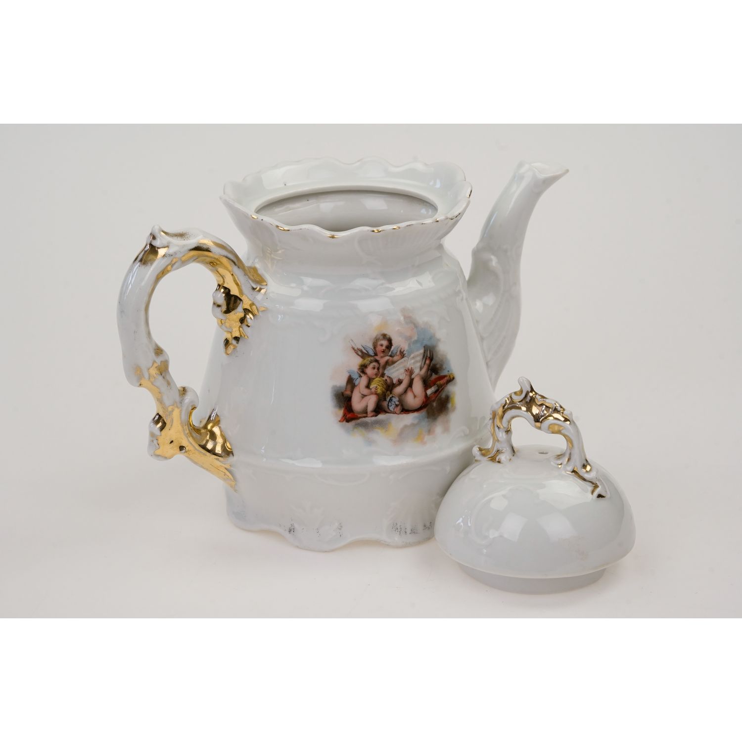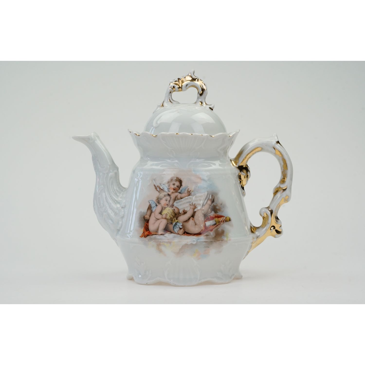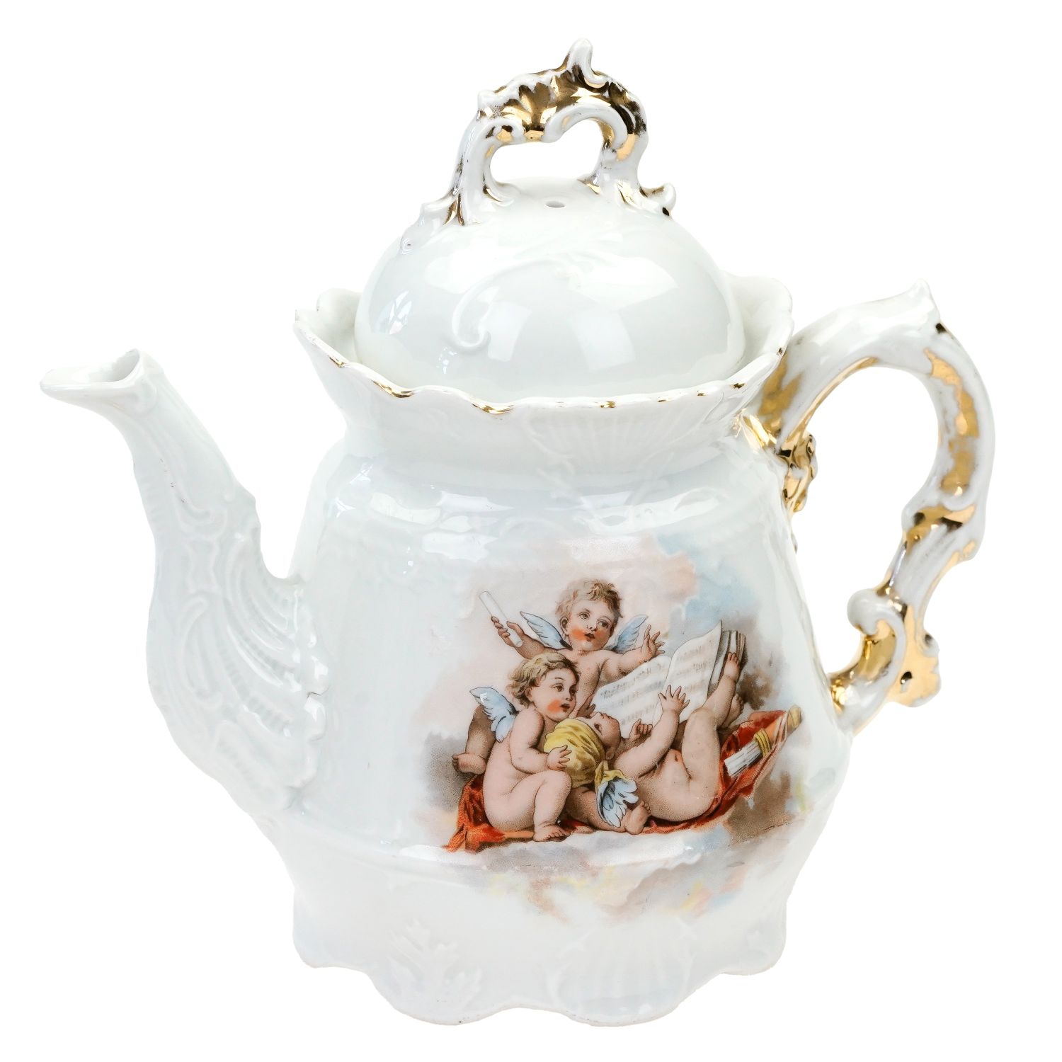 Prześliczny, stary dzban do herbaty, czajnik, imbryk z amorkami.