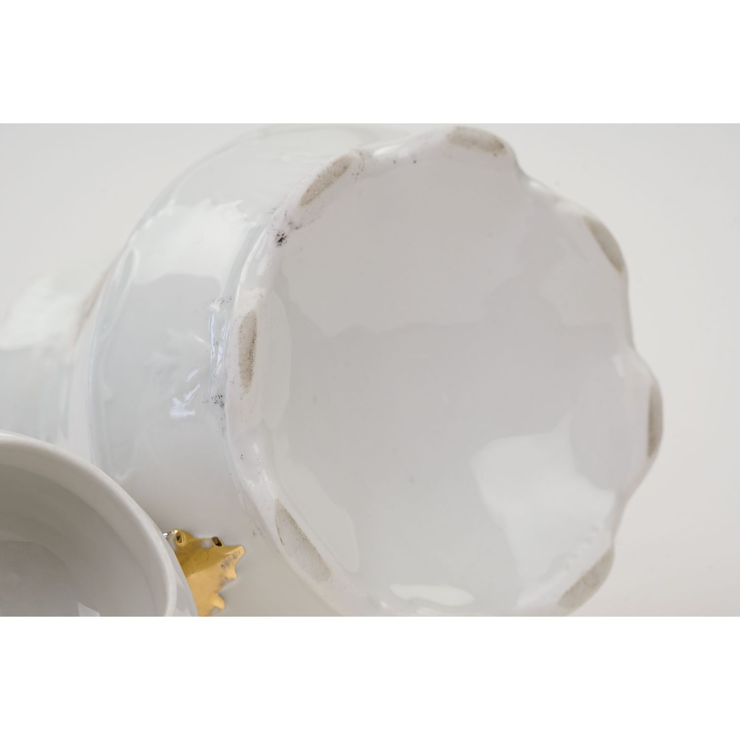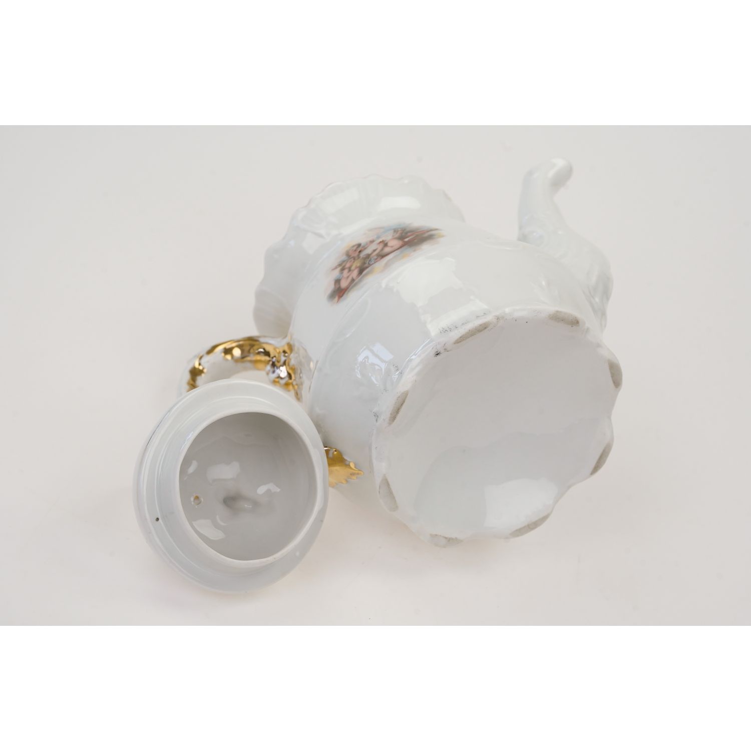Nie jest sygnowany. Pochodzi z początku XX wieku. Porcelana biała, szkliwiona, pokryta bogatymi reliefami o motywie roślinnym. Na dzbanku scenka trzy golasy, aniołki, amorki z drugiej strony nieco mniejsza dekoracja. Ucho i sterczynka w pełni złocone, ale mocno już otarte. Kontury w złoceniach, ale już poprzecieranych. Wyposażony w siteczko.