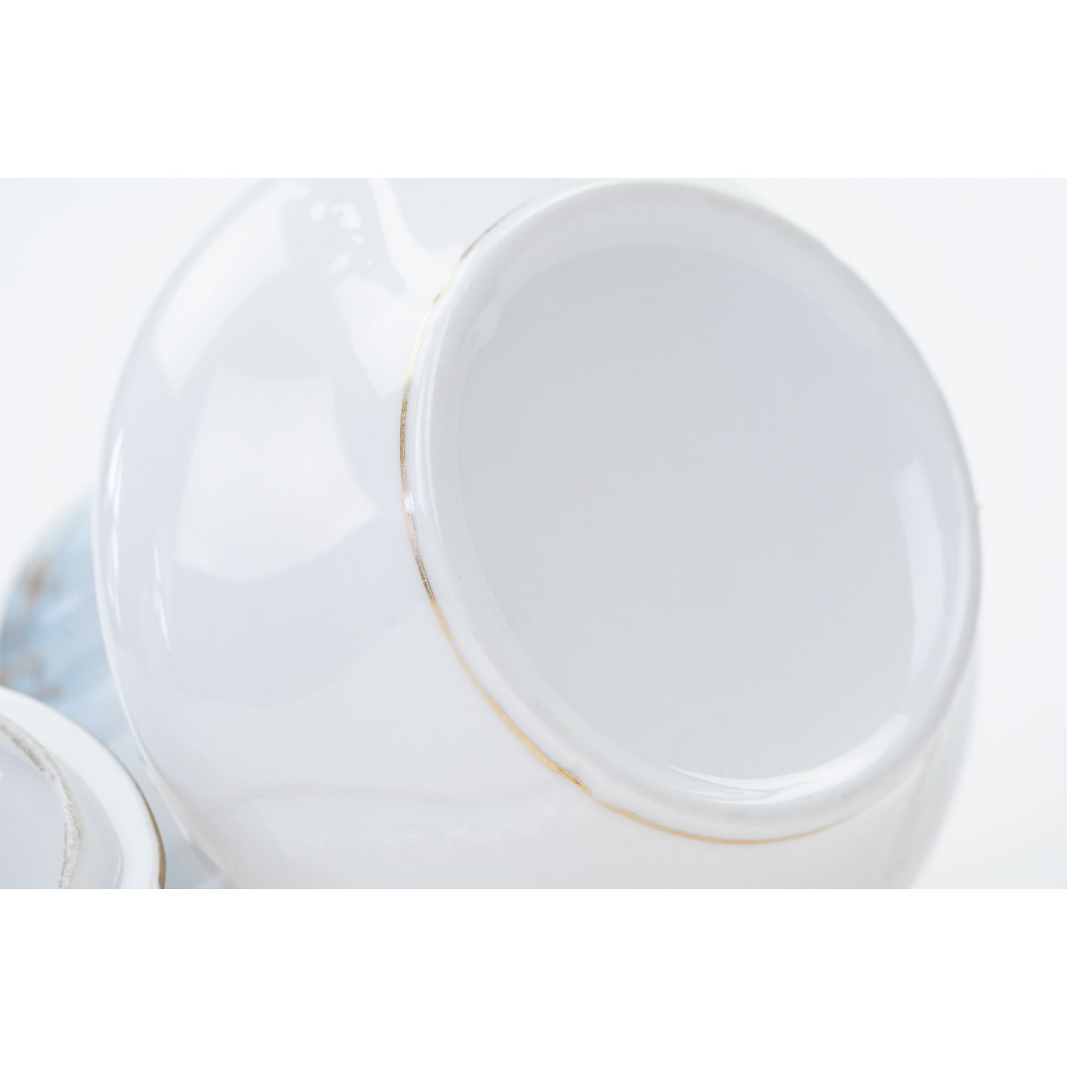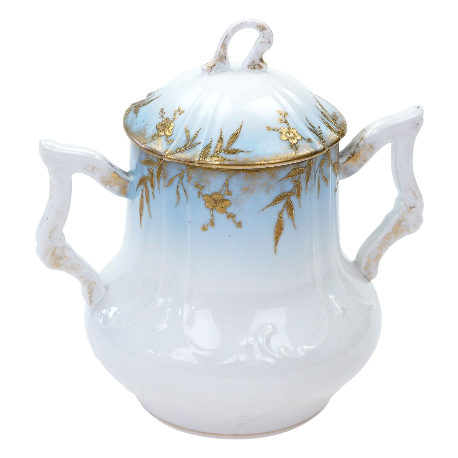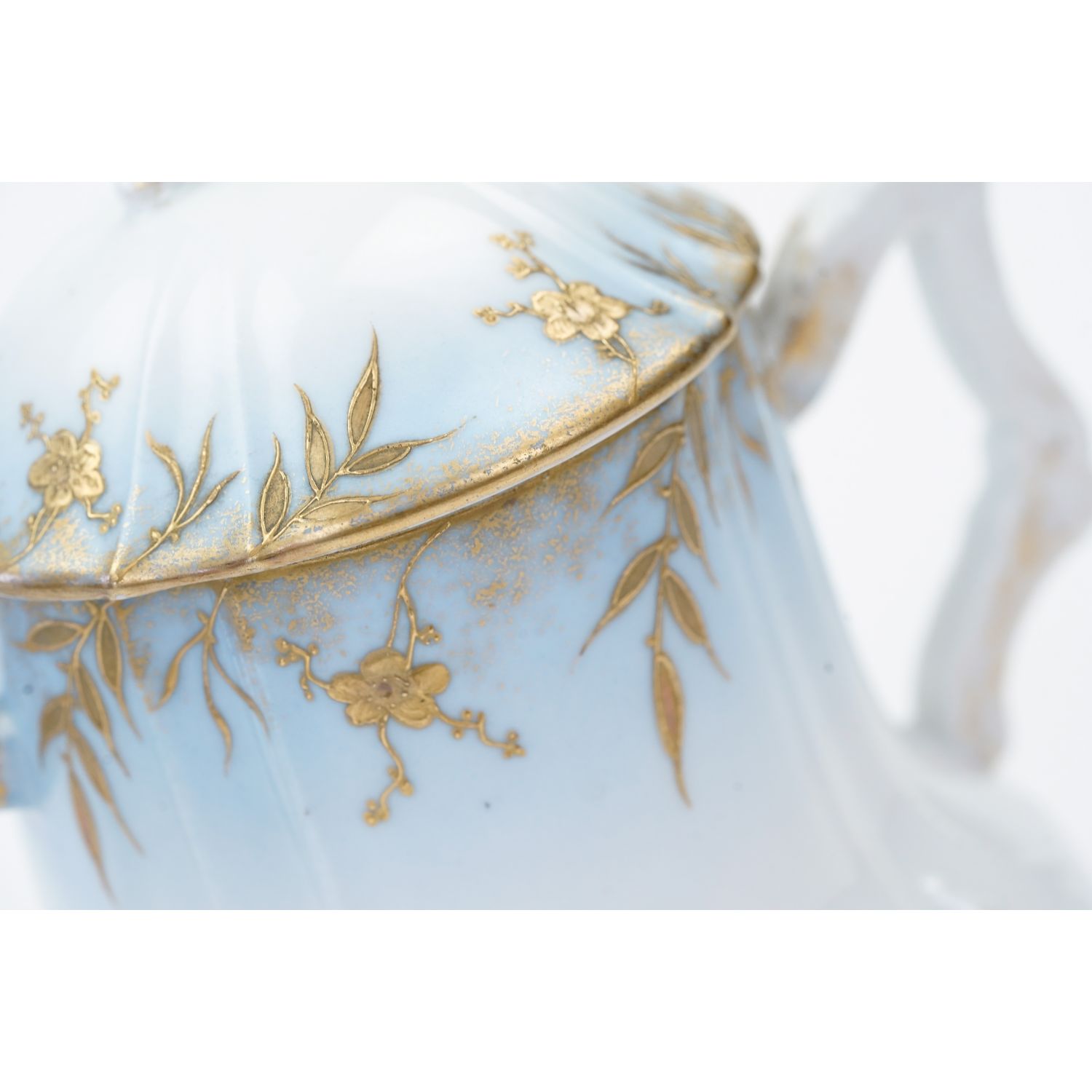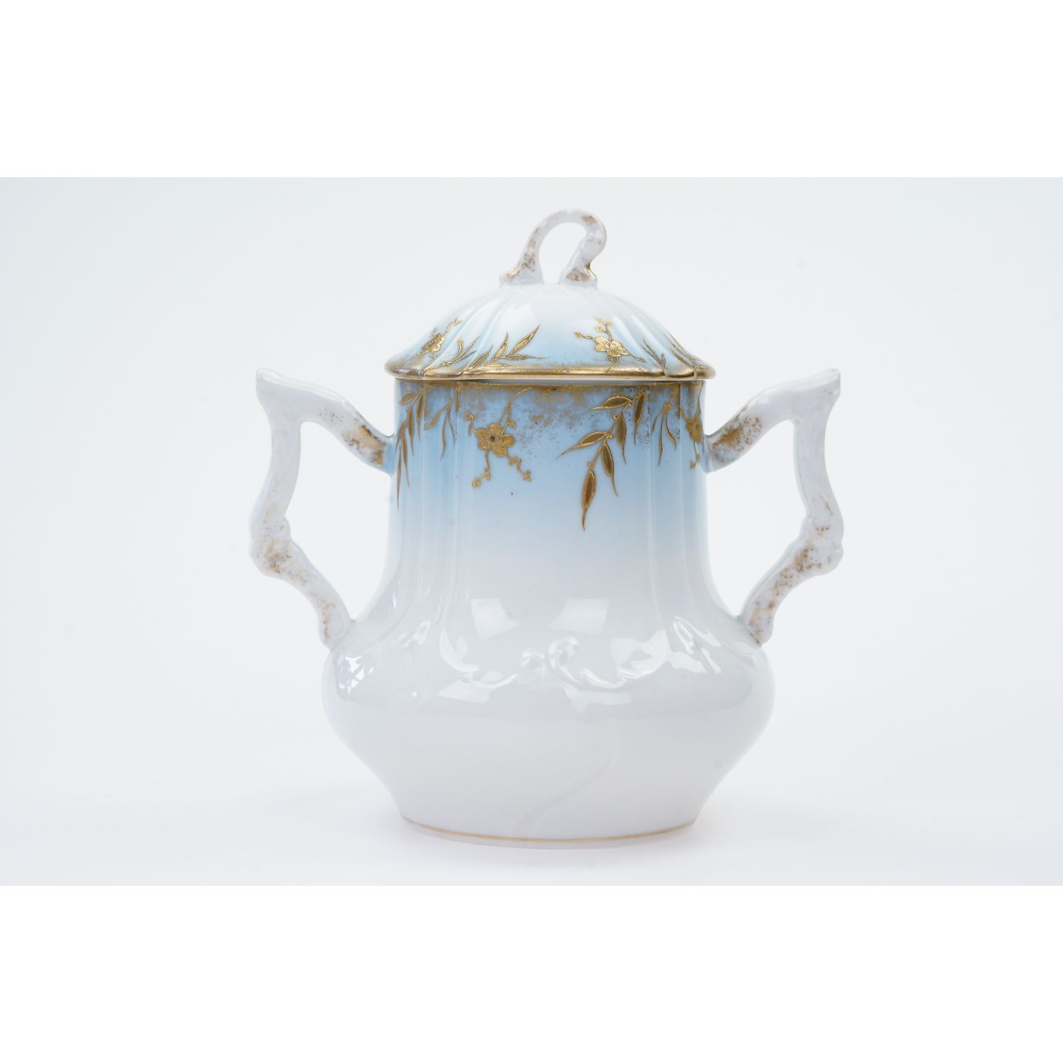 Prawdopodobnie pochodzi z Limoges, choć nie jest sygnowana. Piękna, biała, delikatna, reliefowana porcelana. Niezwykłe subtelne reliefy o motywie roślinnym, typowe dla epoki. Uszy przepięknie uformowane, sterczynka wypiętrzona. Przy górnej krawędzi i na brzegu pokrywy pokryta cieniowanym błękitem, a na nim złote ornamenty przedstawiające listeczki i kwiatuszki. Kontury oprószone złoceniami.