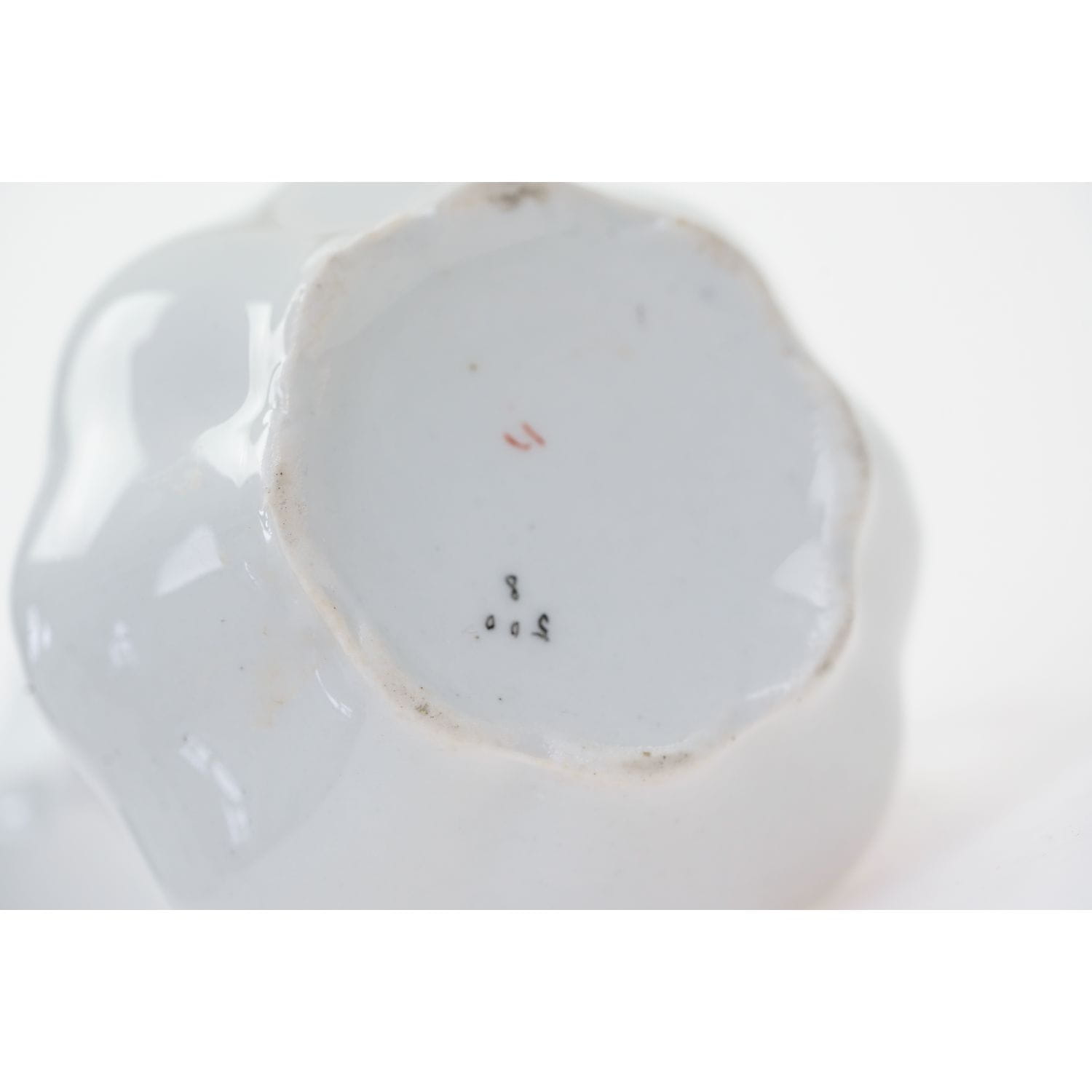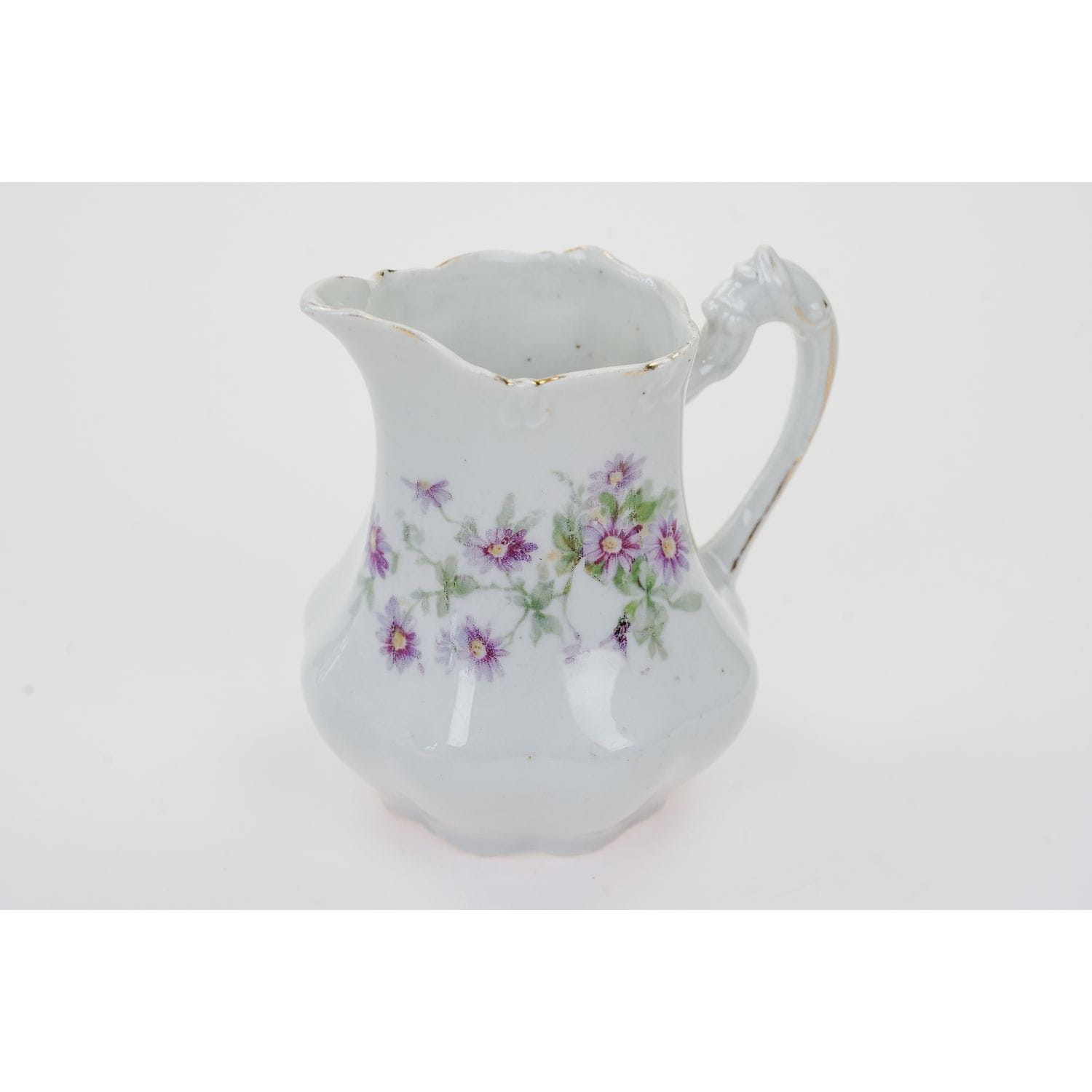 Sygnowany jedynie numerycznie. Wykonany z porcelany w odcieniu bieli, reliefowanej z ładnie uformowanymi uszami, wlewką i sterczynką. Porcelana pokryta wyrazistymi reliefami. Na niej fioletowe drobne kwiatuszki. Ranty złocone. Do tego oprószone złotem uszka brzegi i stercznka. Dzbanek lekko się chwieje.