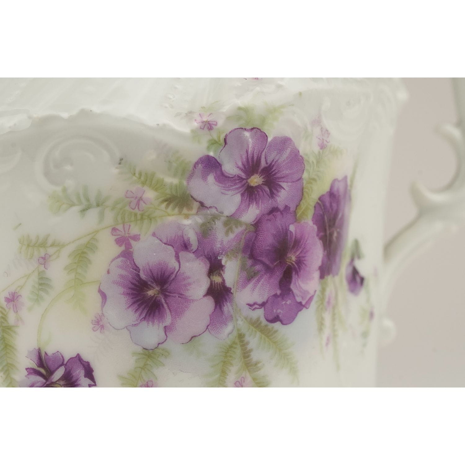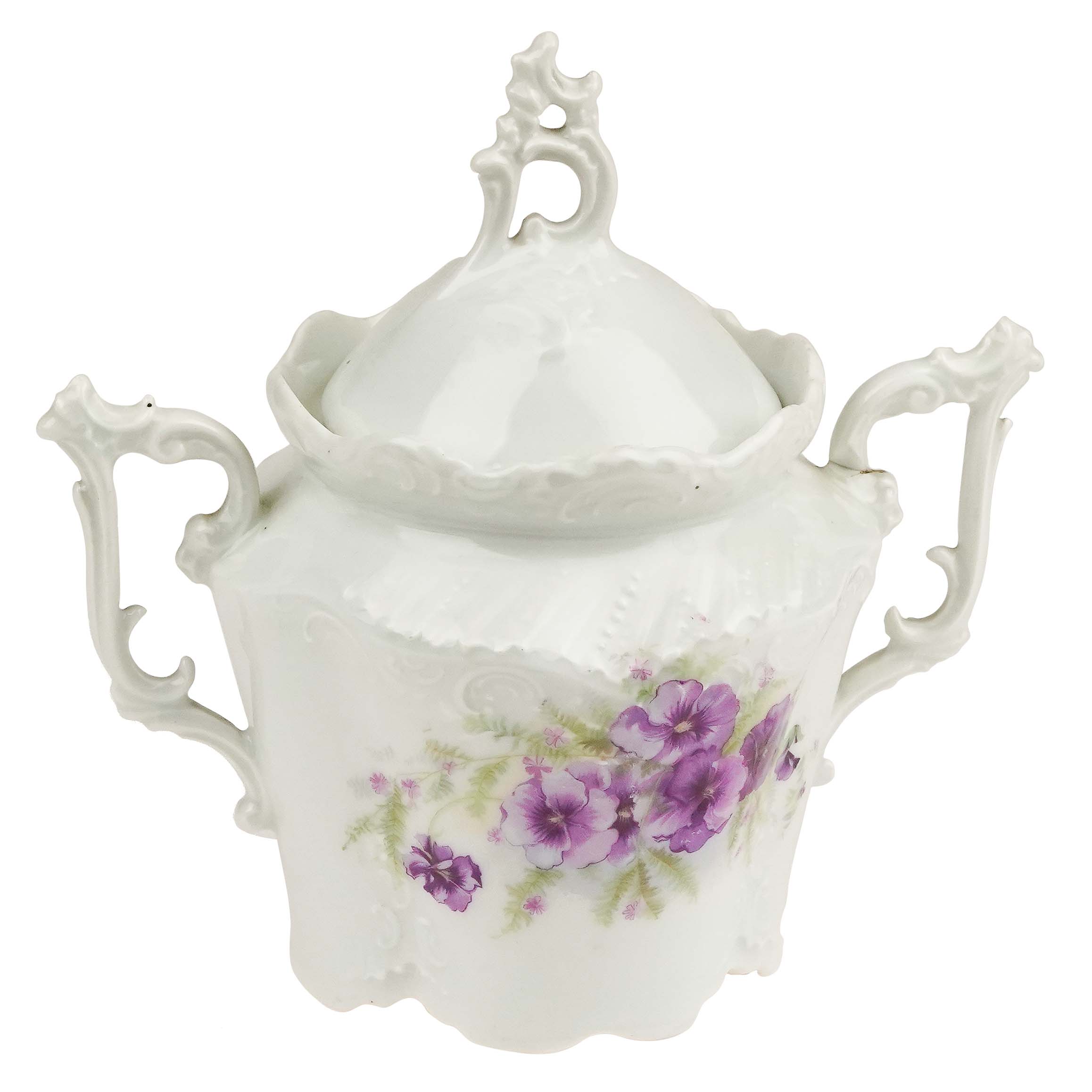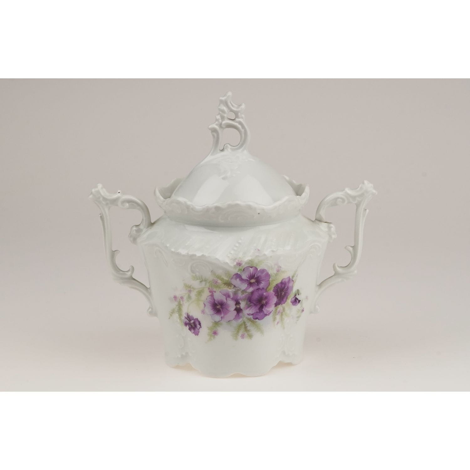 Nie posiada sygnatury. Wykonana z porcelany w odcieniu bieli z przepięknymi reliefami. Uszy bardzo ładnie uformowane i sterczynka w kształcie płomienia. Na cukiernicy z jednej strony duży bukiet fioletowych bratków, z drugiej mniejszy.