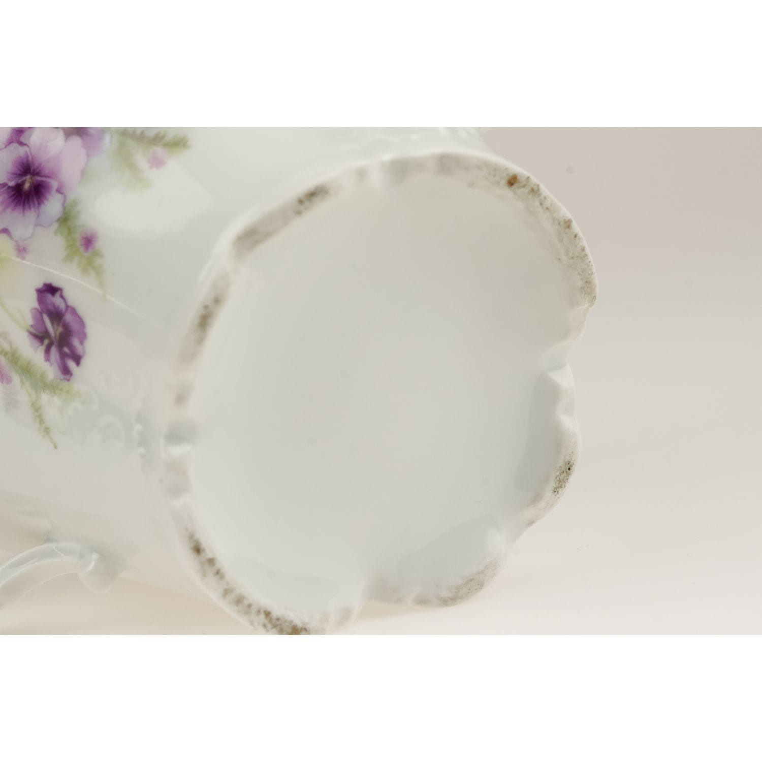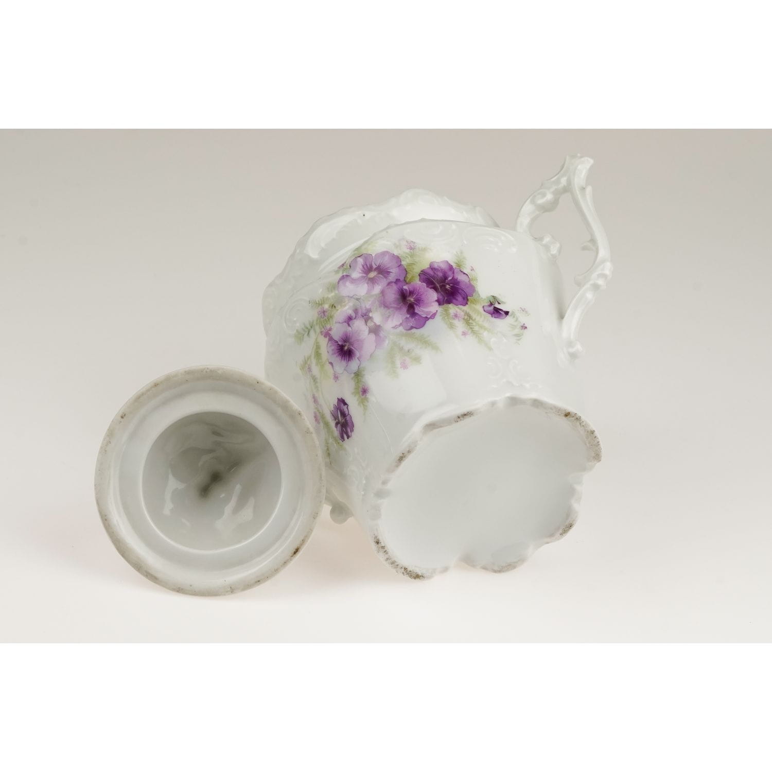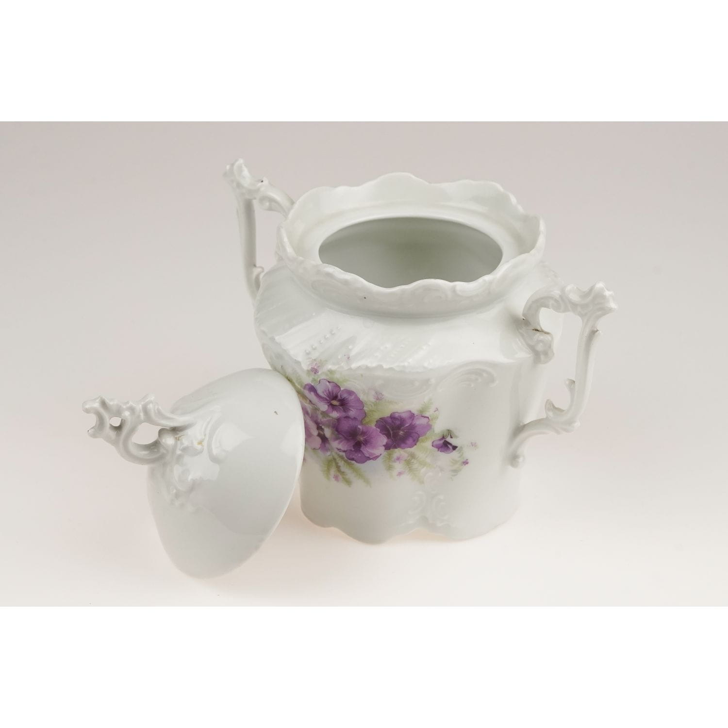 Nie posiada sygnatury. Wykonana z porcelany w odcieniu bieli z przepięknymi reliefami. Uszy bardzo ładnie uformowane i sterczynka w kształcie płomienia. Na cukiernicy z jednej strony duży bukiet fioletowych bratków, z drugiej mniejszy.