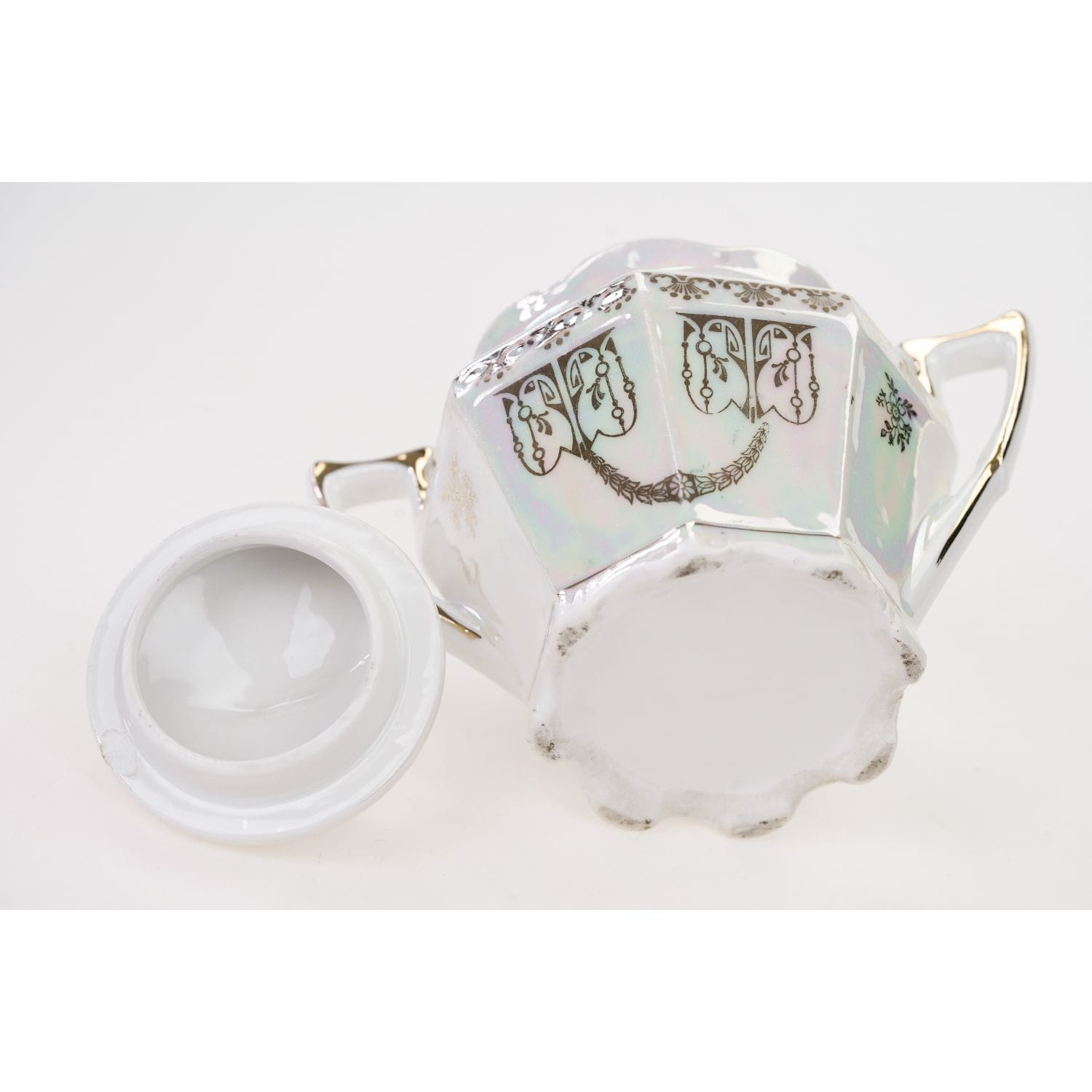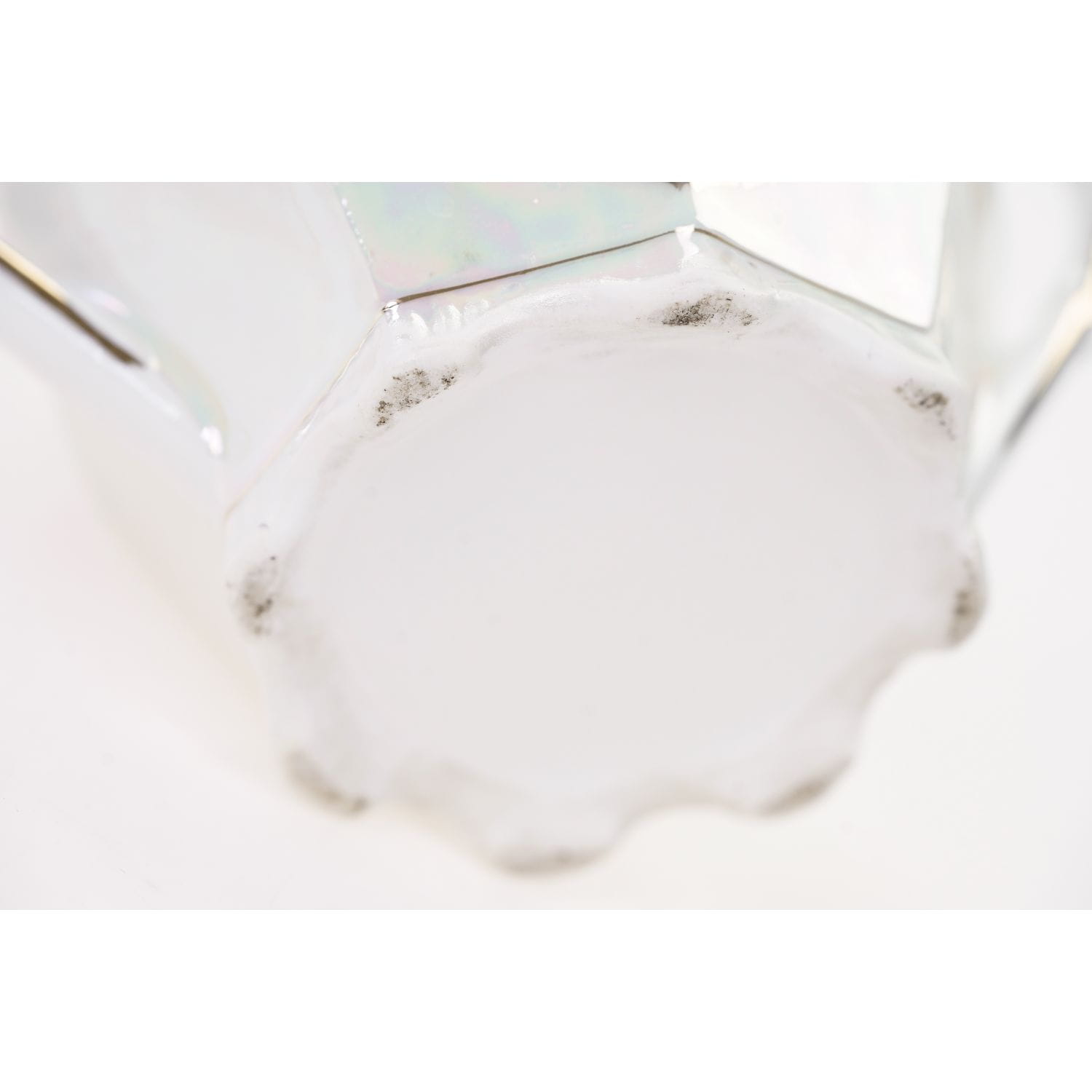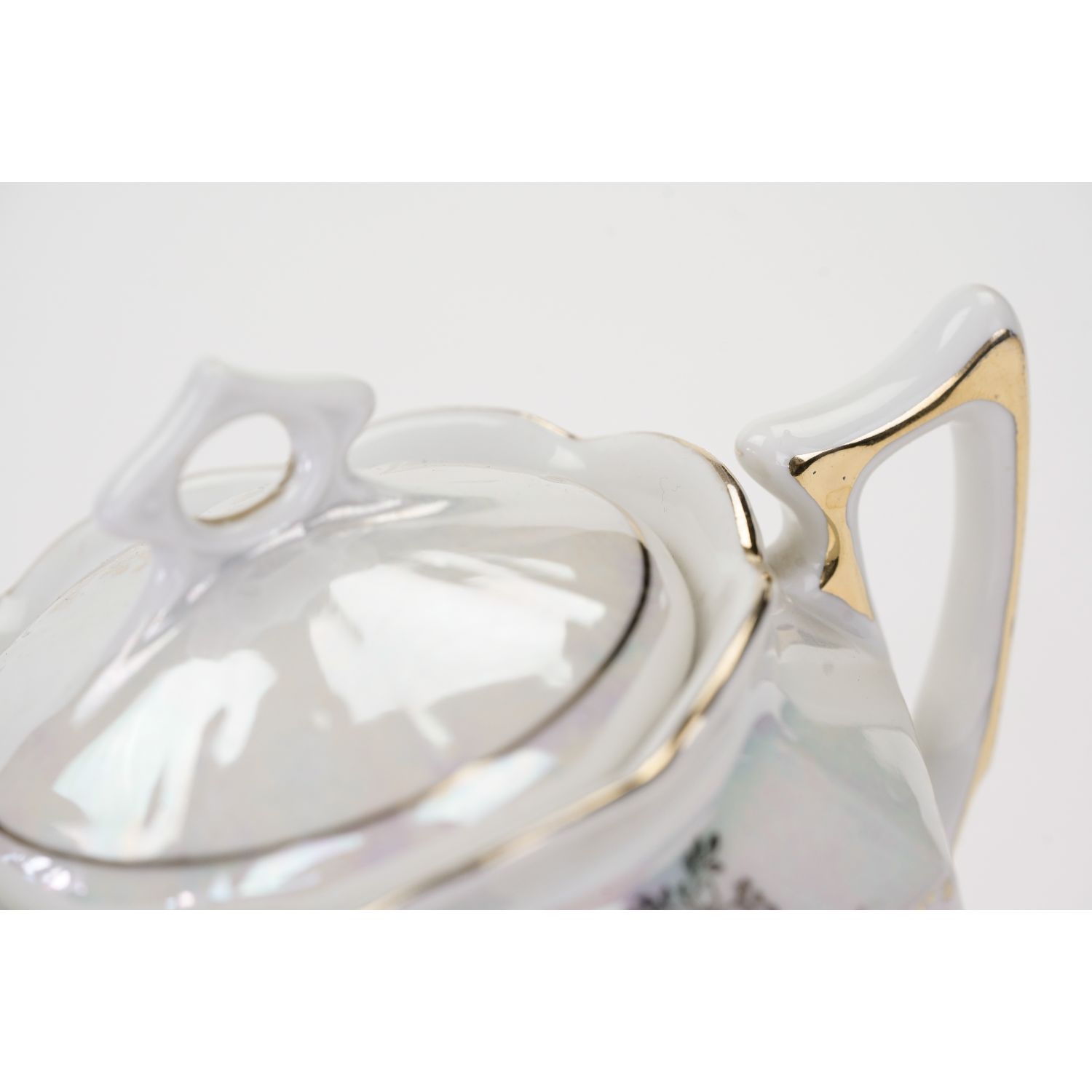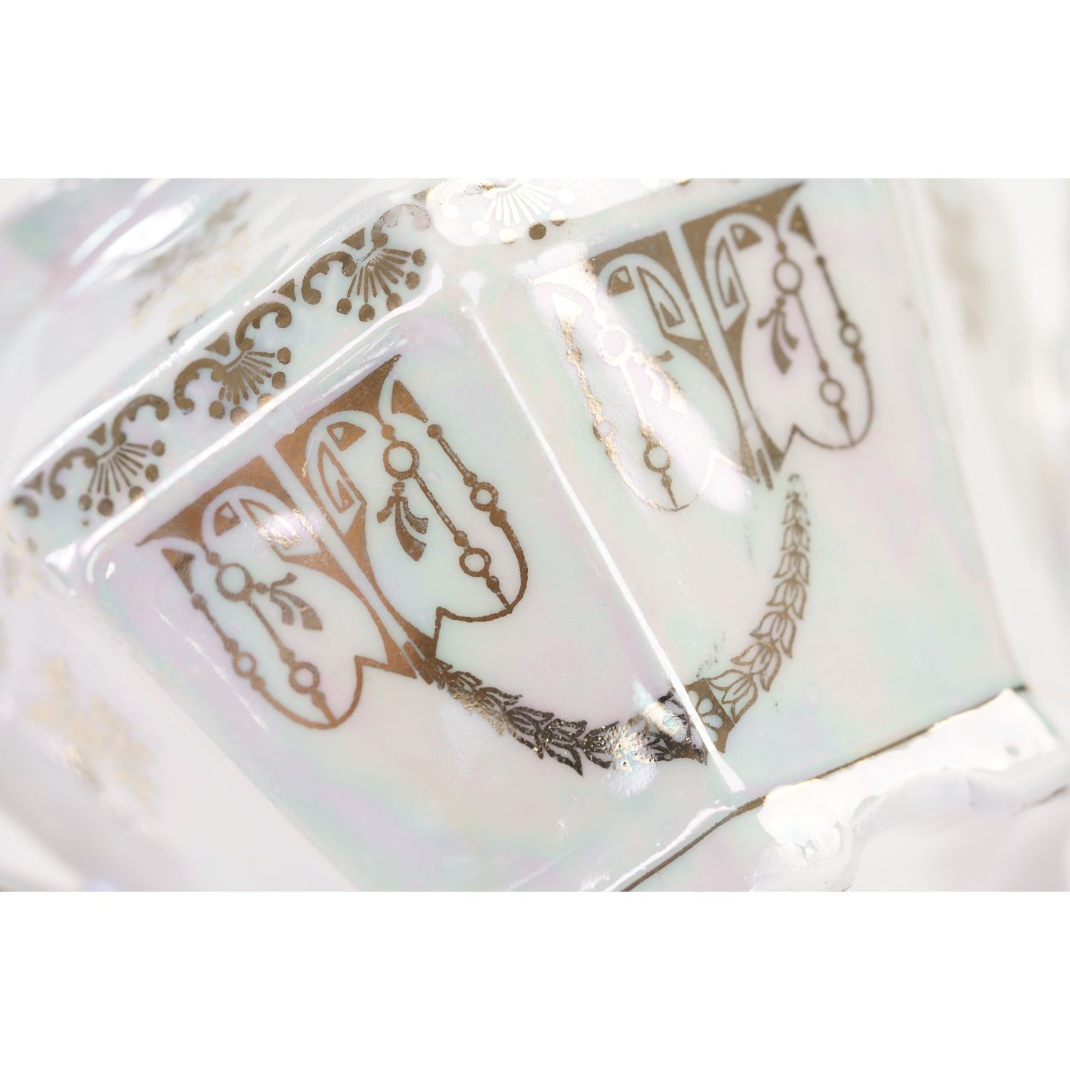 Nie posiada sygnatury lecz jedynie numeryczne wyciski w masie. Porcelana w odcieniu bieli, o strzelistej formie i graniastych kształtach. Powierzchnia w dużej części powleczona opalizowaną, mieniącą się powłoką. Na niej śliczne, złote ornamenty w postaci kwiatowych girland, liści. Ranty, uszka w złoceniu.