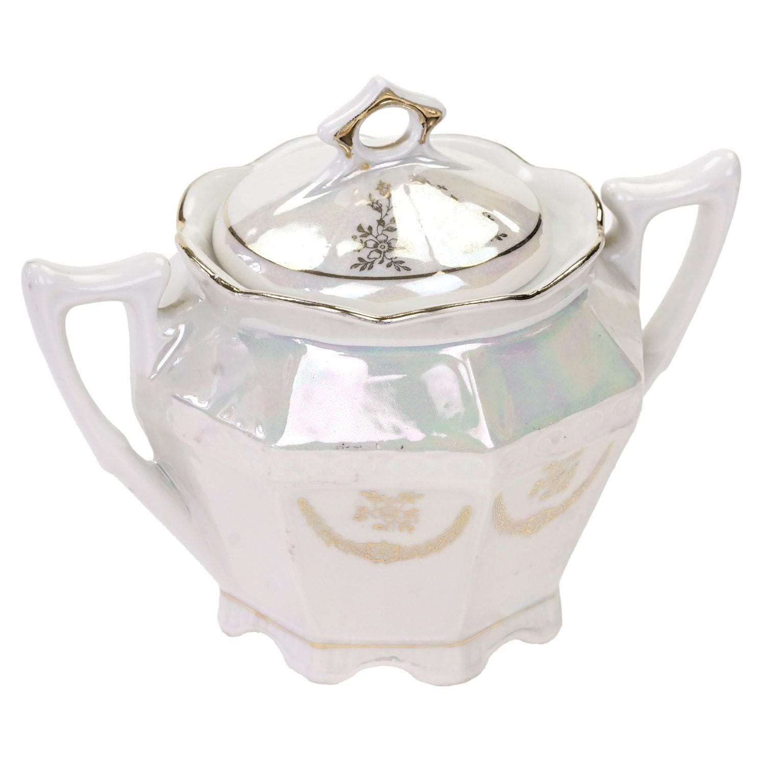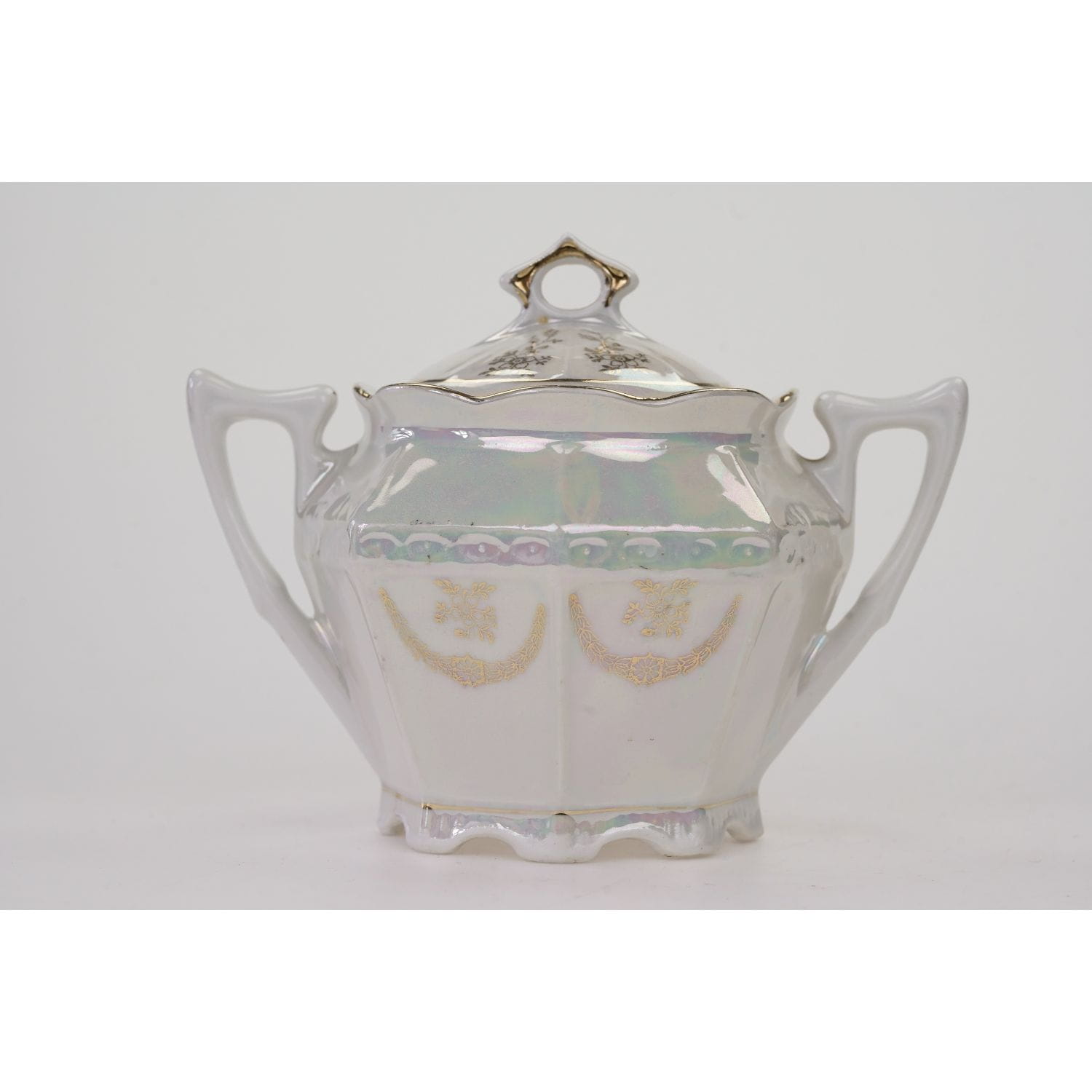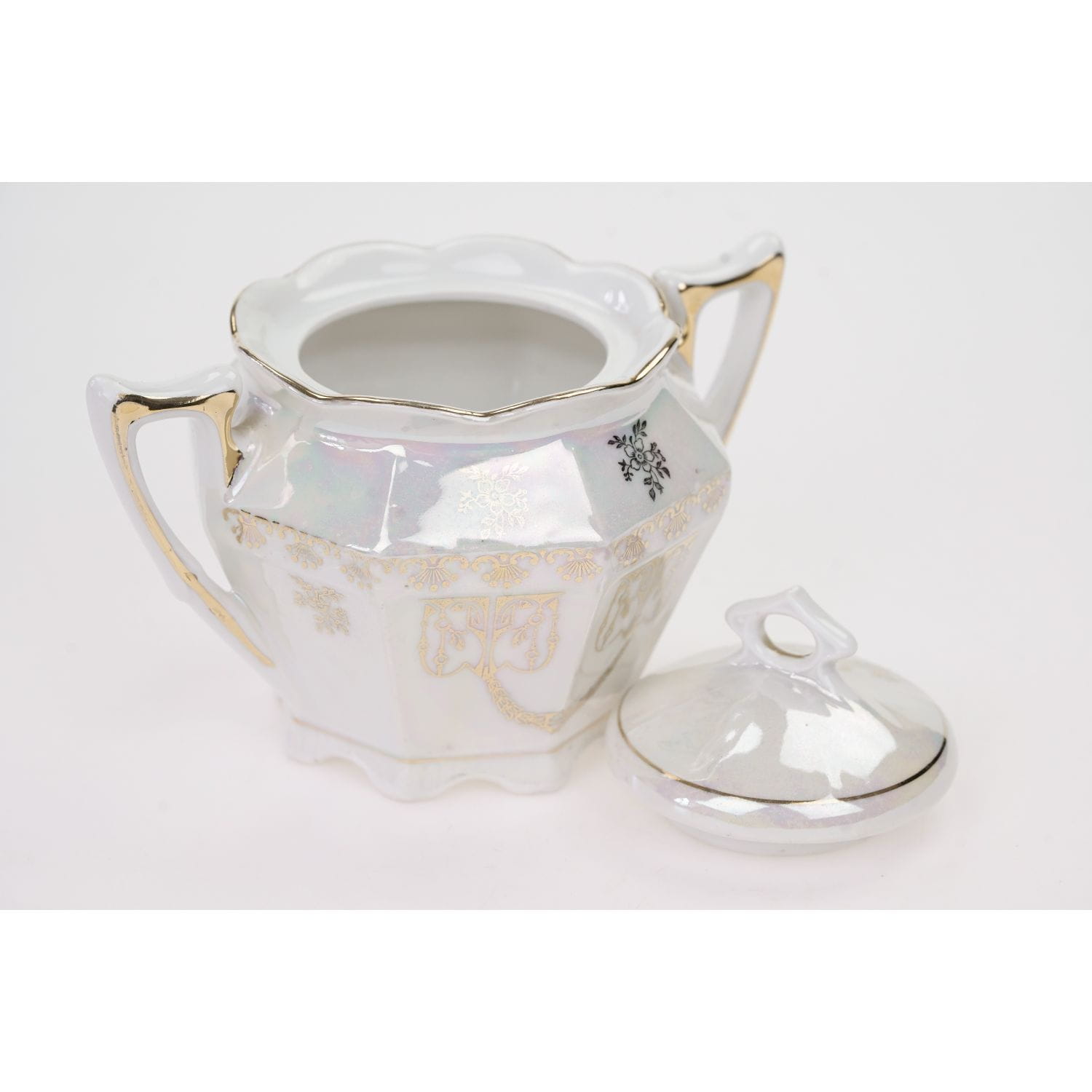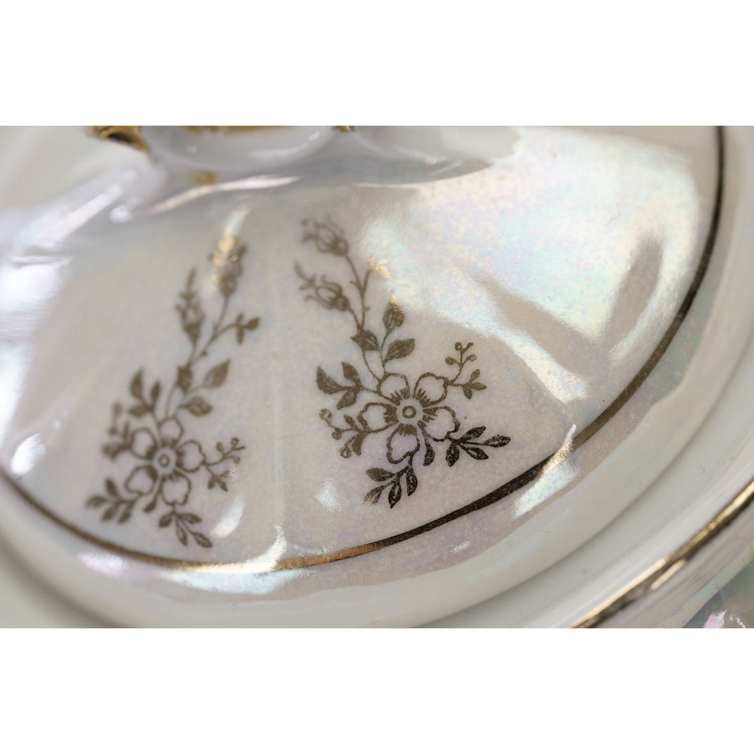 Nie posiada sygnatury lecz jedynie numeryczne wyciski w masie. Porcelana w odcieniu bieli, o strzelistej formie i graniastych kształtach. Powierzchnia w dużej części powleczona opalizowaną, mieniącą się powłoką. Na niej śliczne, złote ornamenty w postaci kwiatowych girland, liści. Ranty, uszka w złoceniu.