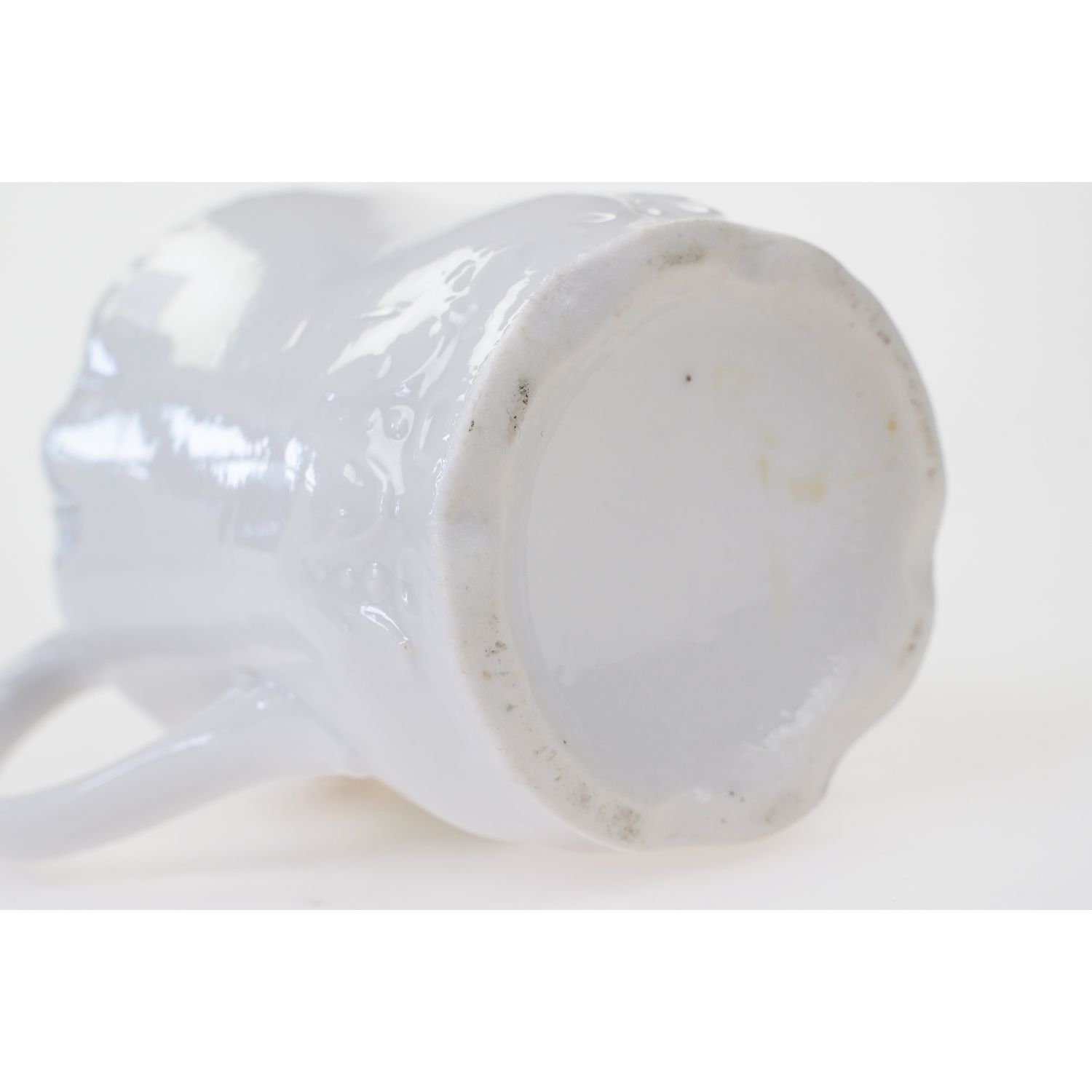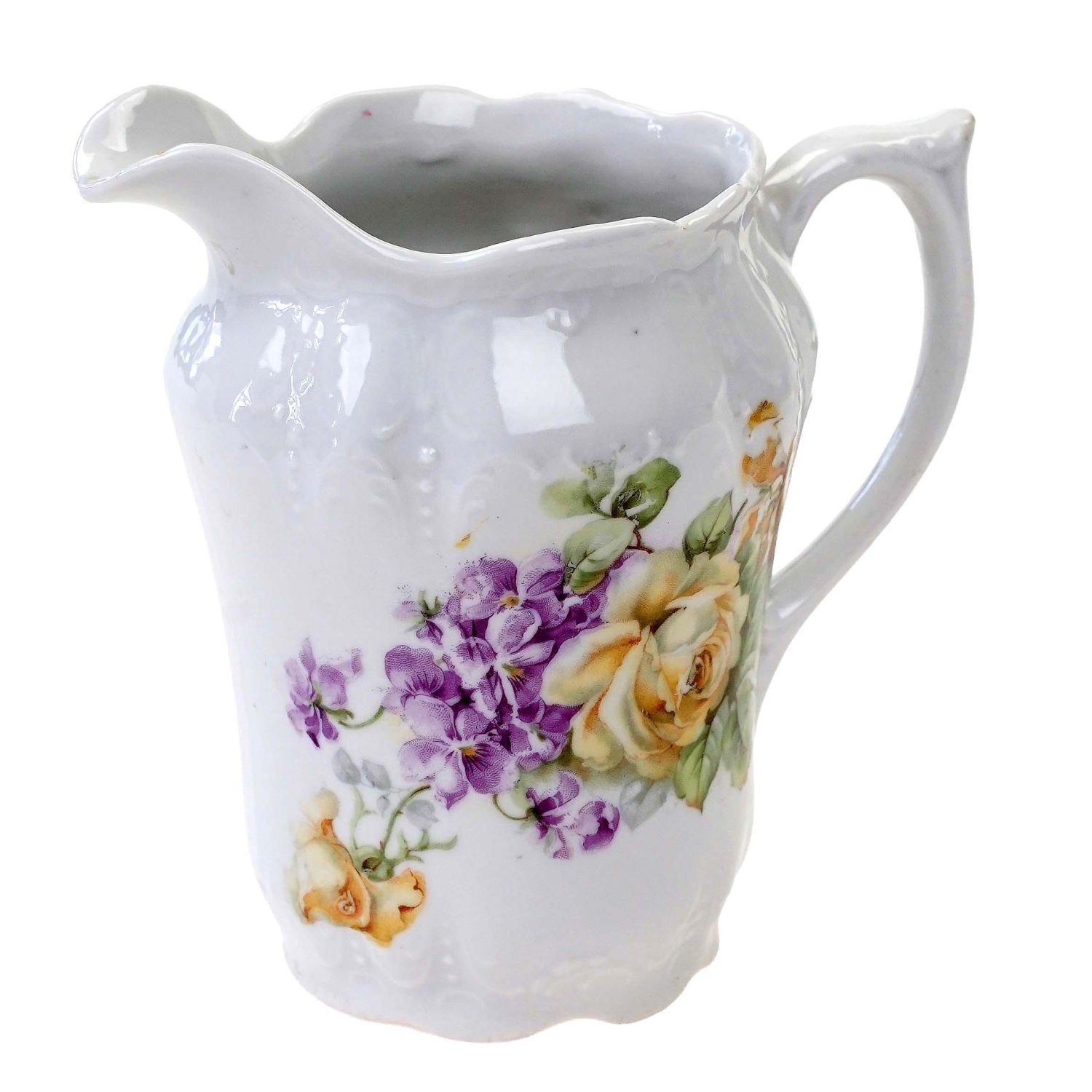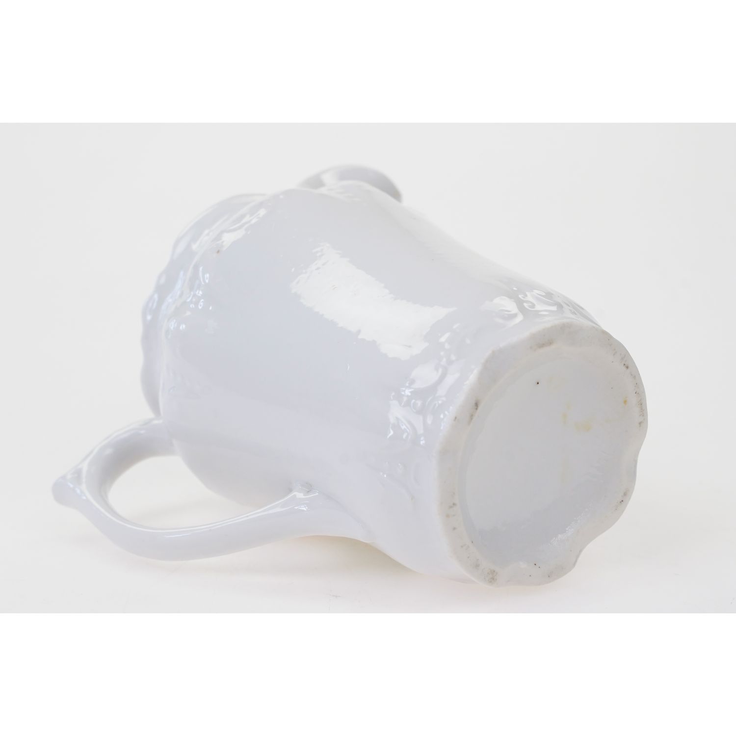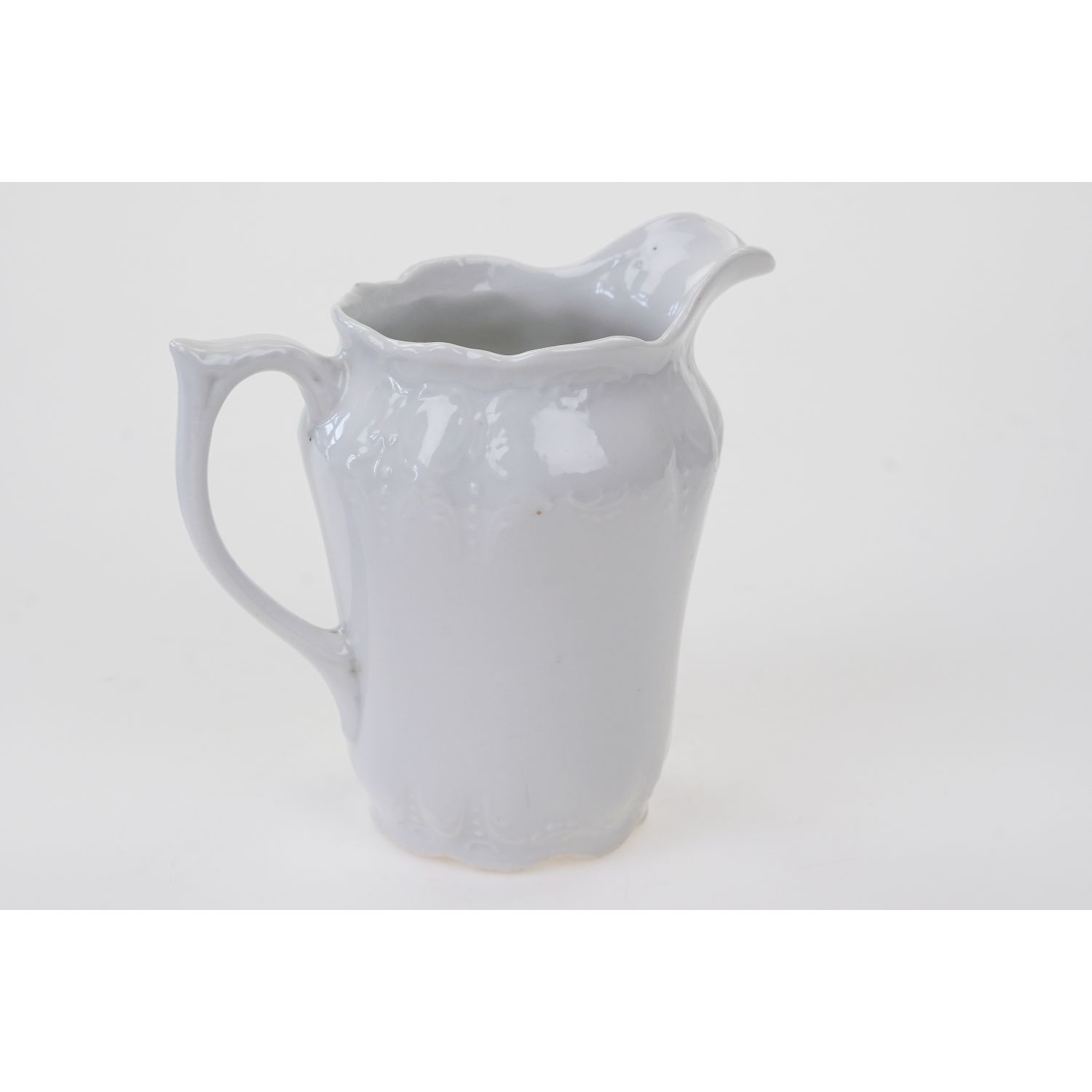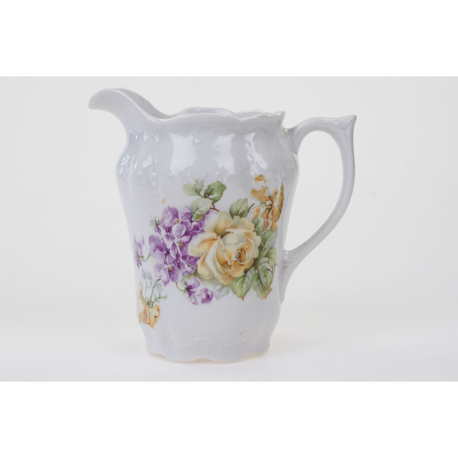 Nie jest sygnowany. Piękna porcelana w kolorze białym, cudownie reliefowana. Na dzbanuszku reliefy o motywie roślin bardzo wyraziste w towarzystwie perlatur. Z pięknie uformowanym uchem. Klasyczna forma, ponadczasowy kształt. Na dzbanku herbaciane róże i fiołki z zielonymi listkami z jednej strony.