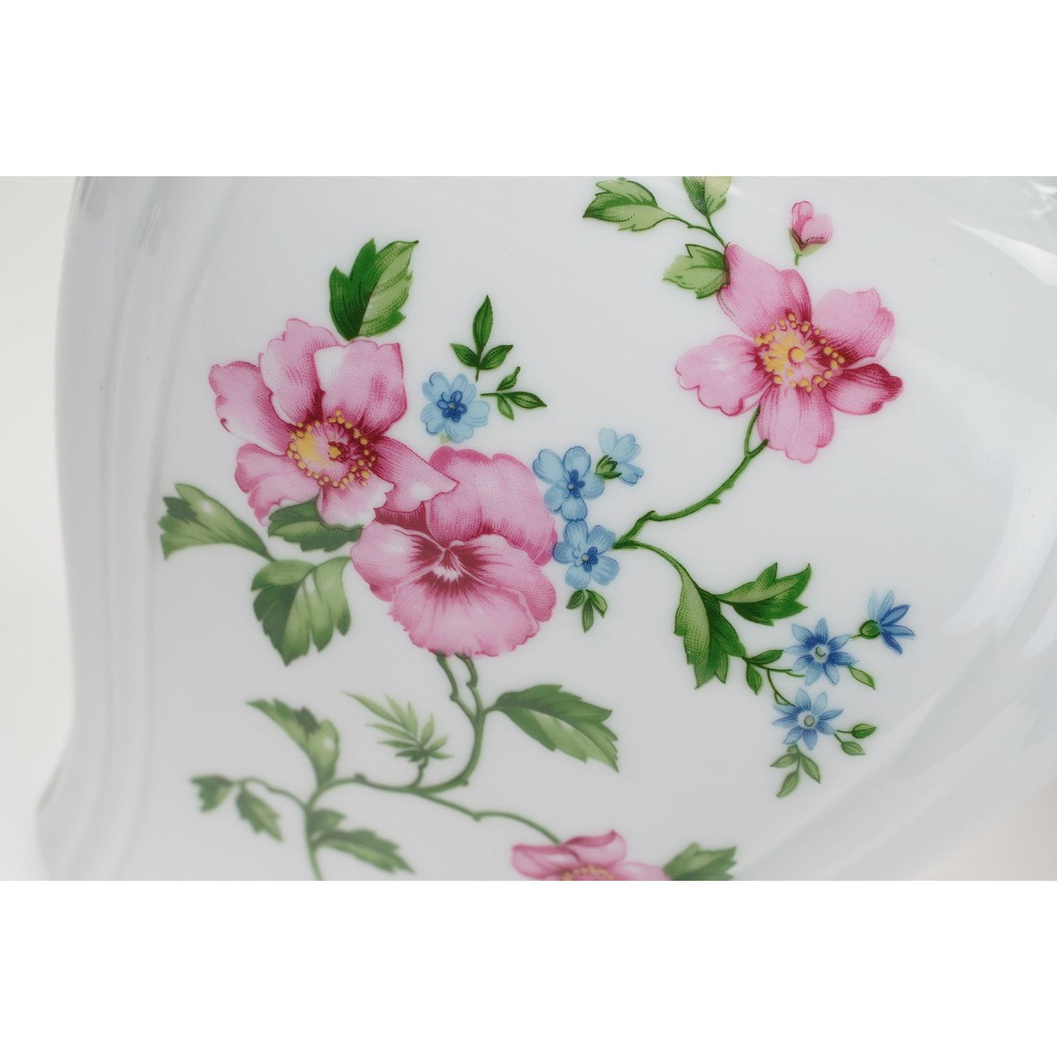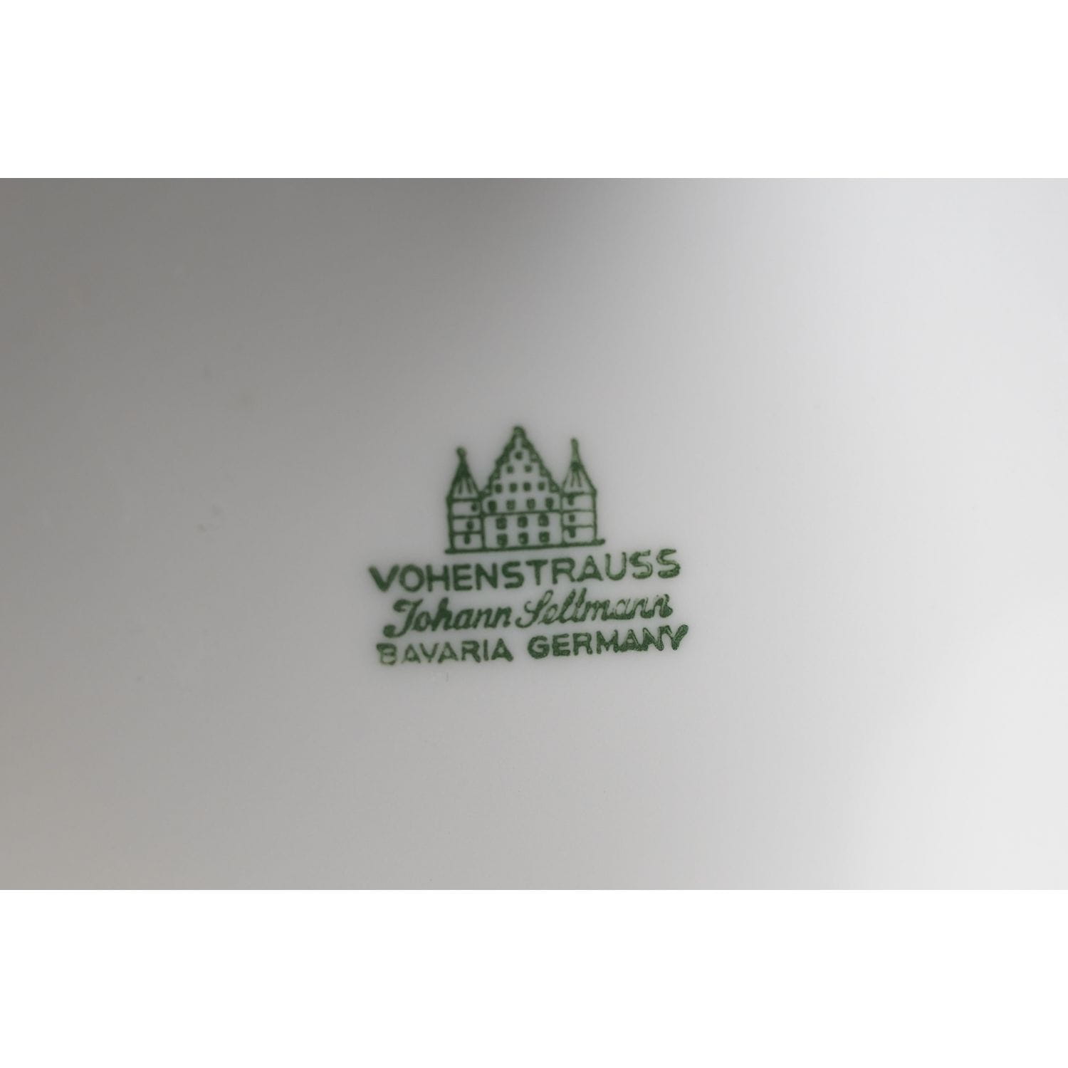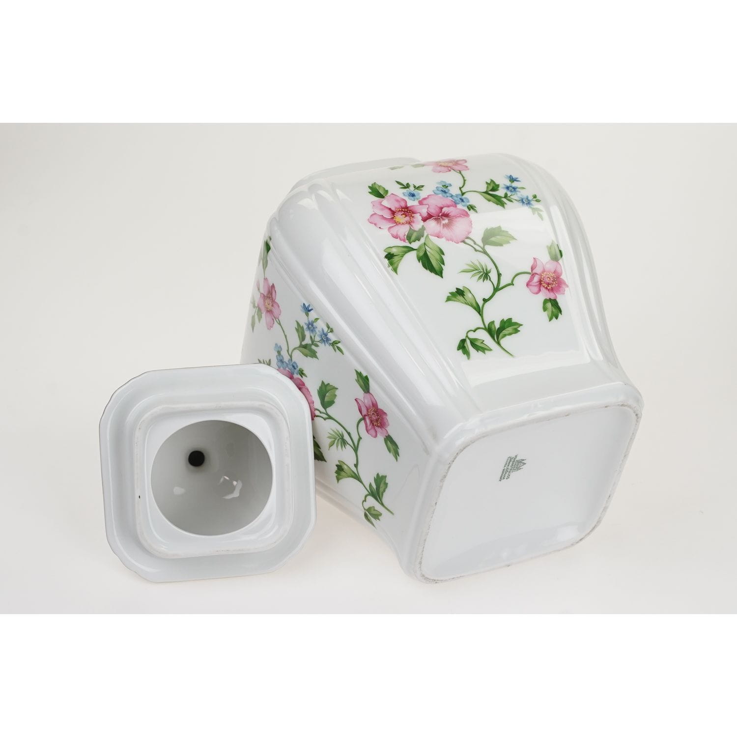 Pochodzi z Vohenstrauß z Porzellanfbrik Johann Seltmann. Sygnowana znakiem stosowanym po 1945 roku. Piękna porcelana w kolorze białym, o klasycznej formie na graniastej podstawie. Na całej powierzchni gałązki z różowymi kwiatami z niebieskimi akcentami. Kontury obwiedzione złoceniem.