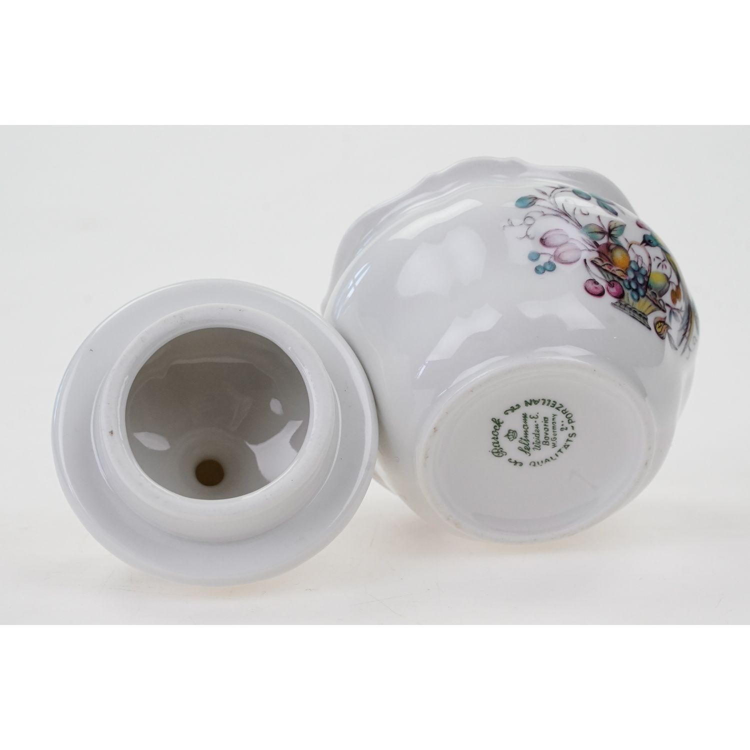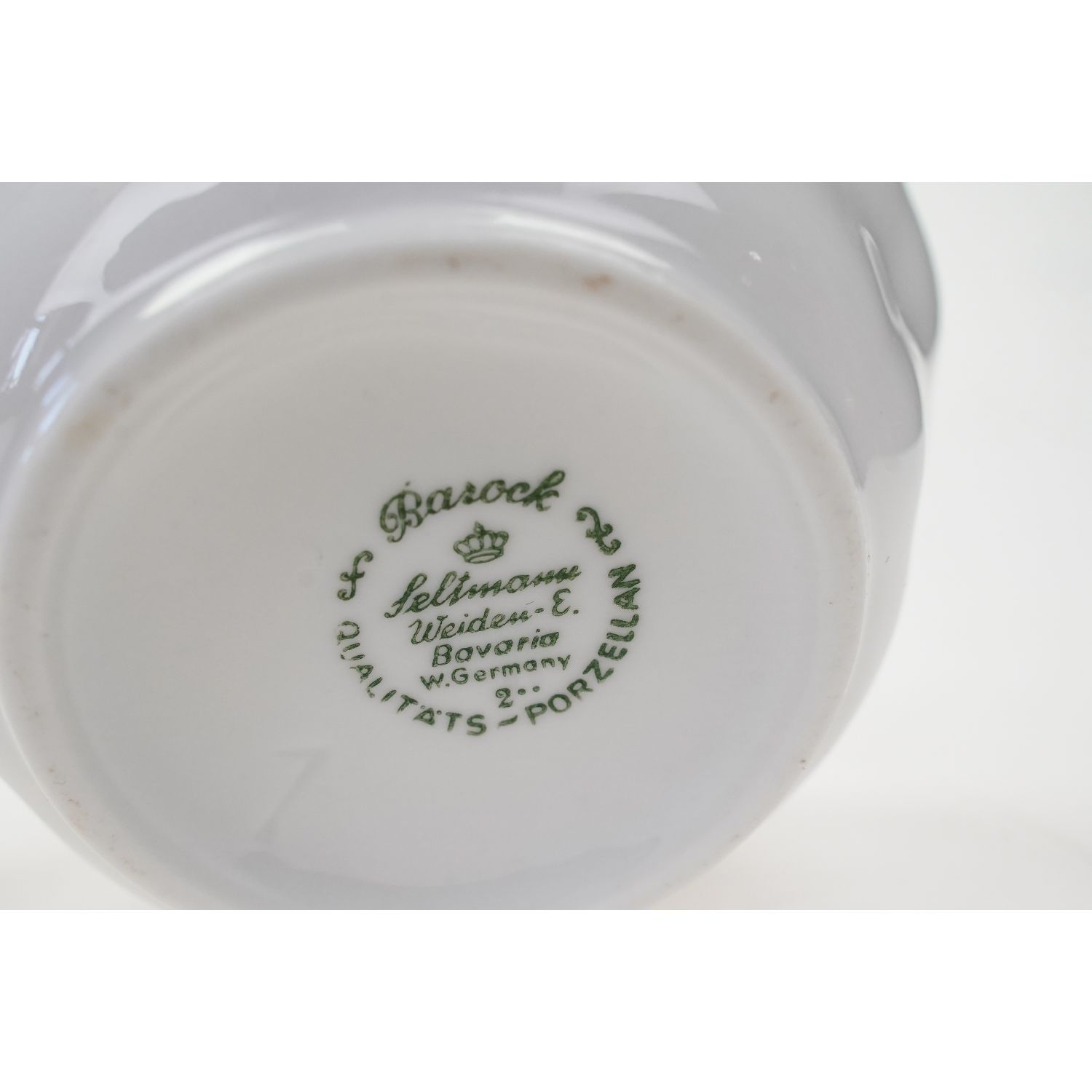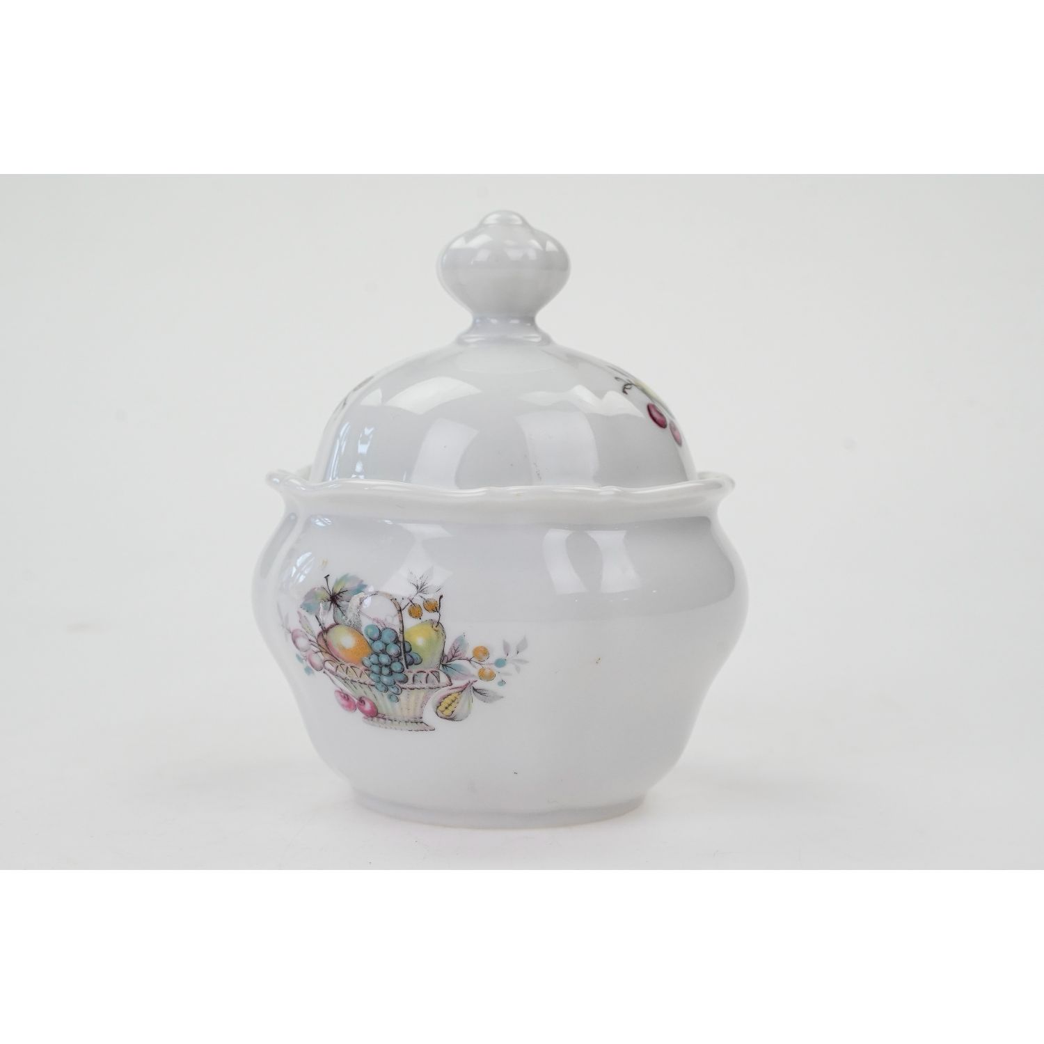 Pochodzi z Bawarii z miejscowości Weiden z Porzellanfabrik Christian Seltmann. Sygnowana znakiem stosowanym od 1949 roku. Fason Barock. Porcelana biała o eleganckich kształtach. Na cukierniczce dekoracje przedstawiające rajskie ptaki i kosze owoców. Sterczynka w kształcie korony.