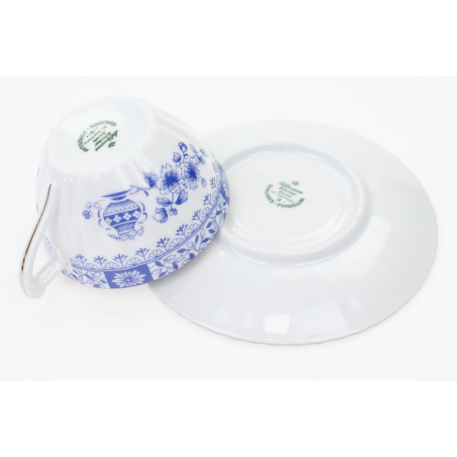 Spodek pochodzi z Weiden z Porzellanfabrik Christian Seltmann. Sygnowana znakiem stosowanym od 1949 roku. Filiżanka sygnowana jak na zdjęciu. Porcelana biała, szkliwiona zdobiona motywem China Blau. Ranty złocone. Cała porcelana pokryta kanelowaniem/karbowaniem.