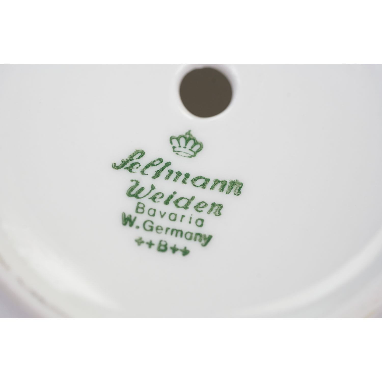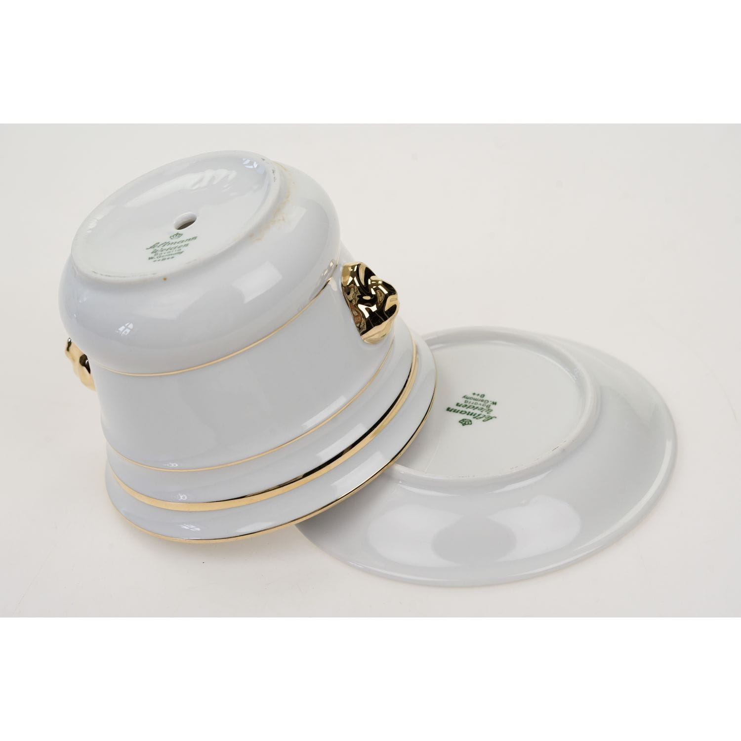 Pochodzi z niemieckiej wytwórni porcelany Seltmann, Weiden, Bawaria. Sygnowana znakiem stosowanym od 1949 roku oraz wyciskiem w masie. Doniczka wykonana z wysokiej jakości, dość grubej, porcelany. Uszy w postaci maszkaronów, złocone. Ranty i brzusiec udekorowany złotymi konturówkami. Podstawka prosta z uniesionym ku górze kołnierzykiem i złoceniem na rancie.