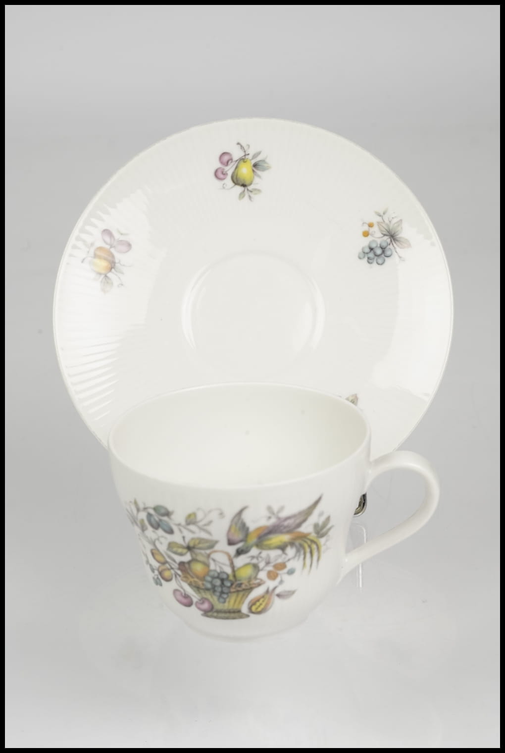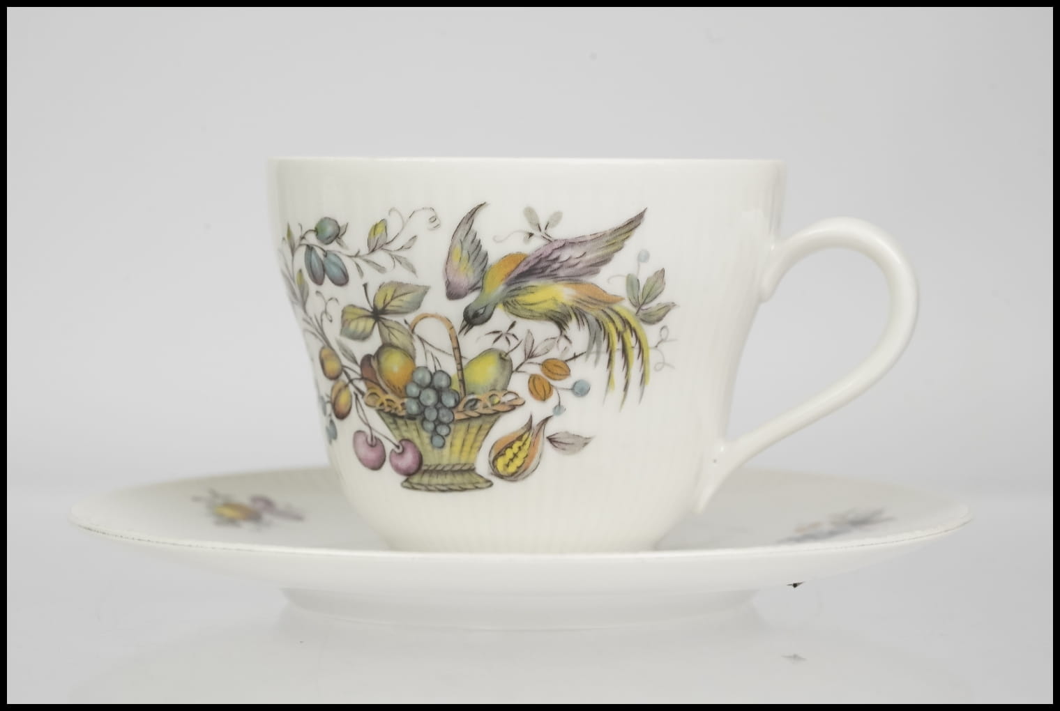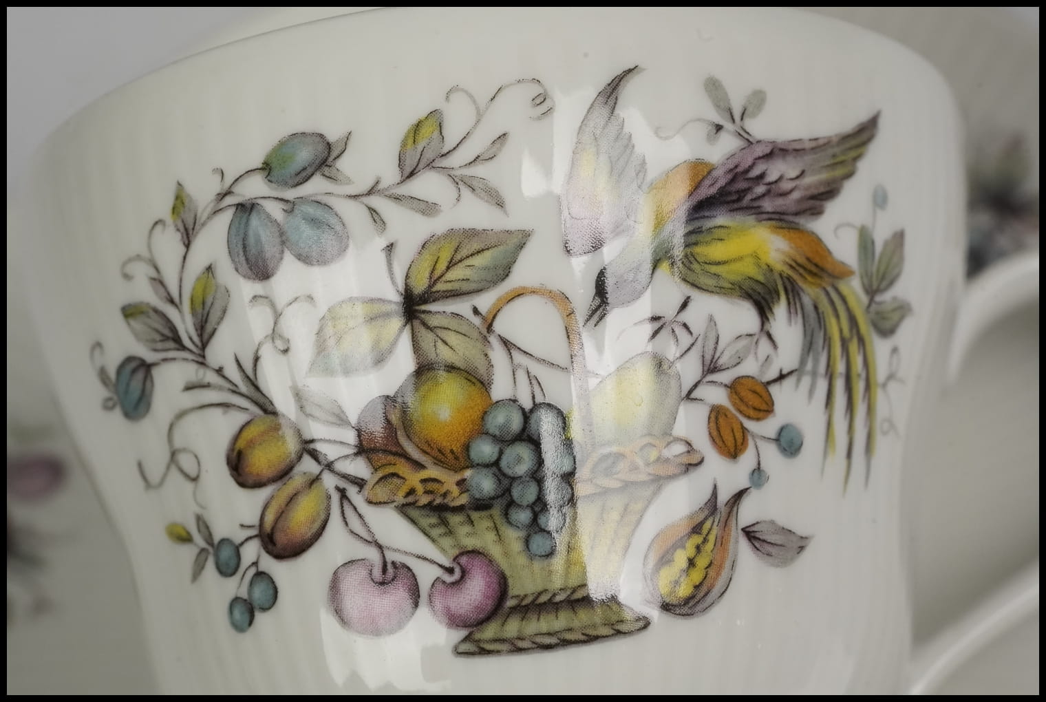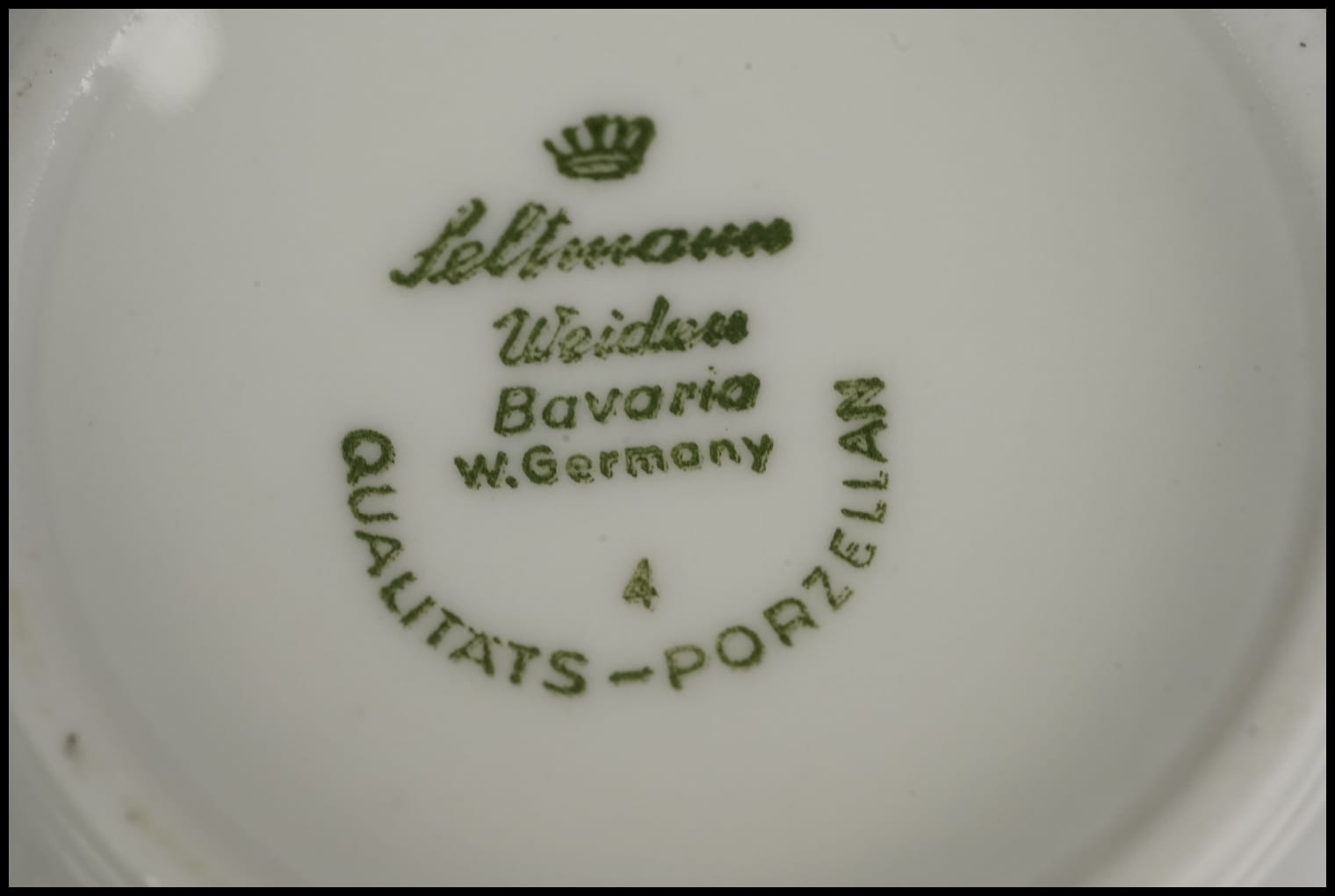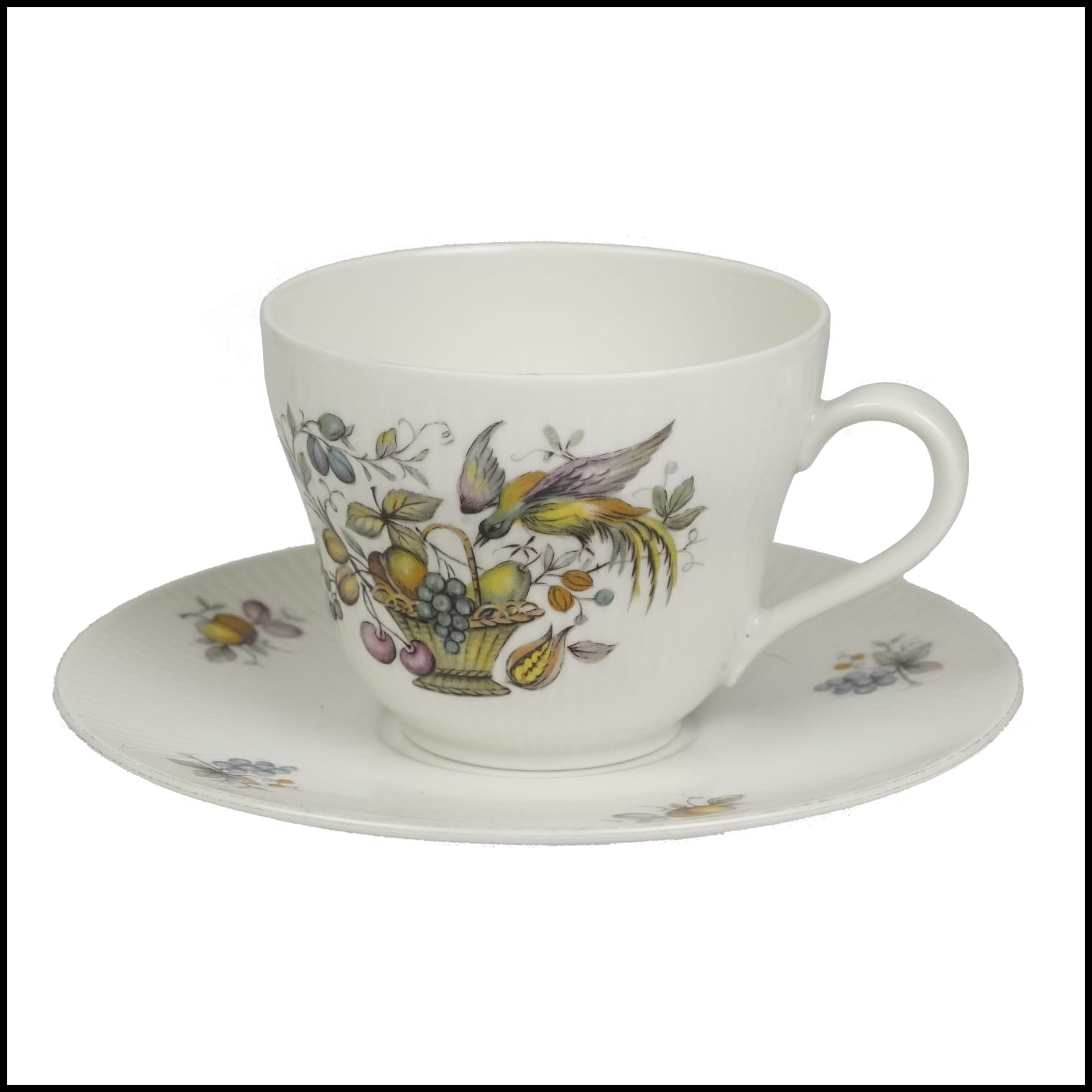 Pochodzi z Bawarii z miejscowości Weiden z Porzellanfabrik Christian Seltmann. Sygnowana znakiem stosowanym od 1949 roku. Fason Friederike. Porcelana biała o eleganckich kształtach z drobnym kanelowaniem. Na filiżance dekoracje przedstawiające rajskie ptaki i kosze owoców. Na spodku drobniejsze owocowe ornamenty.