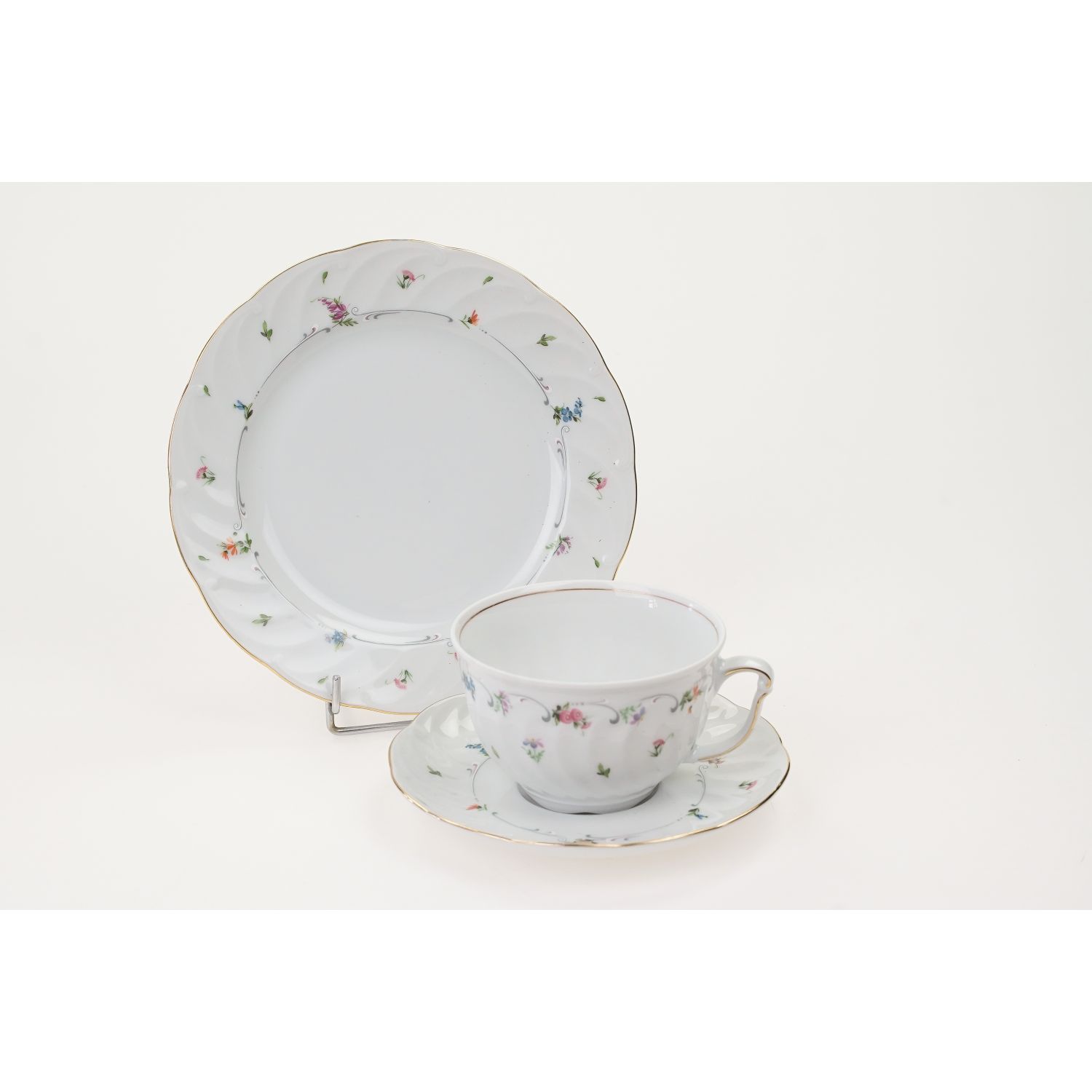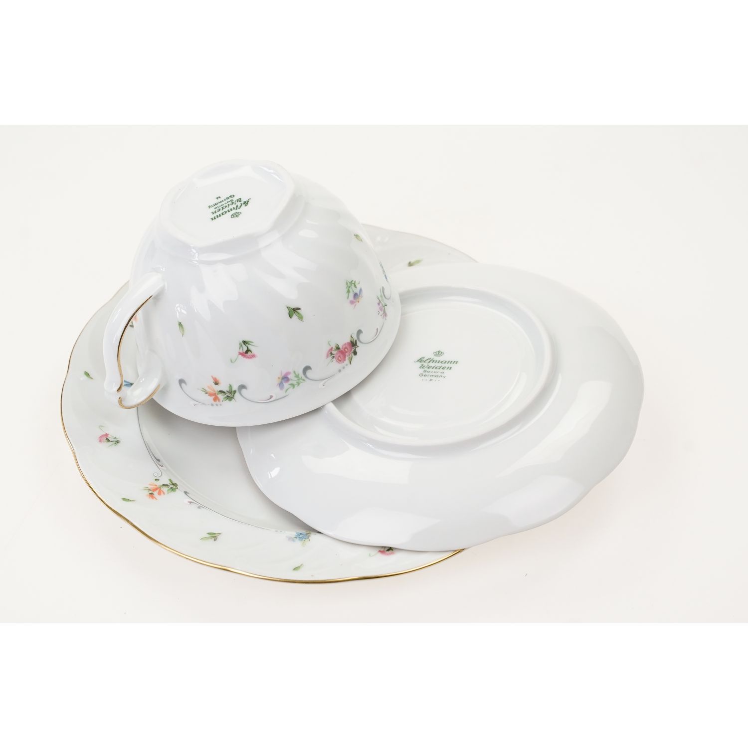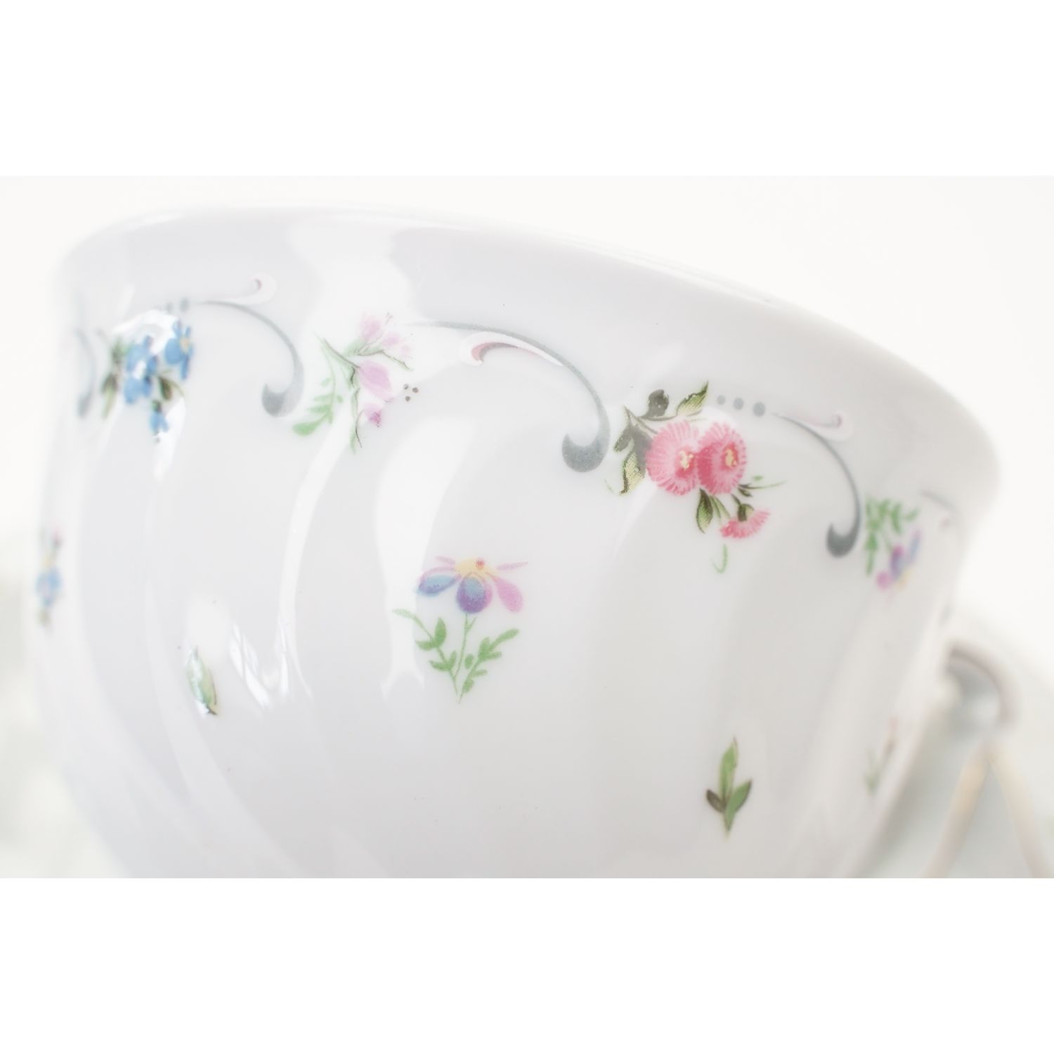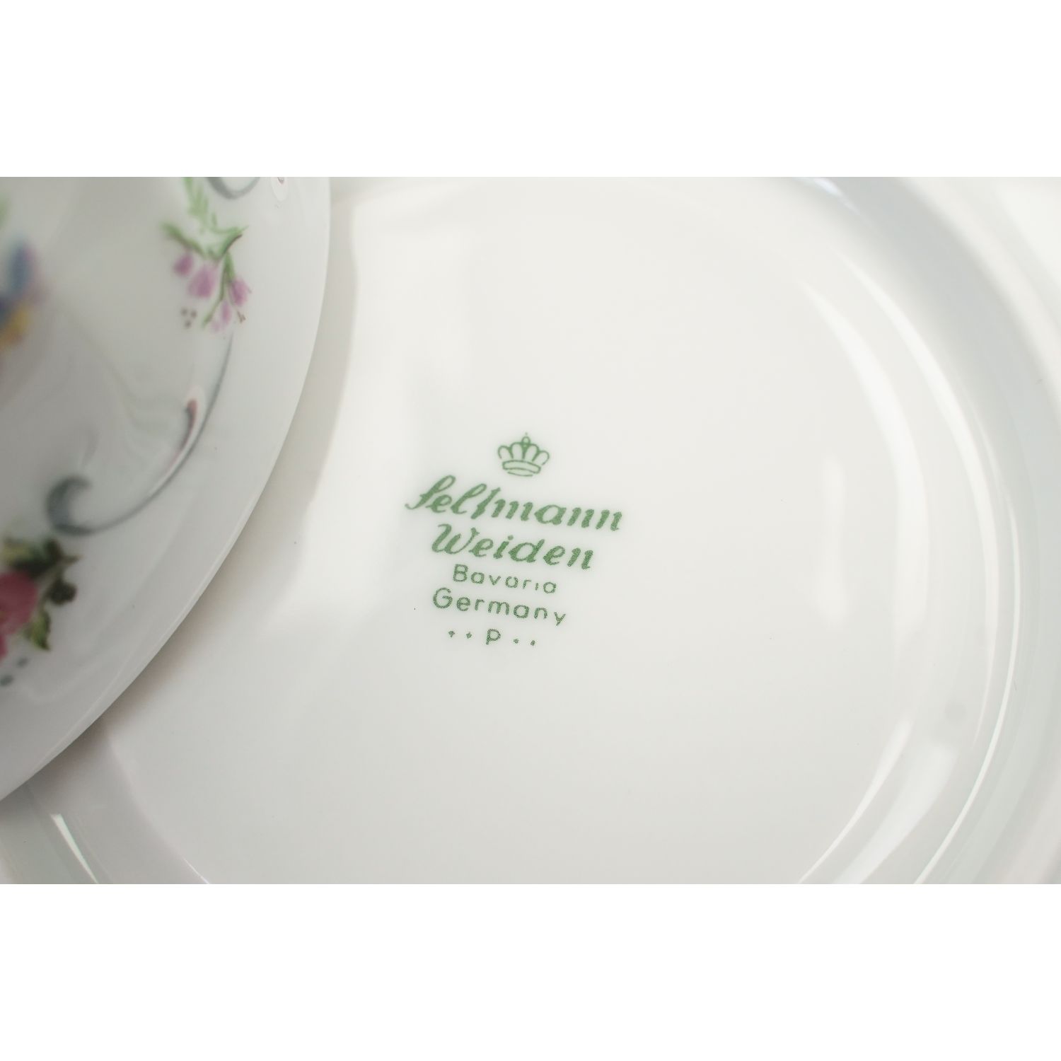 Sygnowana znakiem Porzellanfabrik Christian Seltmann z Weiden stosowanym od 1945 roku. Fason Leonore, dekoracja Elegance. Porcelana biała szkliwiona, żebrowana z obwiedzionymi na złoty kolor konturami. Na porcelanie subtelne kwiatowe wzory.