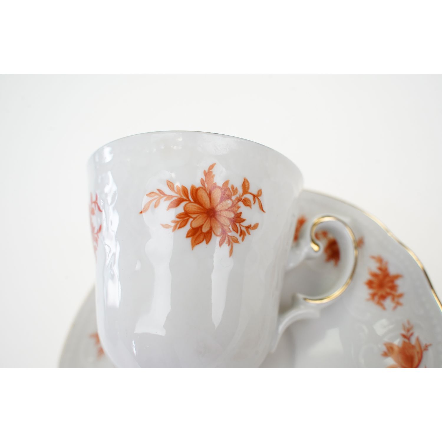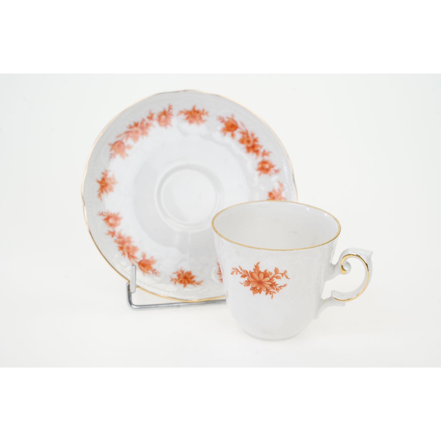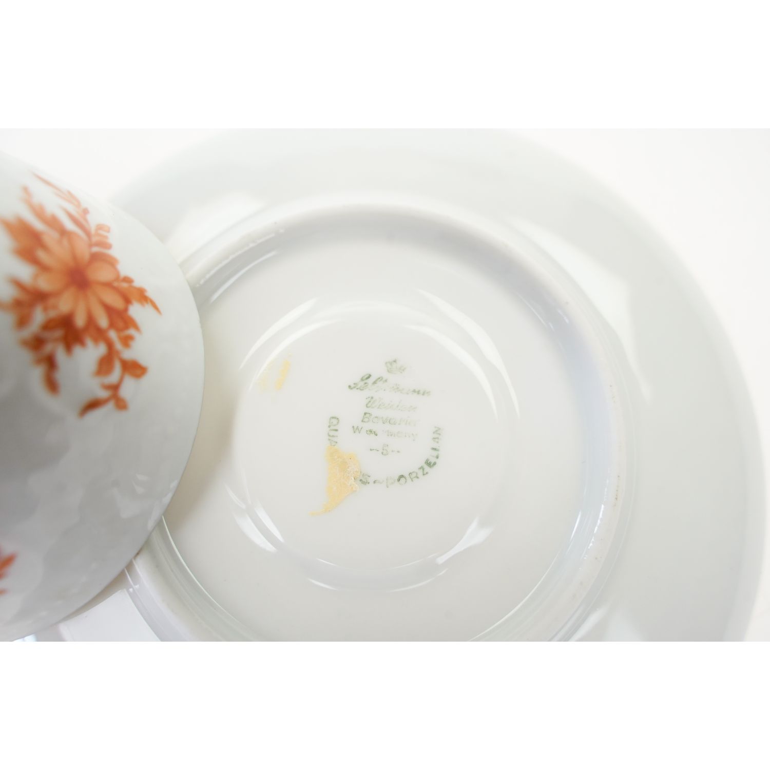 Pochodzi z wytwórni porcelany Porzellanfabrik Christian Seltmann z Weiden. Fason Wien. Sygnowany znakiem stosowanym od 1949 roku. Wykonany jest z dość delikatnej porcelany w kolorze białym, zdobionej cudownymi reliefami w stylu rokokowym z perlaturą przy krawędziach. Kontury i uszko w subtelnym złoceniu. Na porcelanie pomarańczowe bukiety kwiatów. Wygląda bardzo elegancko!