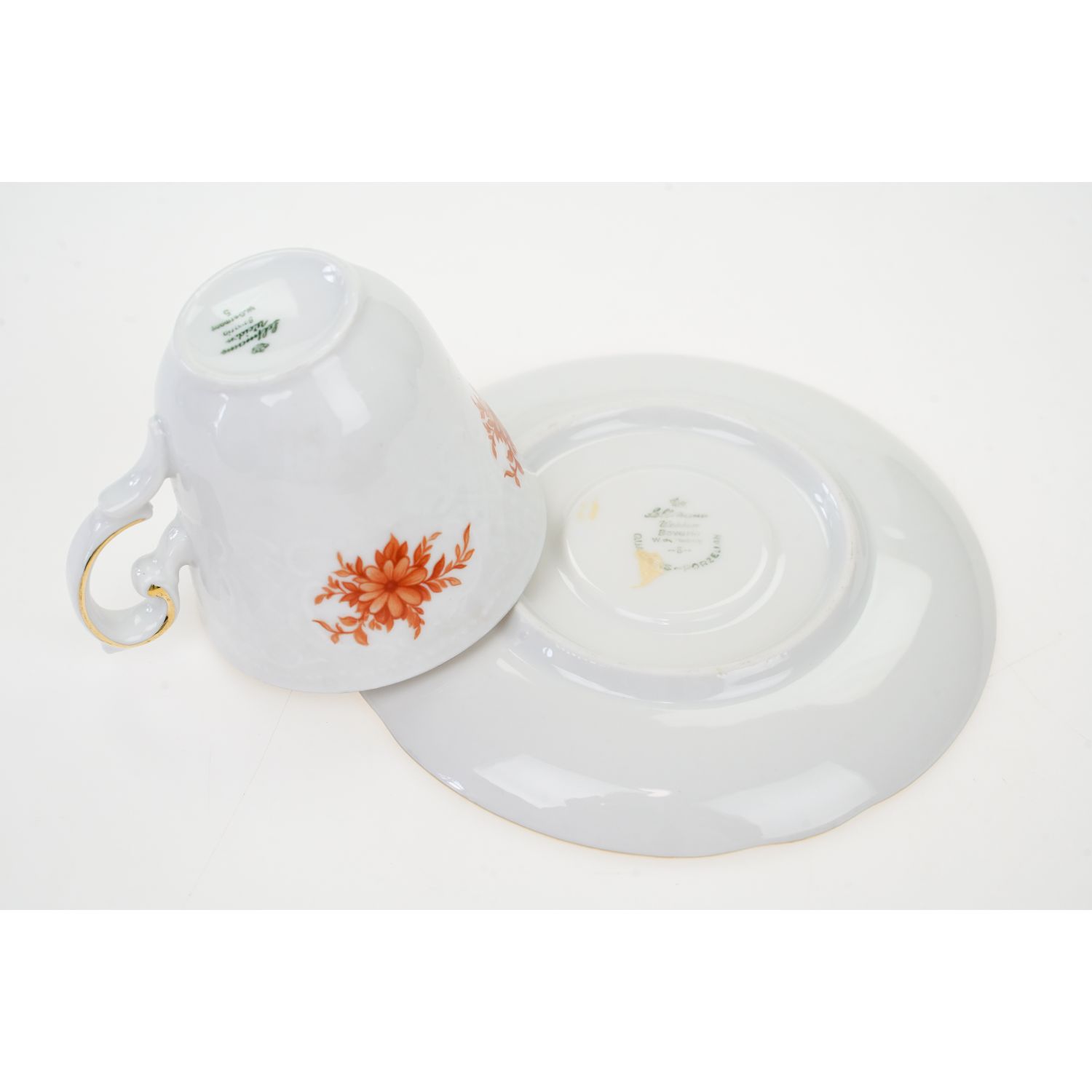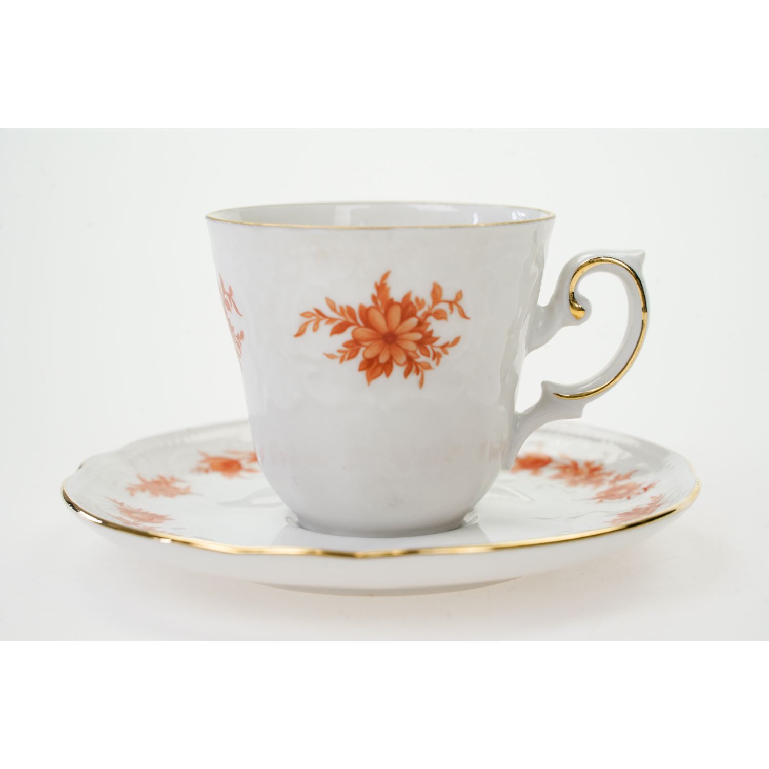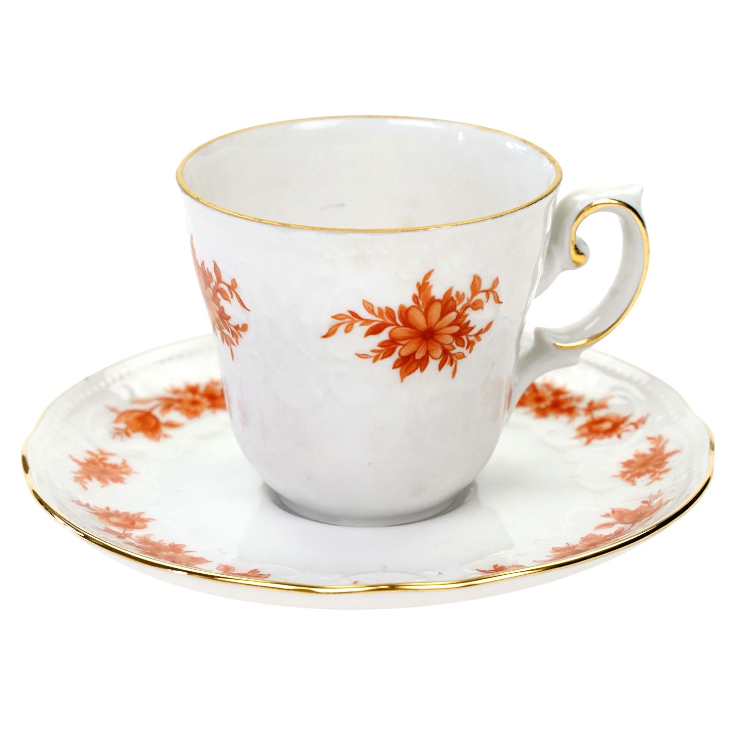 Pochodzi z wytwórni porcelany Porzellanfabrik Christian Seltmann z Weiden. Fason Wien. Sygnowany znakiem stosowanym od 1949 roku. Wykonany jest z dość delikatnej porcelany w kolorze białym, zdobionej cudownymi reliefami w stylu rokokowym z perlaturą przy krawędziach. Kontury i uszko w subtelnym złoceniu. Na porcelanie pomarańczowe bukiety kwiatów. Wygląda bardzo elegancko!